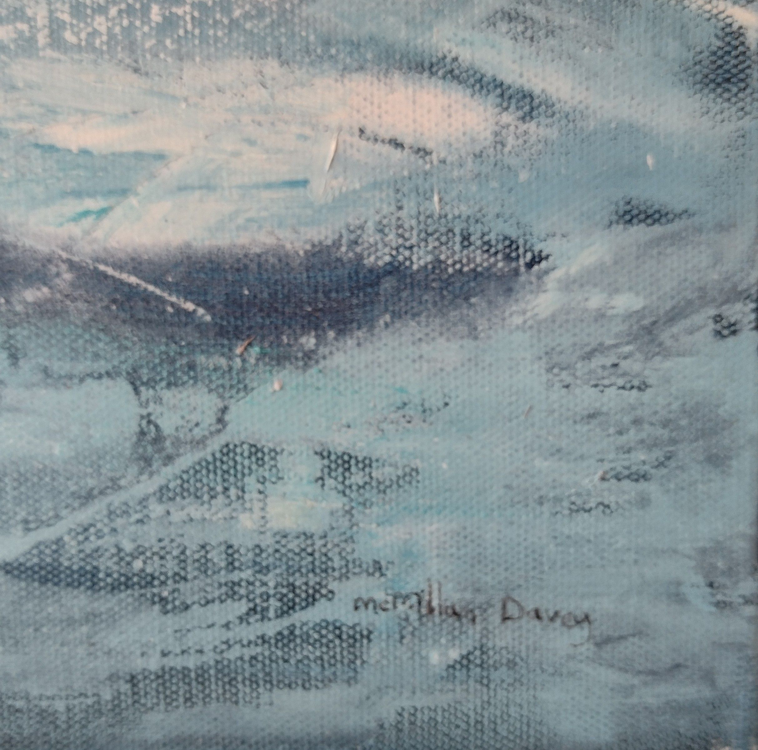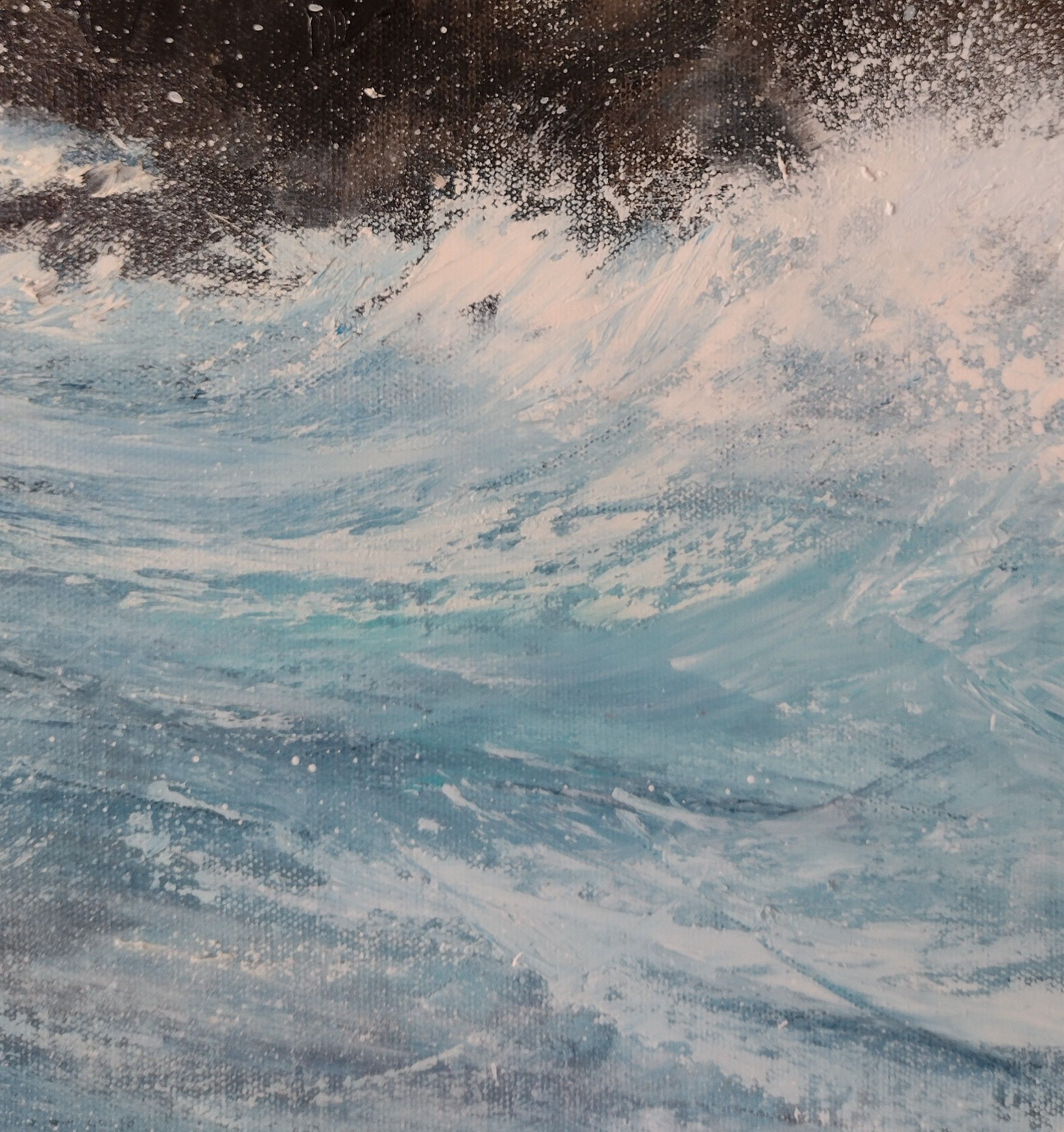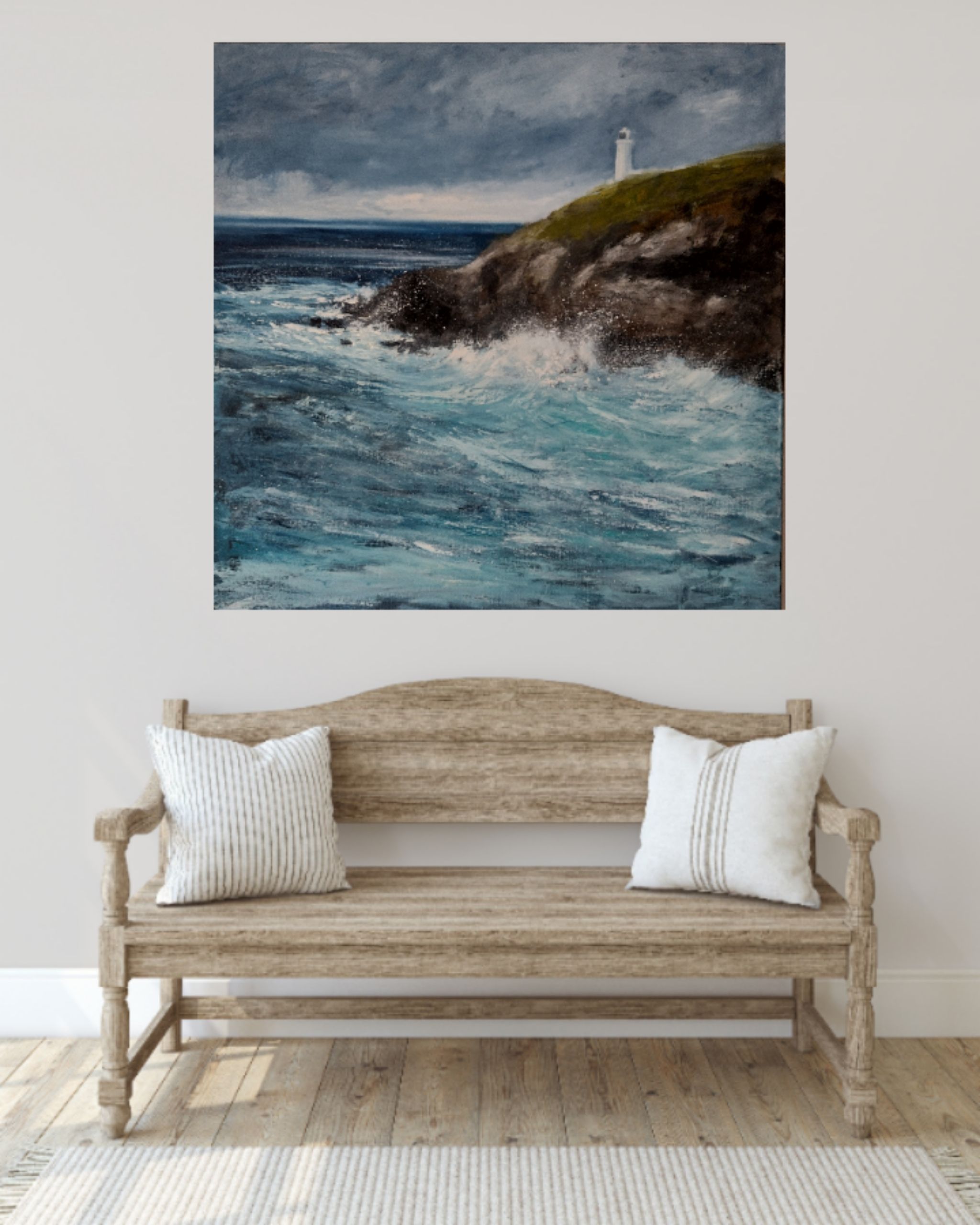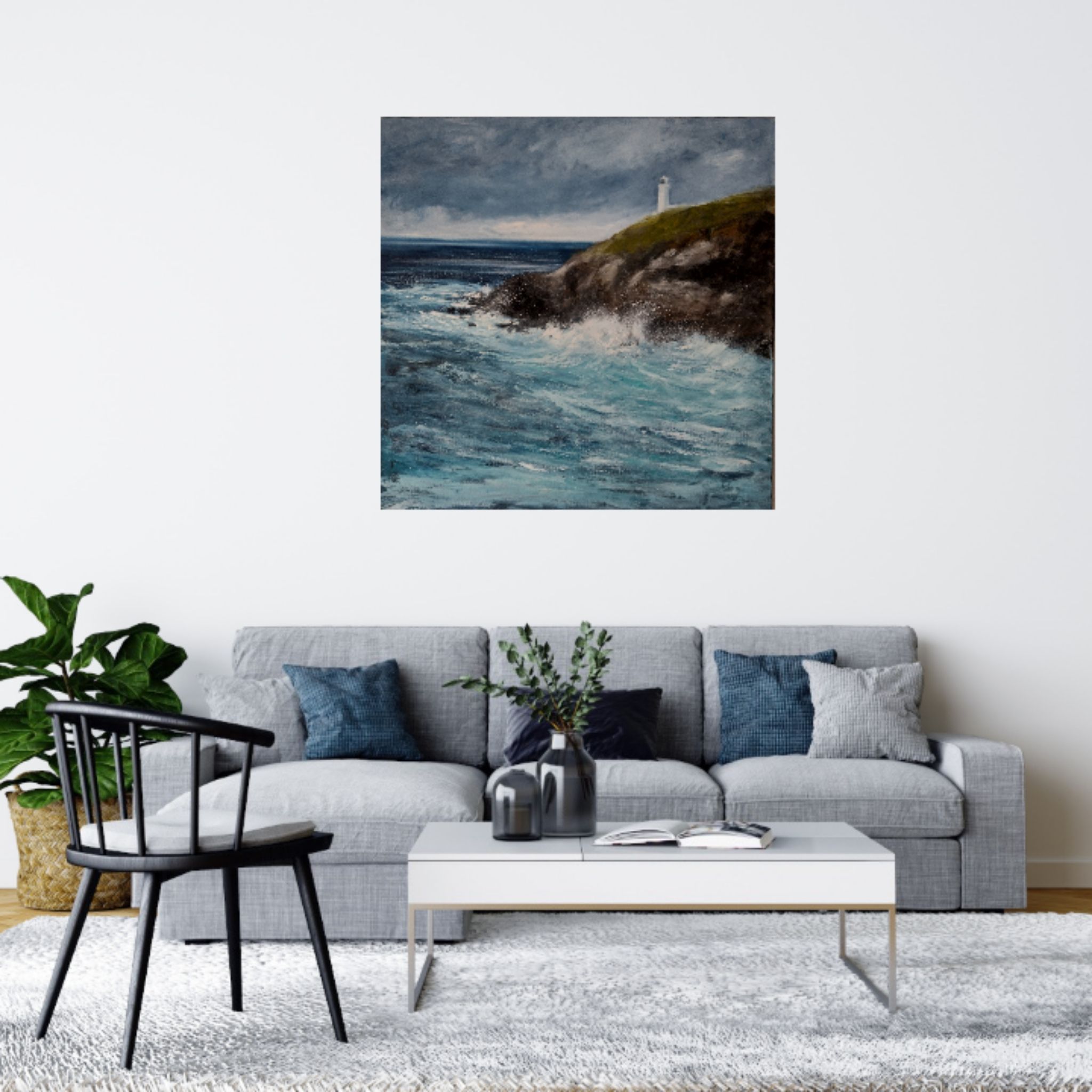 The beauty and drama of the lighthouse at Trevose head standing out against the stormy sky . An energetic piece of artwork with many layers of paint , blues, greens, Grey's , Turquoise, giving depth and interest to this statement artwork.
