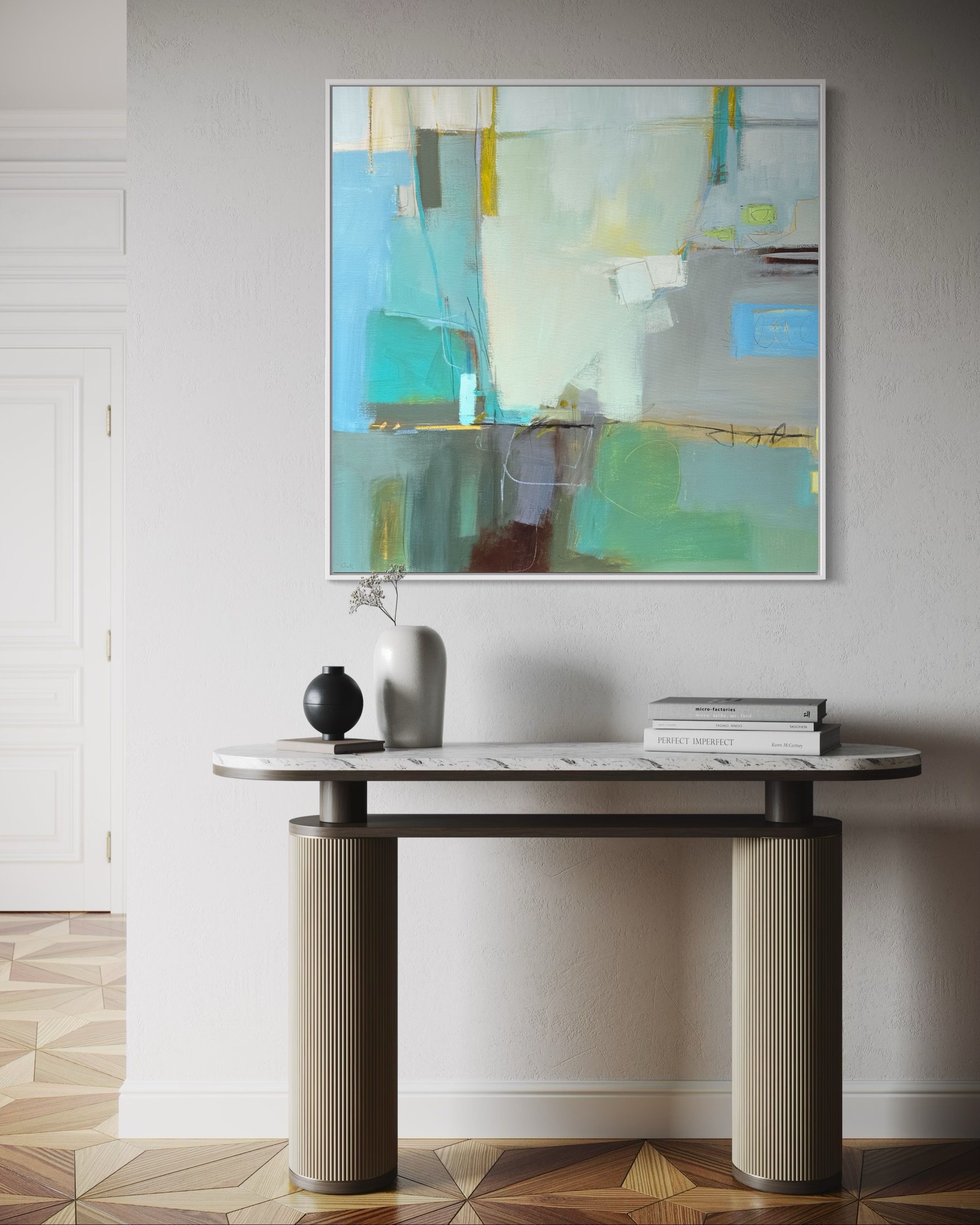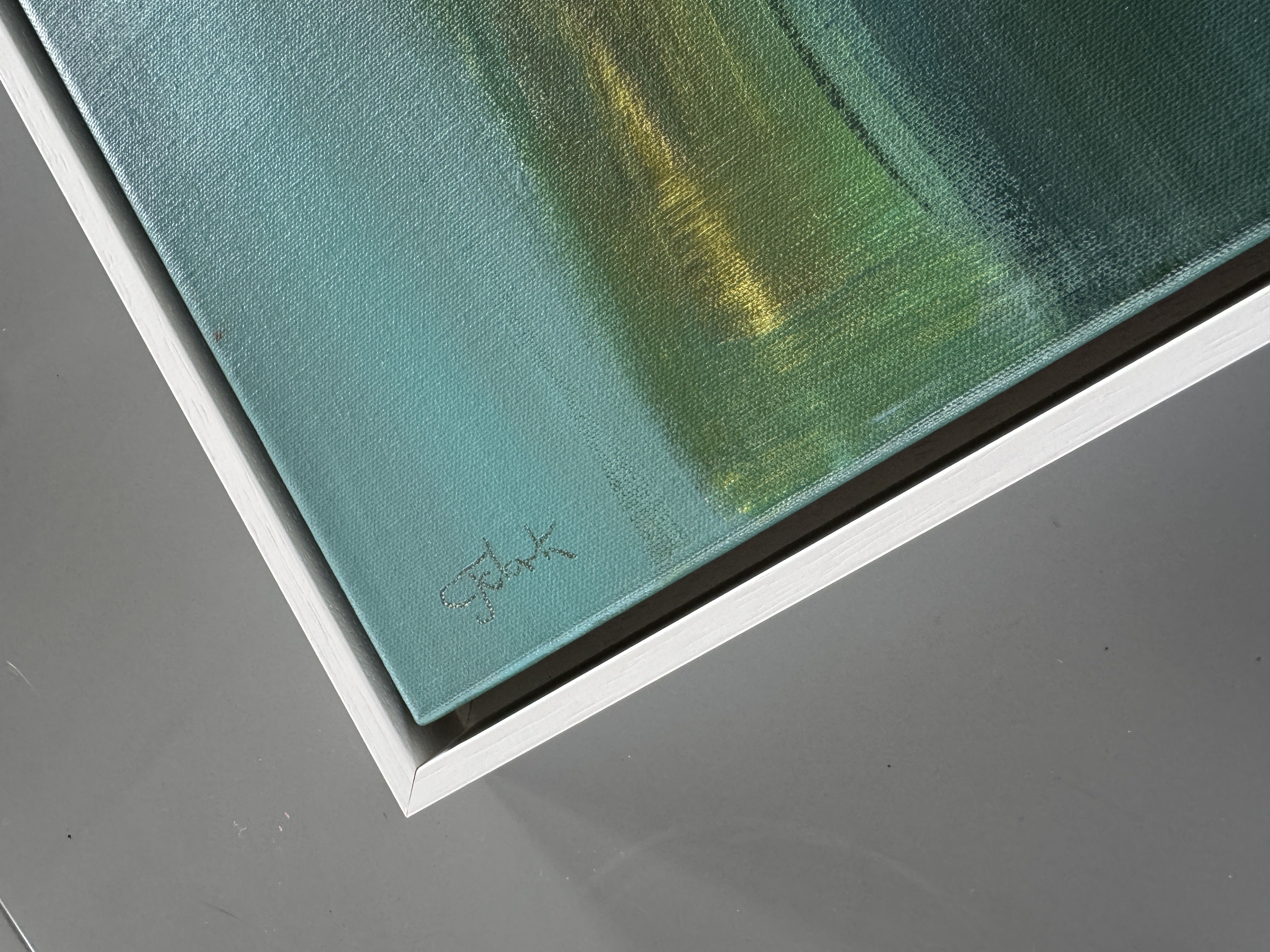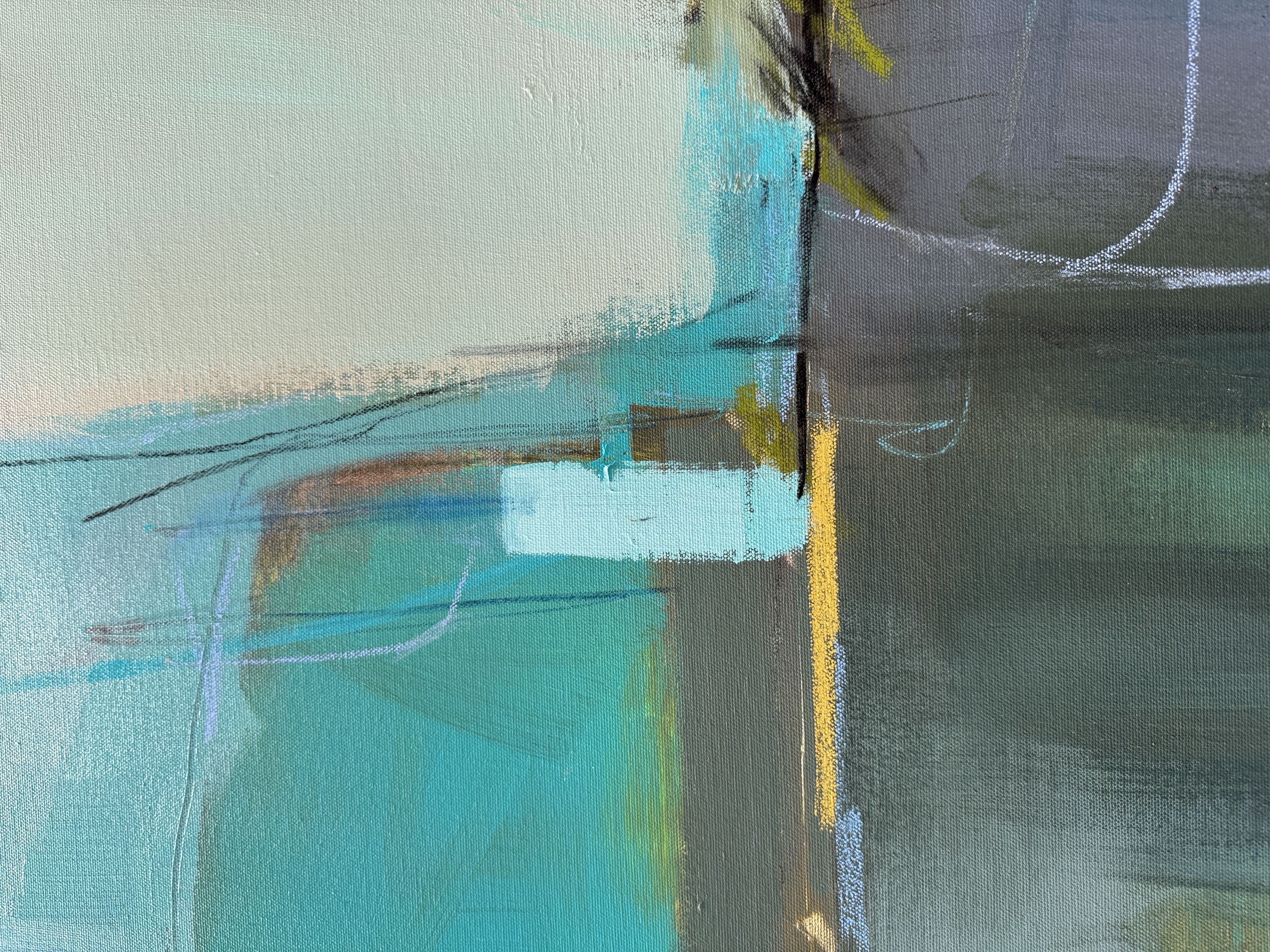 The UK has some of the most beautiful stretches of water and this painting using acrylic, ink, charcoal and pencils takes inspiration from the junction between the green of the fields and trees and where they greet the water whether that is river lake or sea.