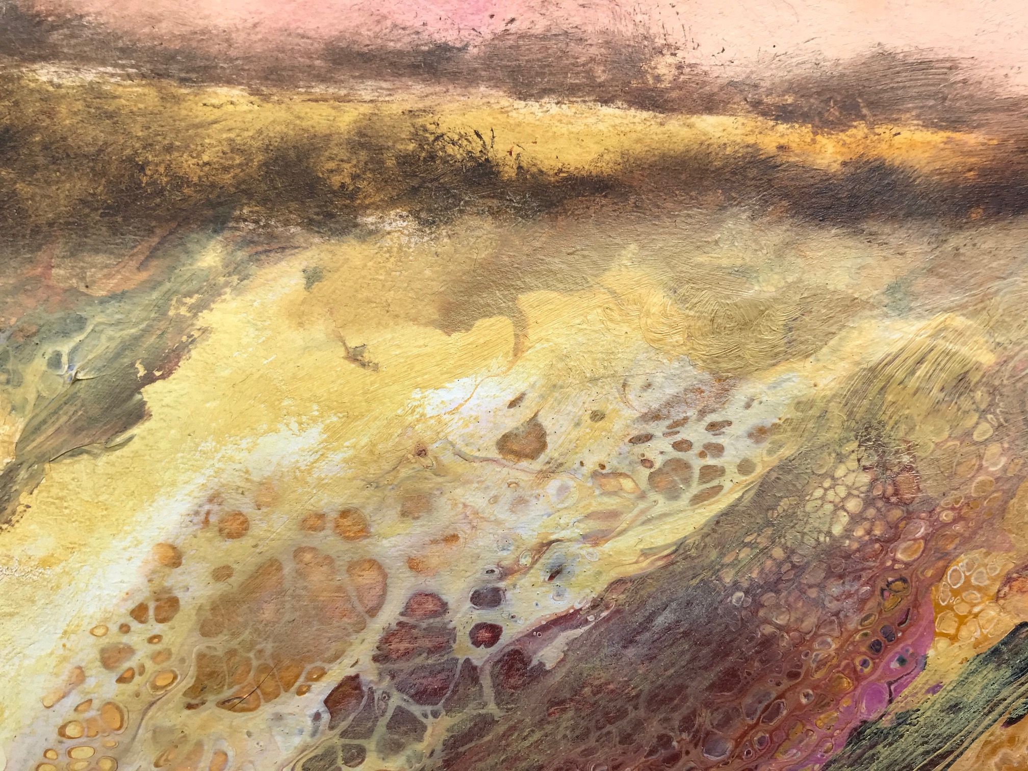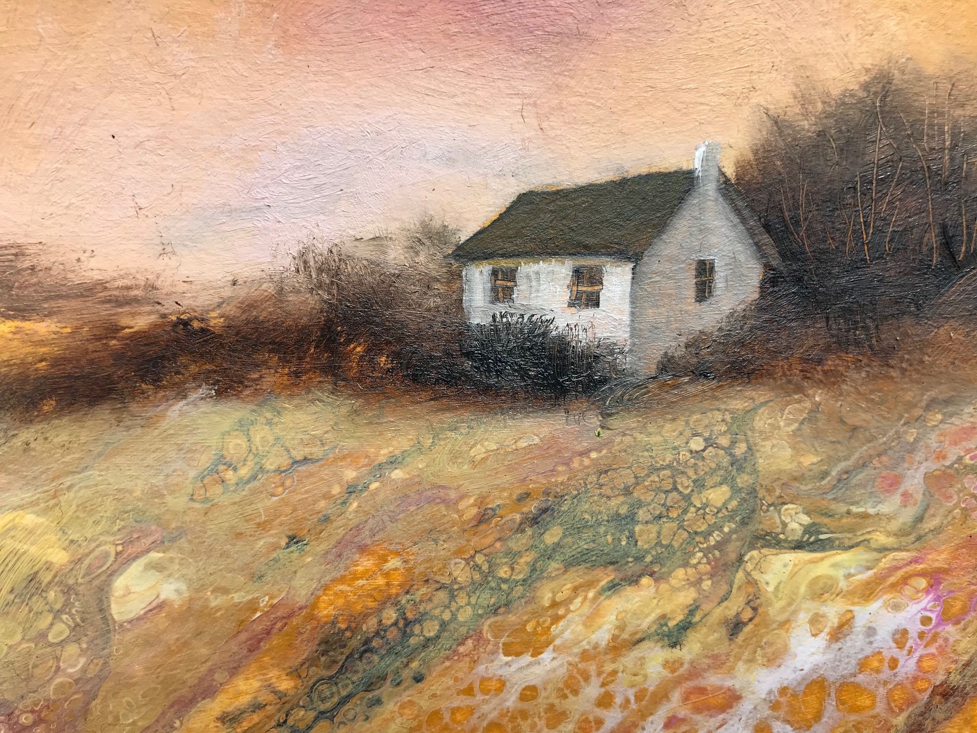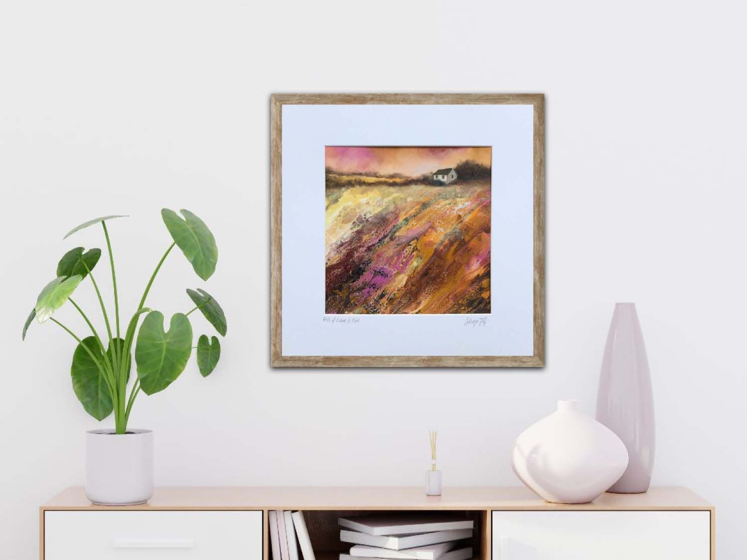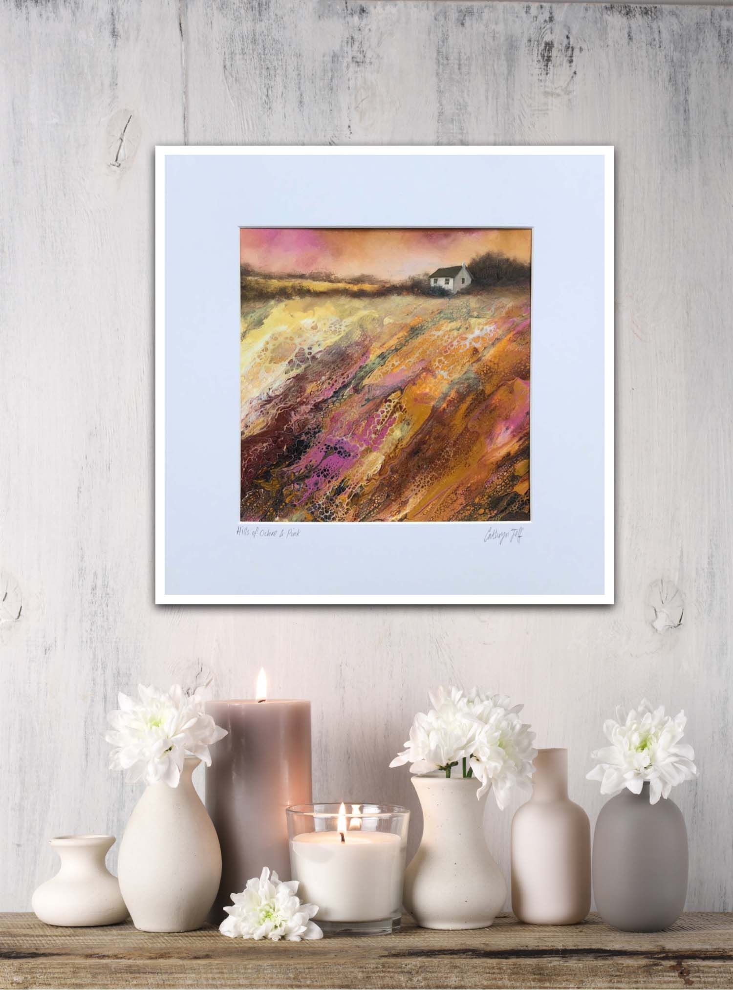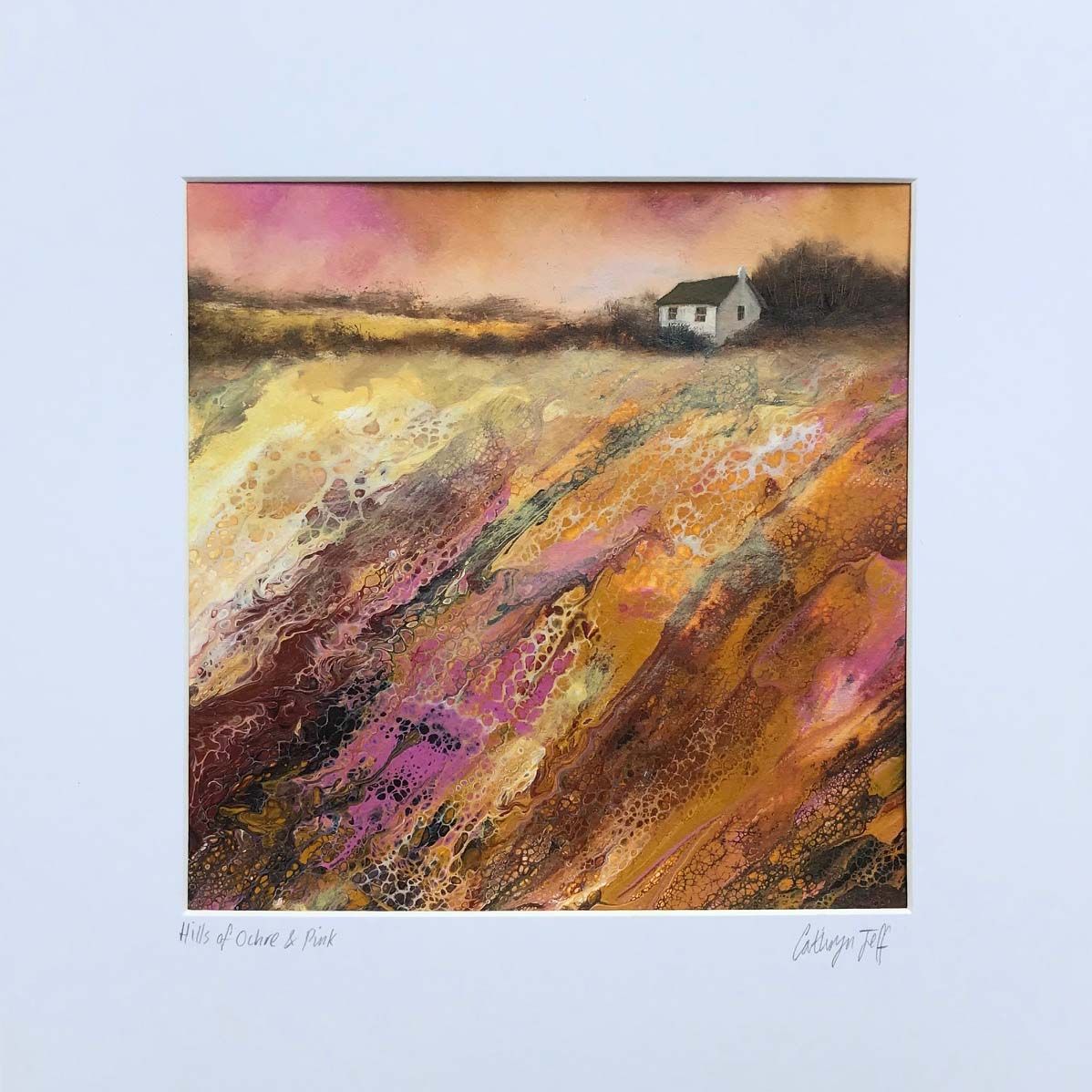 Hills of Ochre & Pink is an original landscape painting inspired by many Oxfordshire countryside walks where the artist lives. The dripped paint adds interesting marks where colours meet and flow on top of one another. A stylised house creates a focal point to the composition while the hedgerows and