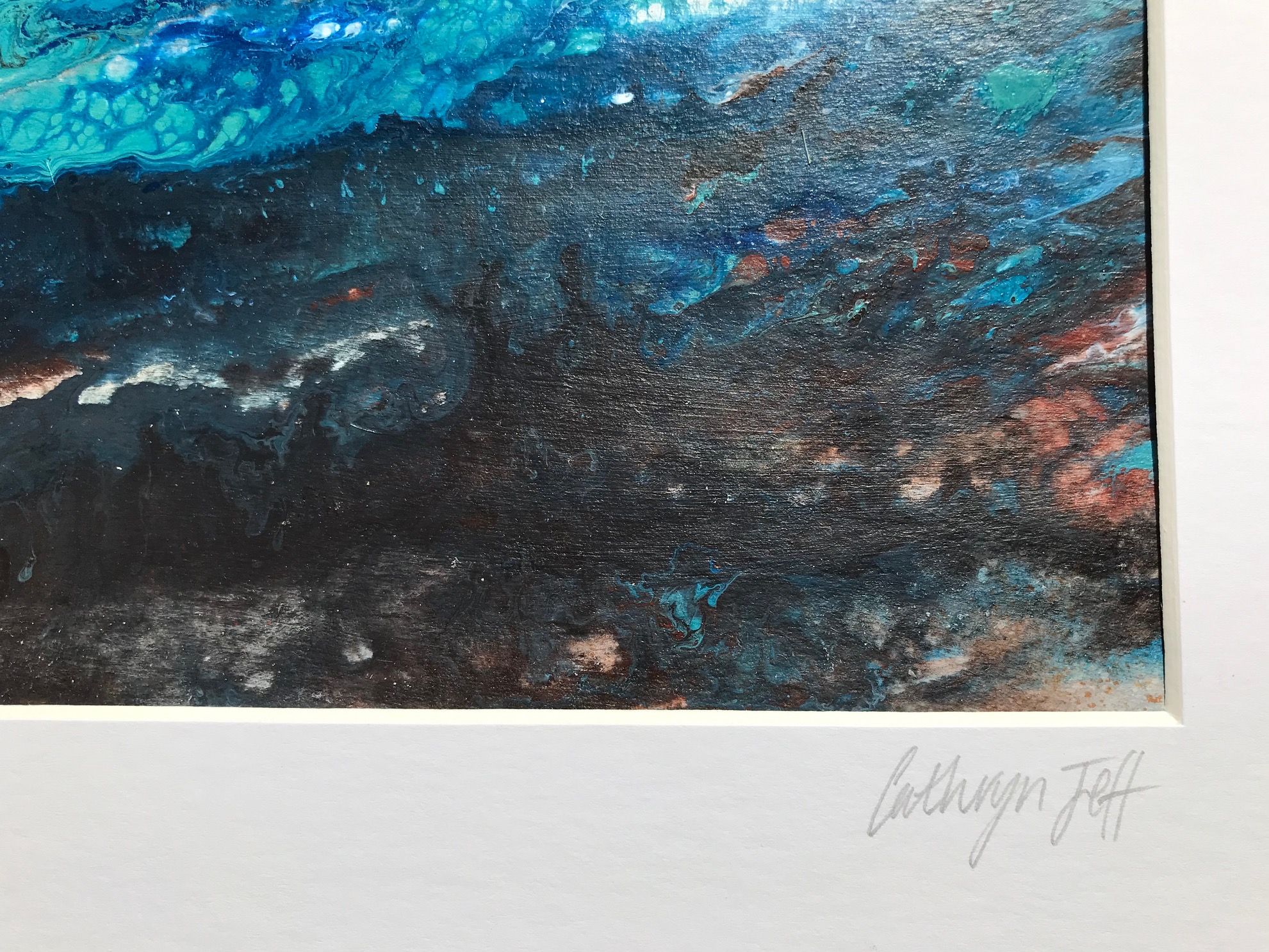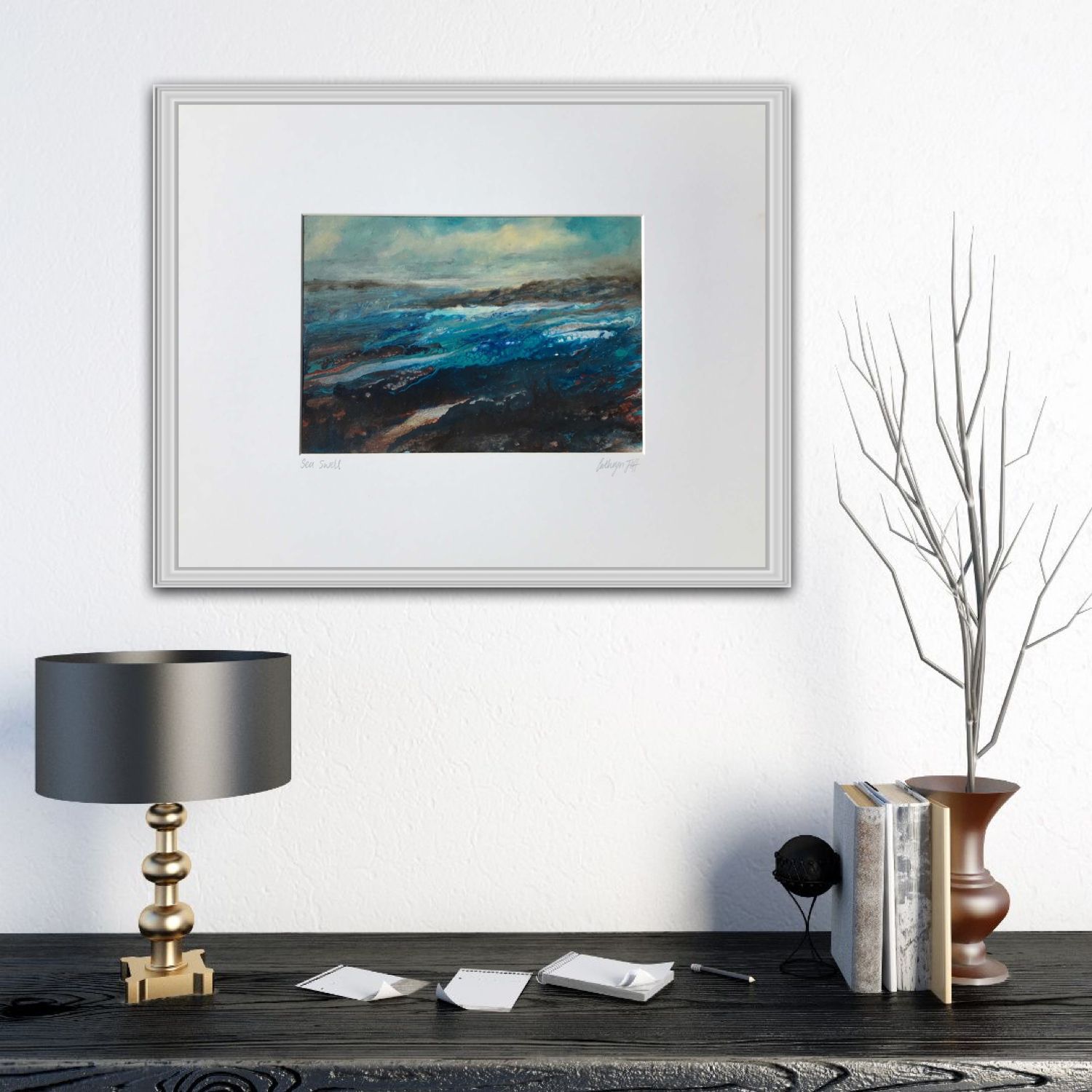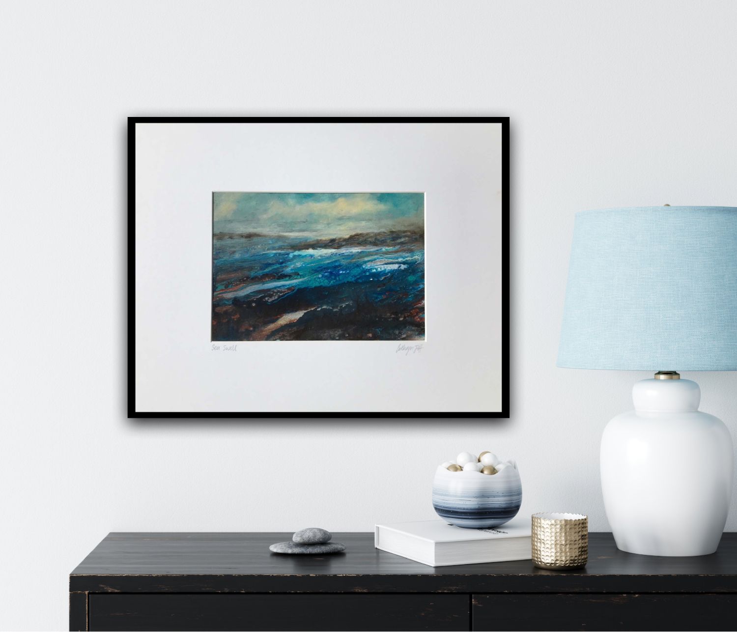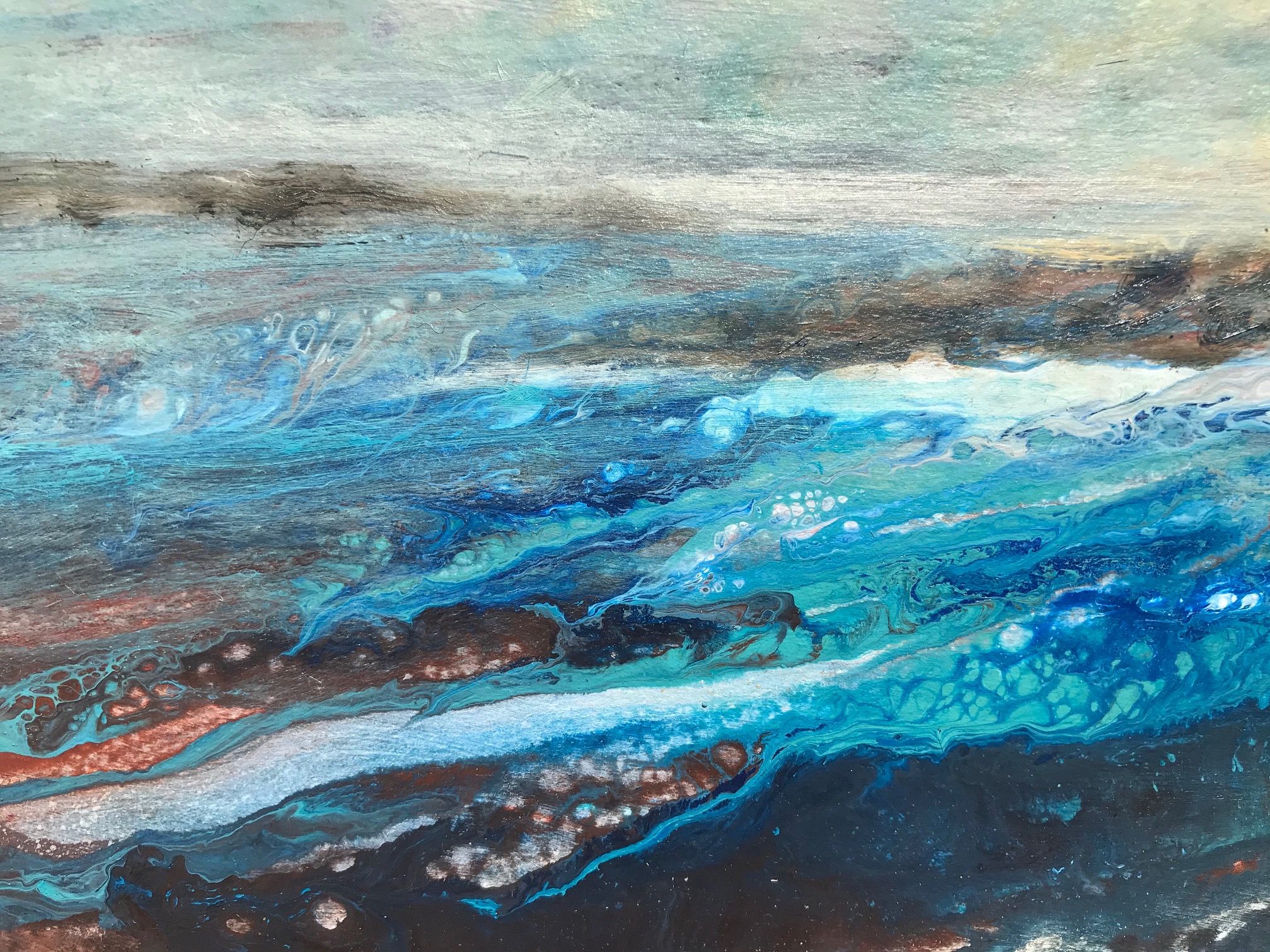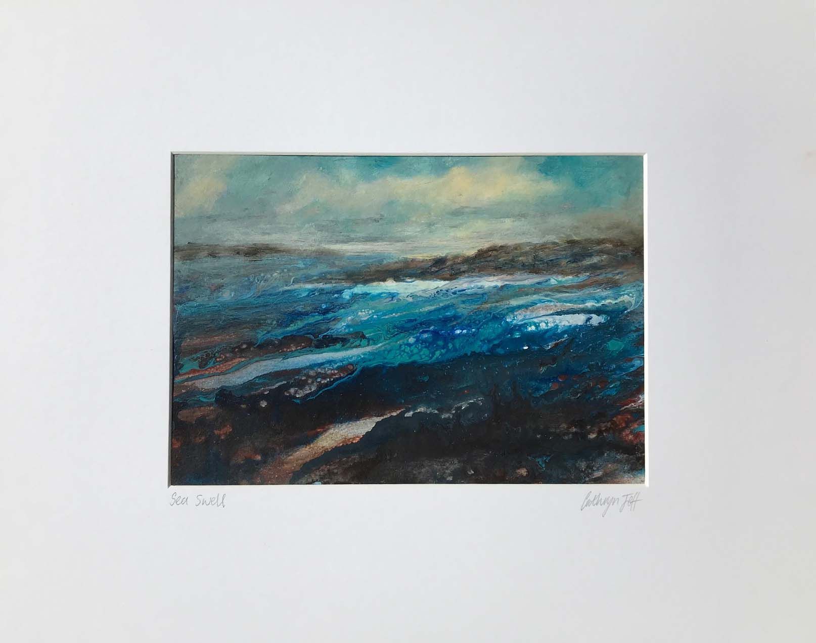 Sea Swell is an atmospheric original seascape painting and was created using dripped paint that was tilted to run along the board. The artist let colours mingle and merge to represent the movement and swell of sea water amongst rocks as the tide moves in and out. Influenced by many