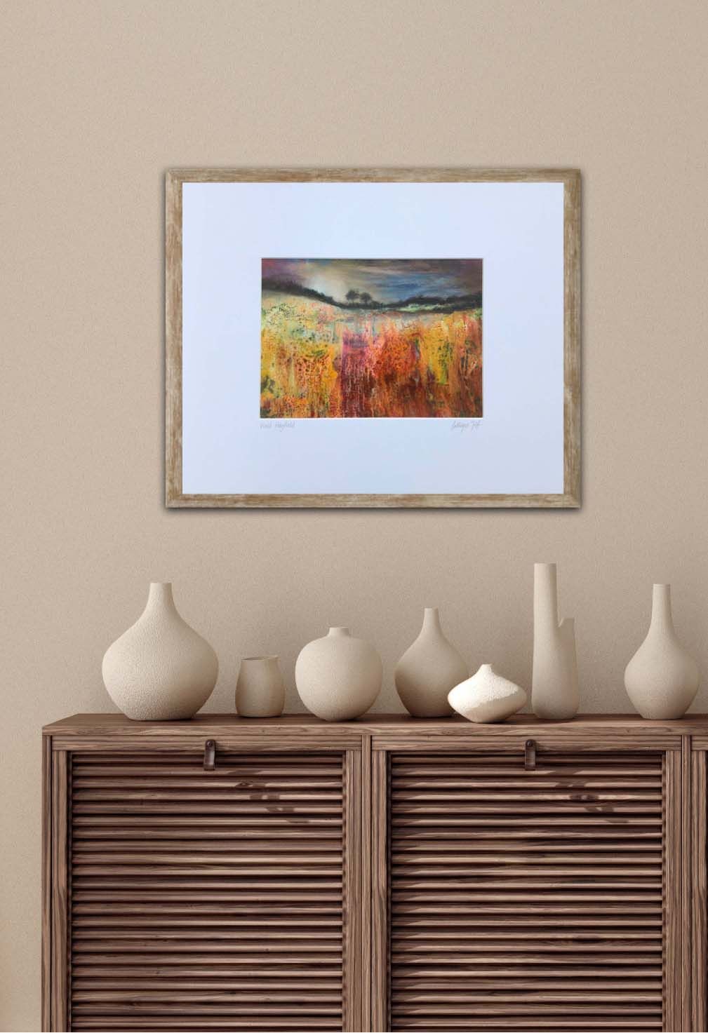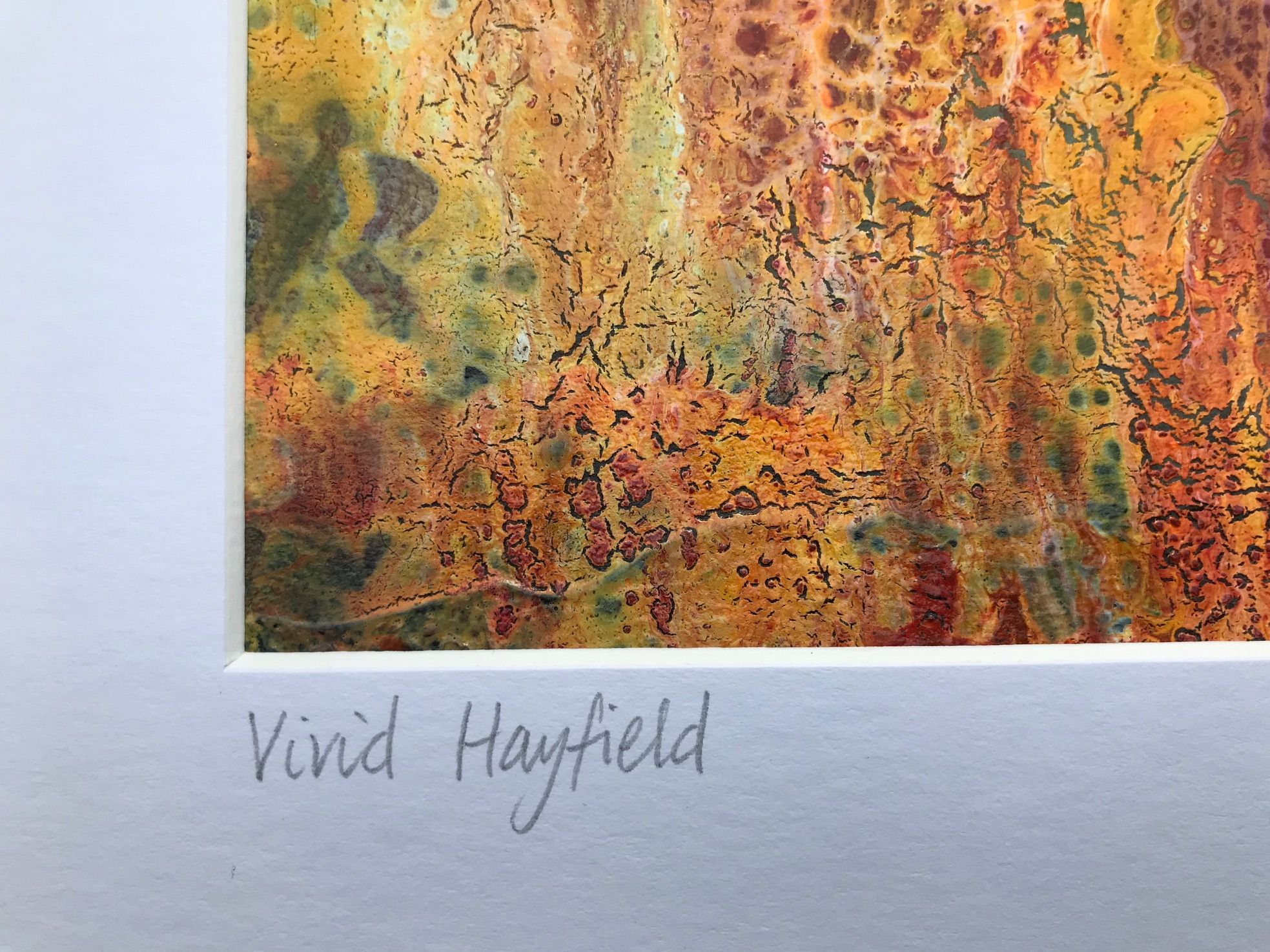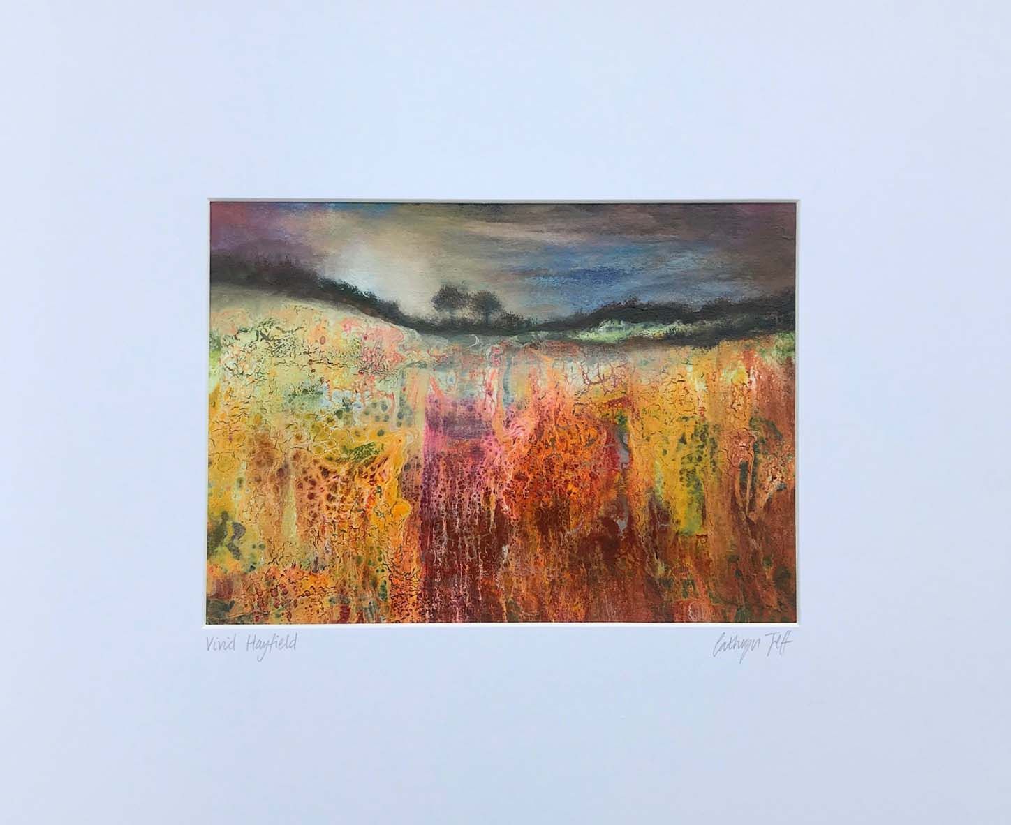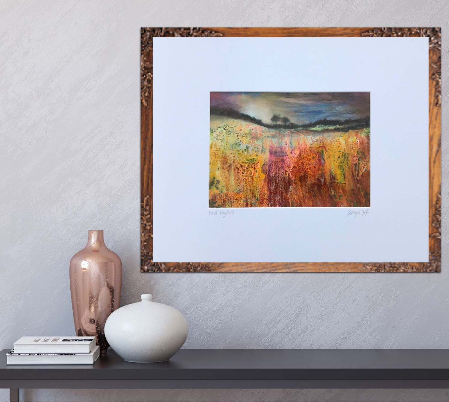 Vivid Hayfield is an original painting of a striking landscape scene using bright, vibrant colours that take centre stage. The composition is kept simple to allow the serendipitous fluid marks to shine. The artist regularly takes walks in the Oxfordshire countryside near where she lives and is inspired by the
