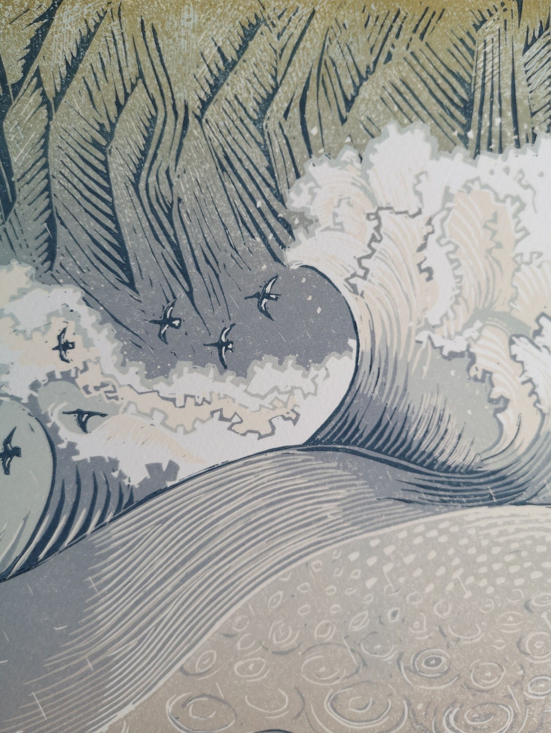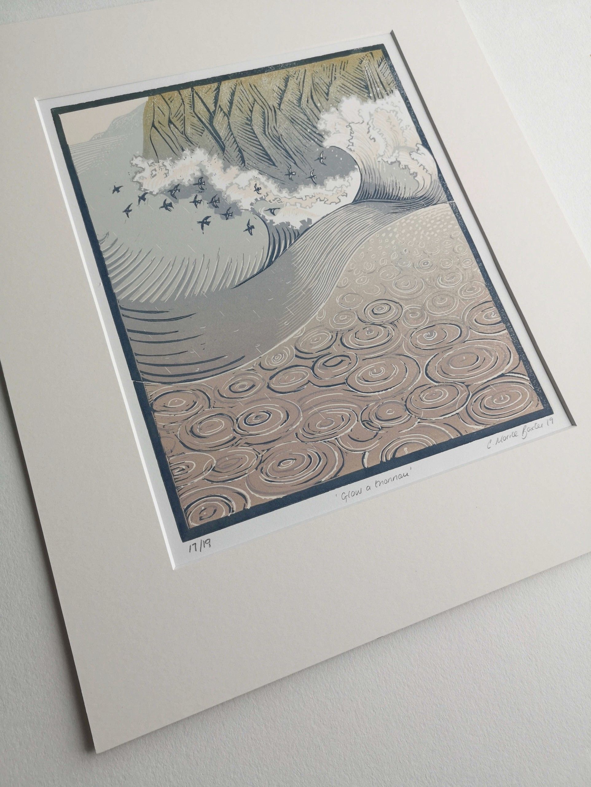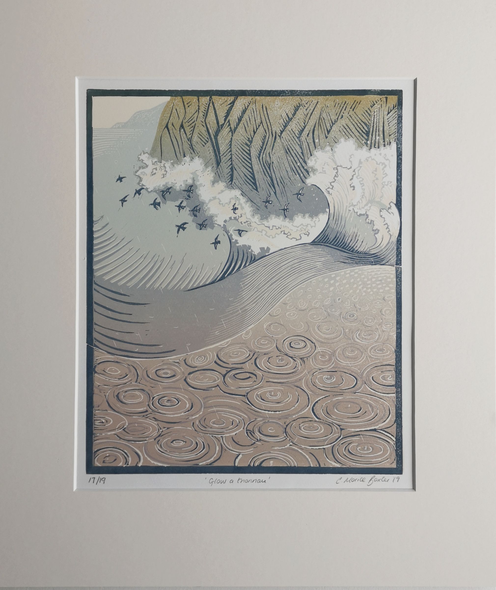Glaw a Thonnau is Welsh for Rain and Waves and is a reduction lino cut inspired by the energy and movement of the waves experienced from the out to sea as they crash towards the cliffs. A flock of Oystercatchers fly between the breaking waves and the rain falls heavily