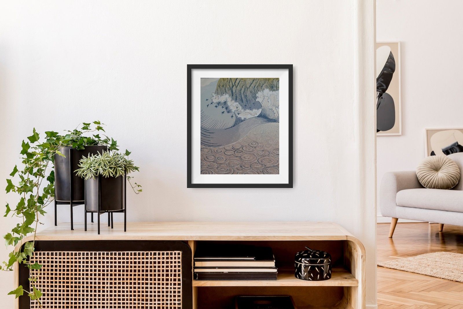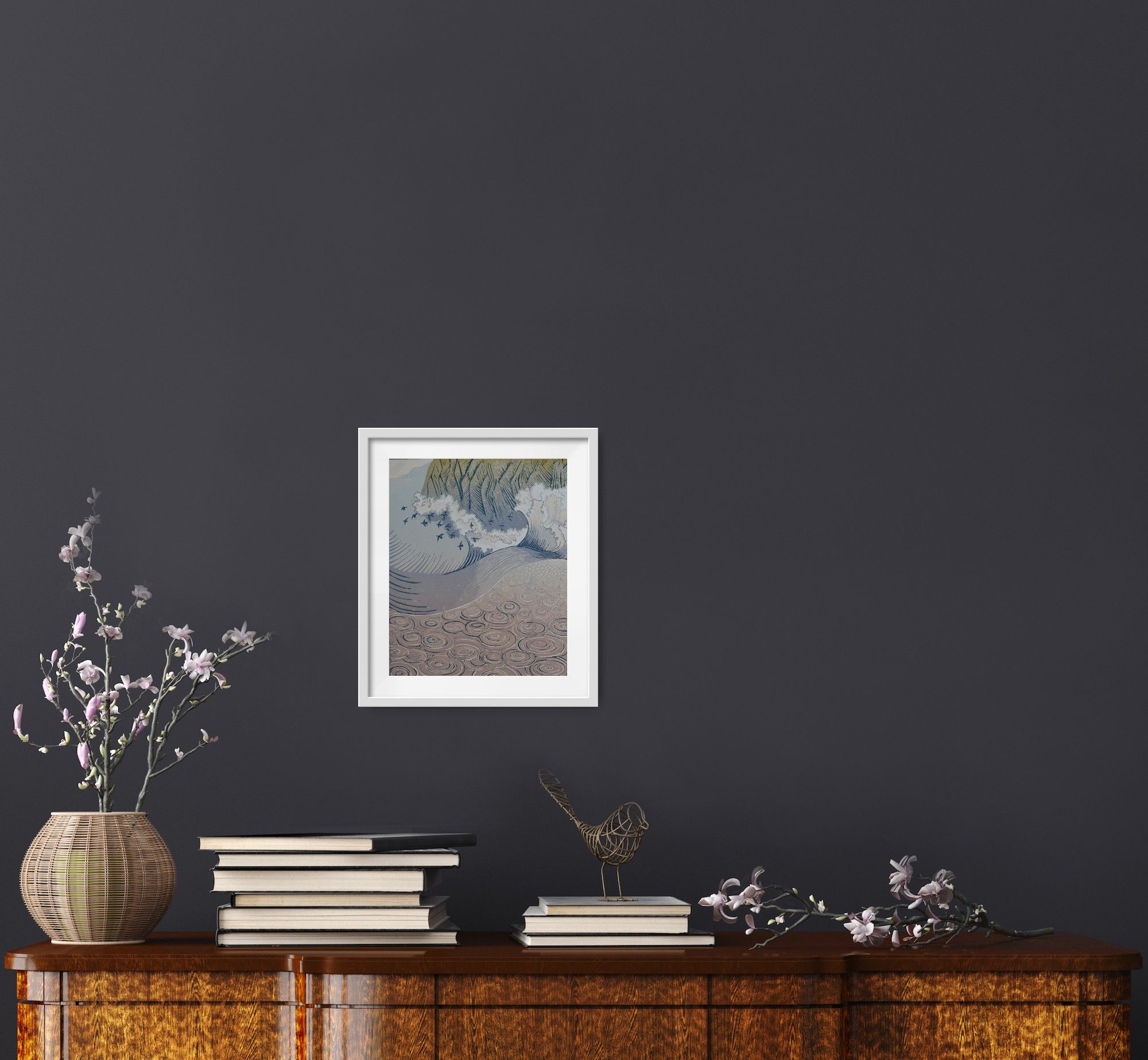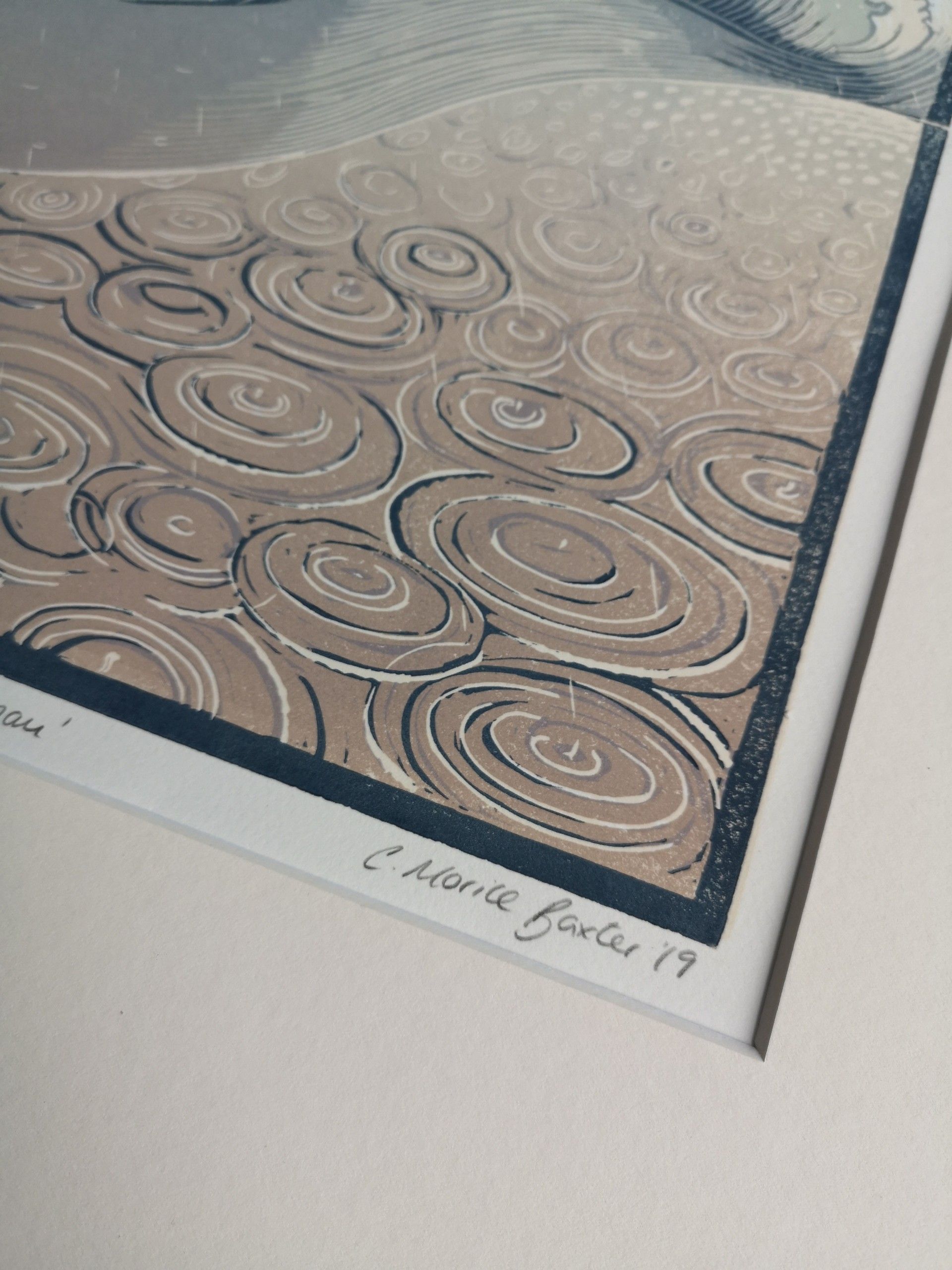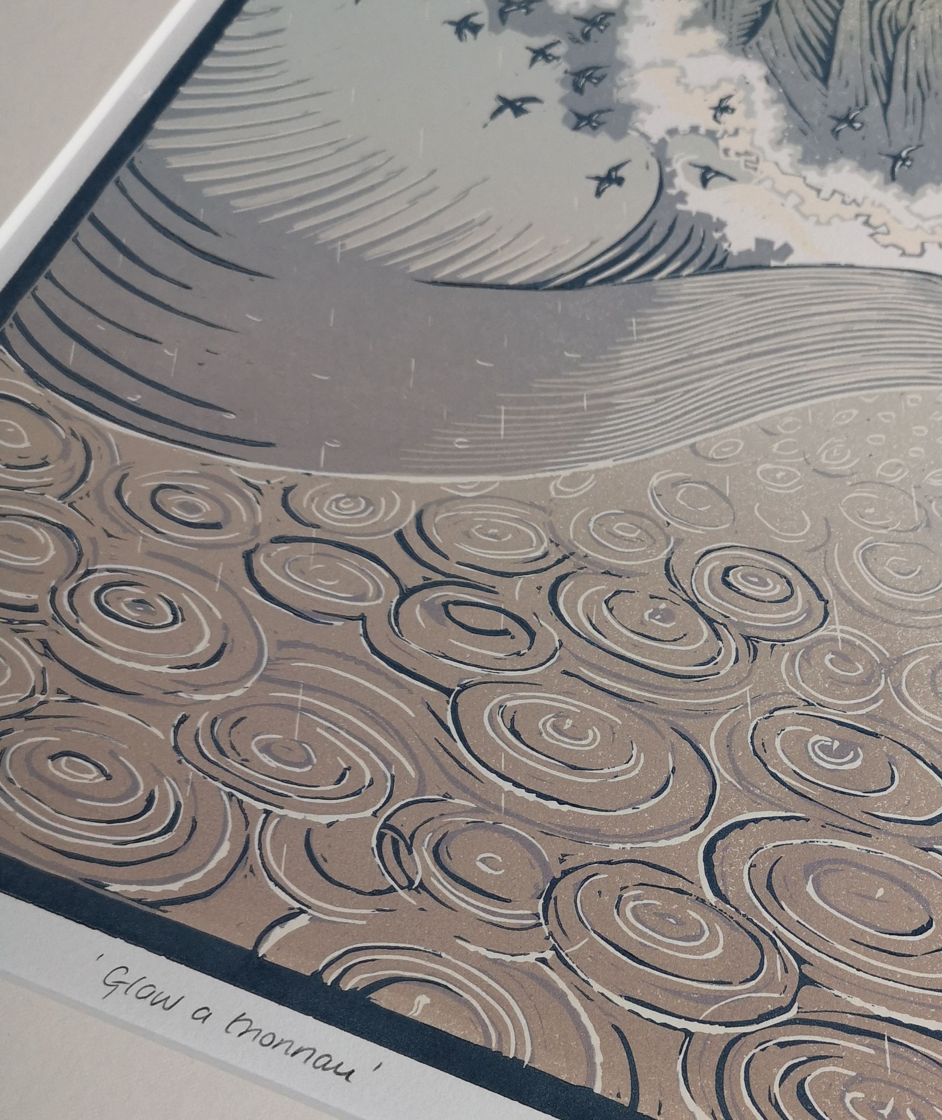 Glaw a Thonnau is Welsh for Rain and Waves and is a reduction lino cut inspired by the energy and movement of the waves experienced from the out to sea as they crash towards the cliffs. A flock of Oystercatchers fly between the breaking waves and the rain falls heavily