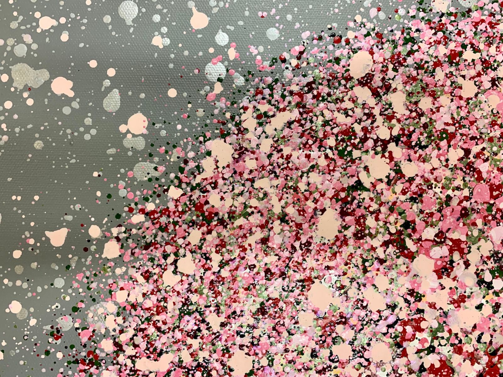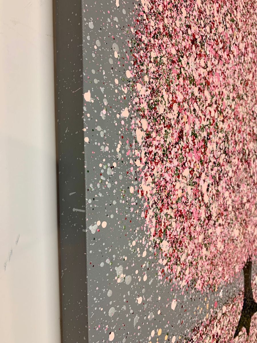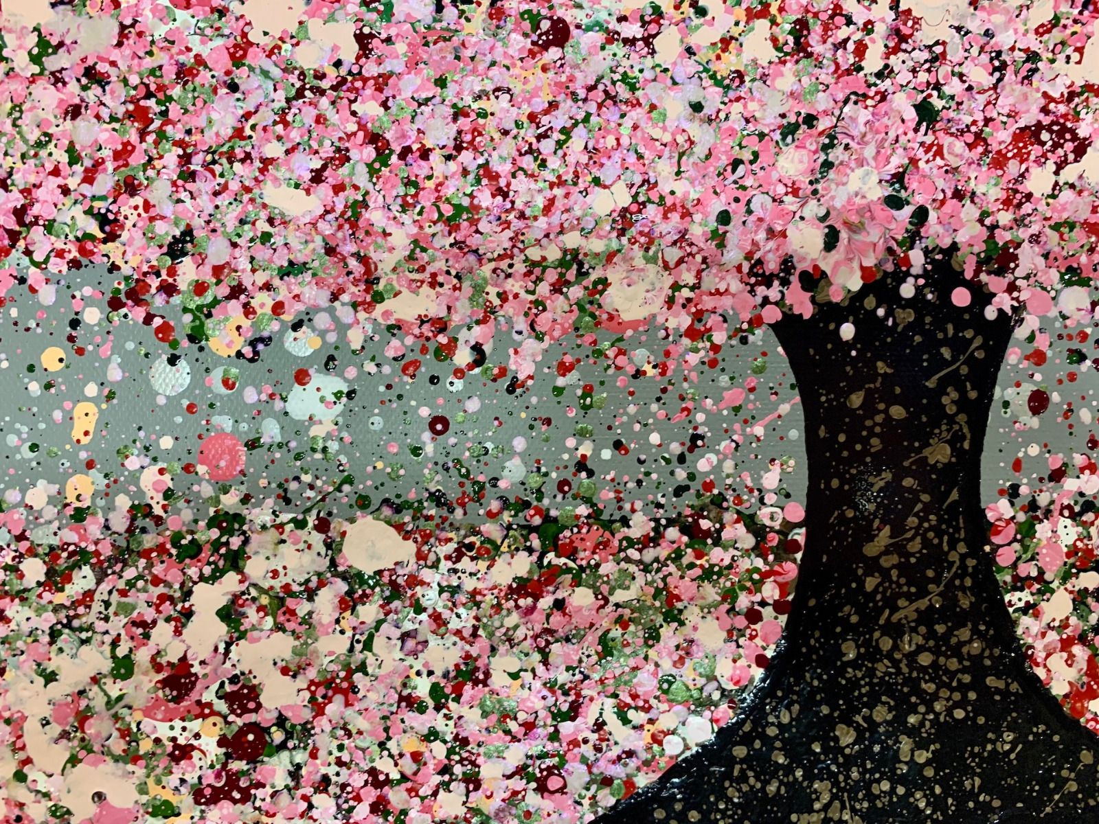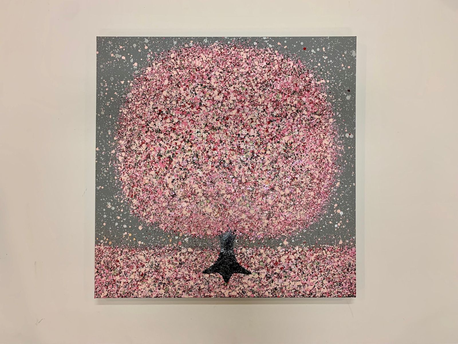 Cherry Blossom Storm II is a signed original acrylic painting on canvas of a blossoming tree with pink in a flowery field of the same colours against a grey sky.