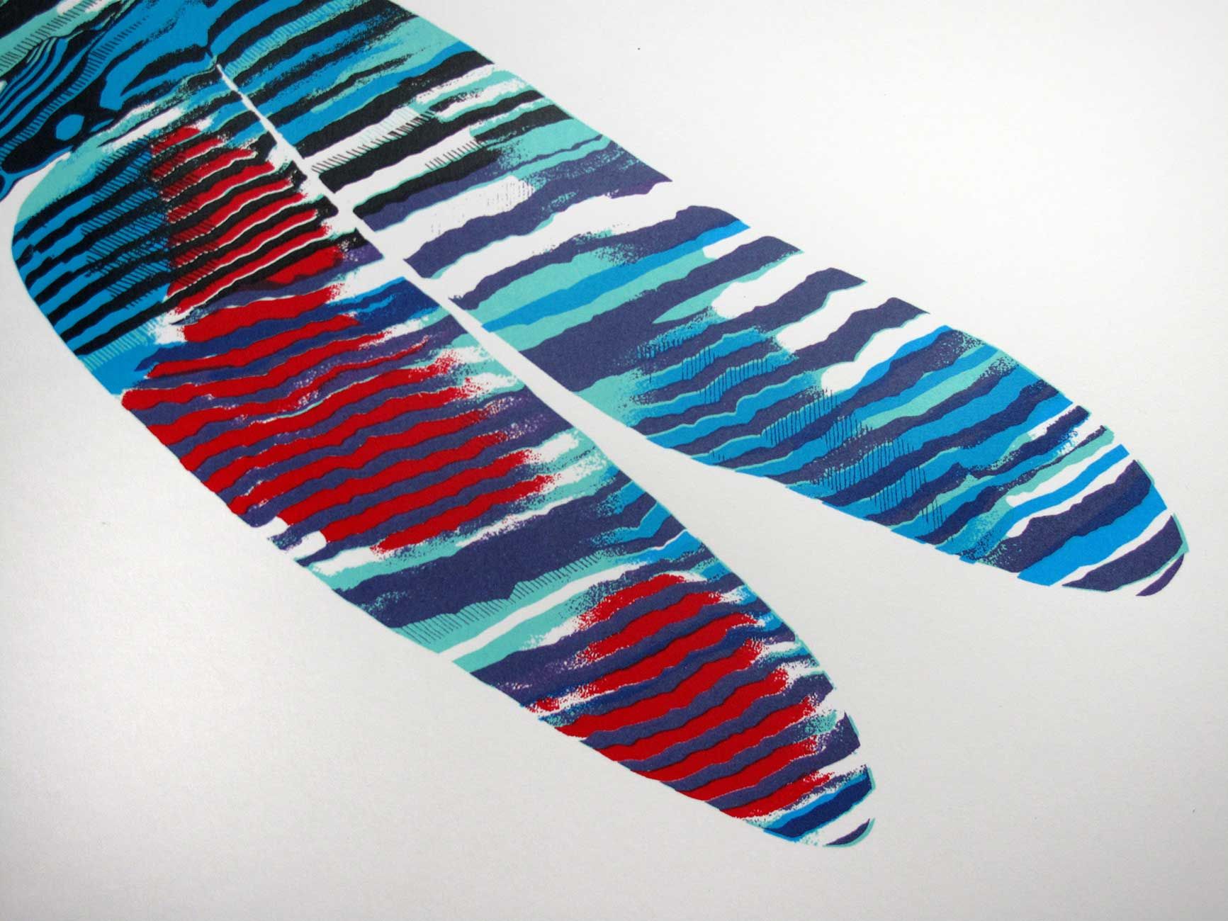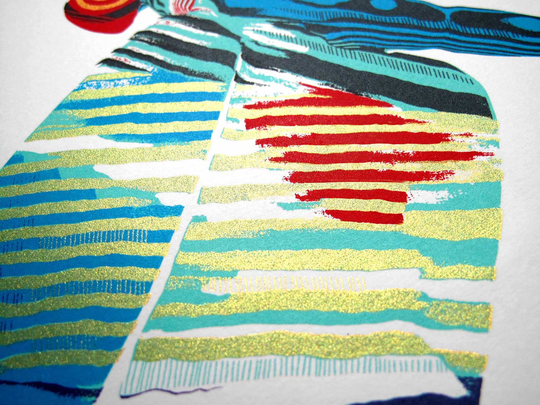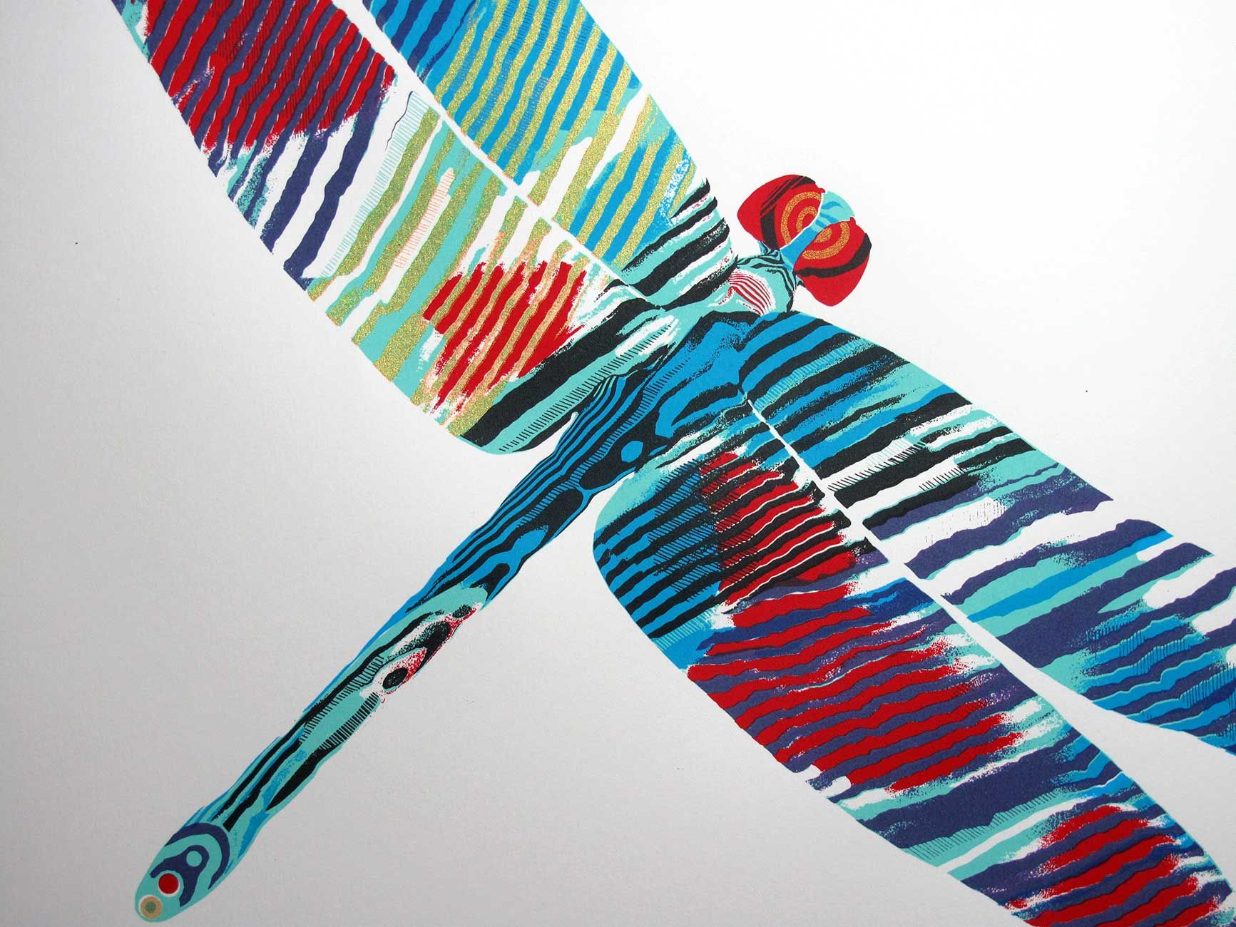 This handmade screenprint depicts a Dragonfly inset with a set of geometric shapes in Six colours including Metallic Gold ink. The artwork was created using procedurally generated patterns that overlap creating complex layered geometric shapes. The Metallic ink layer gives the print an extra brilliance and shines showing off the multi-layered