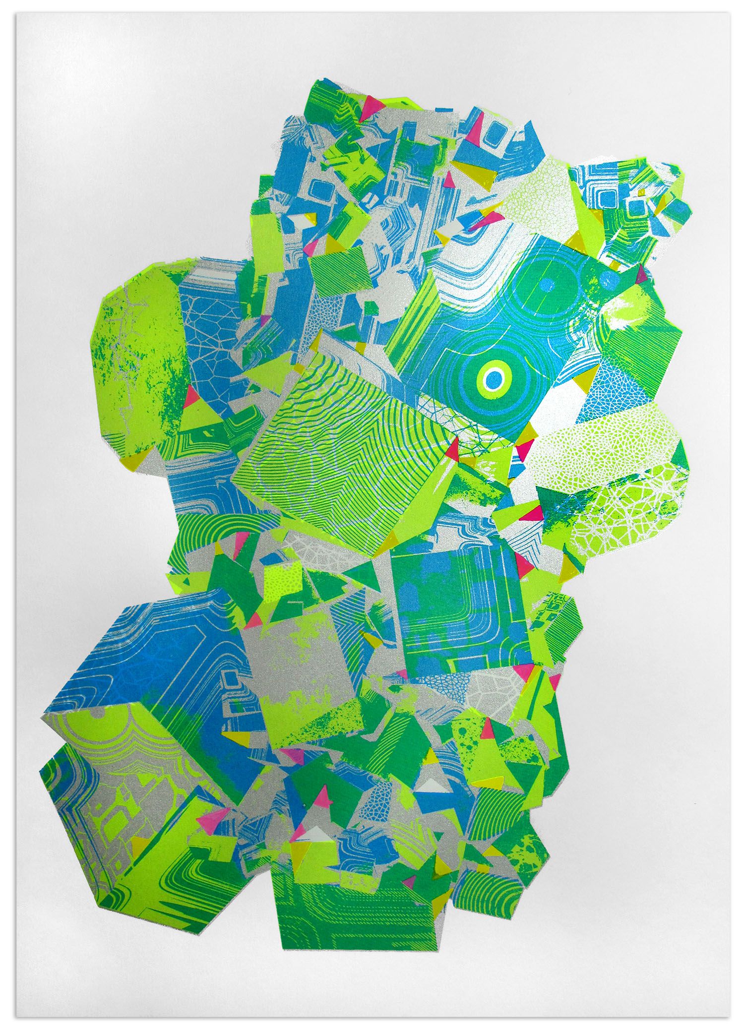 This multi-coloured Gemstone is hand-printed in florescent Yellow, Blue and metallic Silver ink. Then finished off by hand drawing over the print with multi-coloured paint. The Silver layer gives the print an extra brilliant shine showing off the multi layered printed structure which really helps to bring the three dimensional