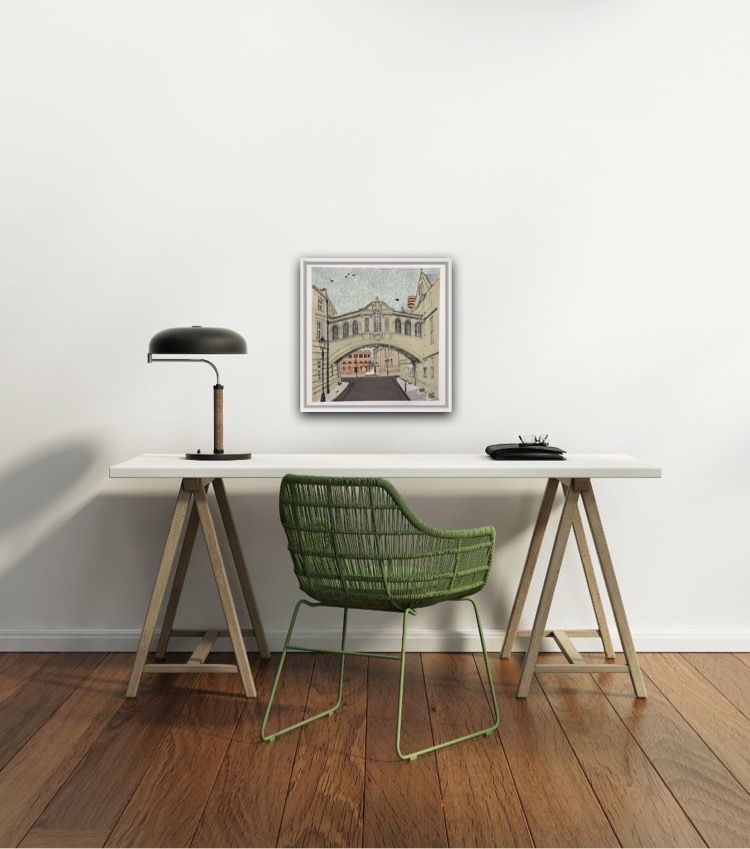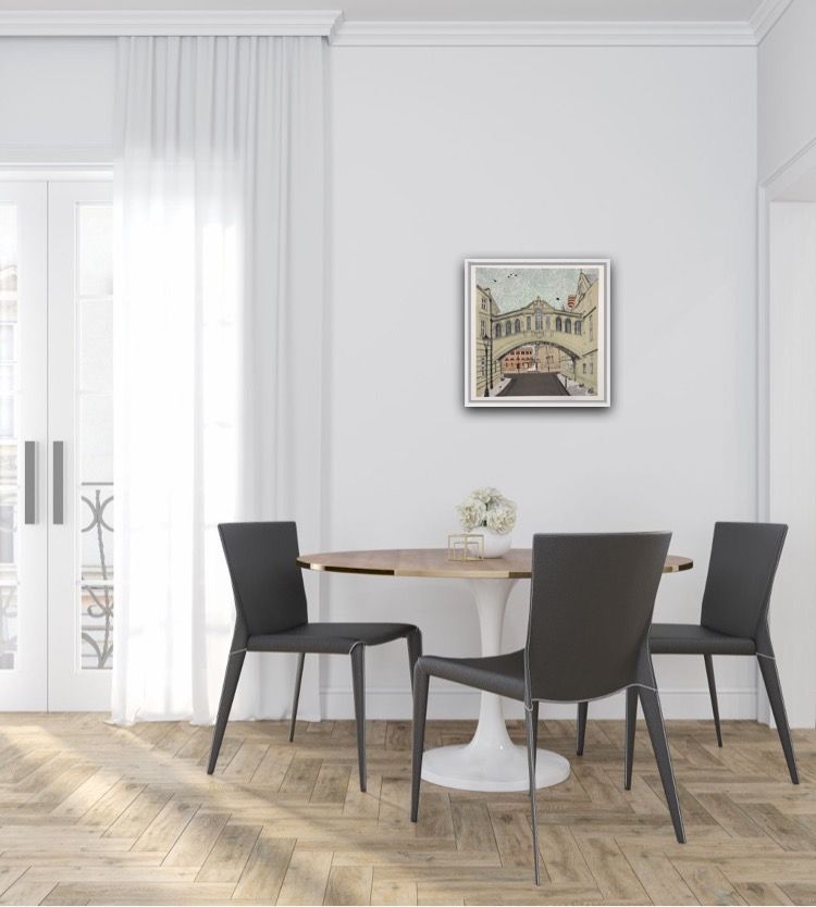 Clare Halifax Bridge of Sighs Oxford Limited Edition 8 colour screen print Edition of 75 Sheet Size: H 38cm x W 37cm x 0.1cm Sold Unframed Hand printed by the artist onto somerset satin paper 300gms with deckle edge. Please Note that in situ images are purely an indication of how a piece may look Clare Halifax's handprinted