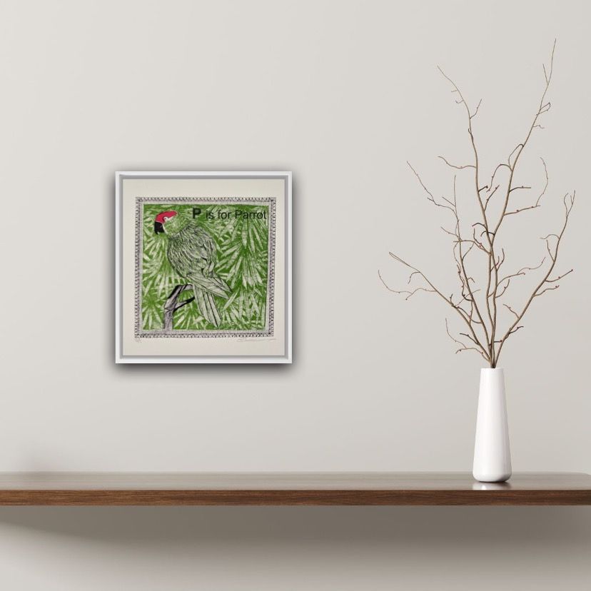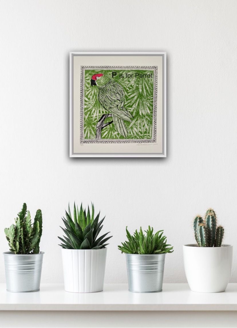 Clare Halifax P is for Parrot Limited Edition 3 Colour Silkscreen Print Edition of 75 Image size H 22 x W 22cm Sheet Size: H 27 x W 25cm x D 0.1cm Sold Unframed Please note that in situ images are purely an indication of how a piece may look. The process involved in producing a print starts