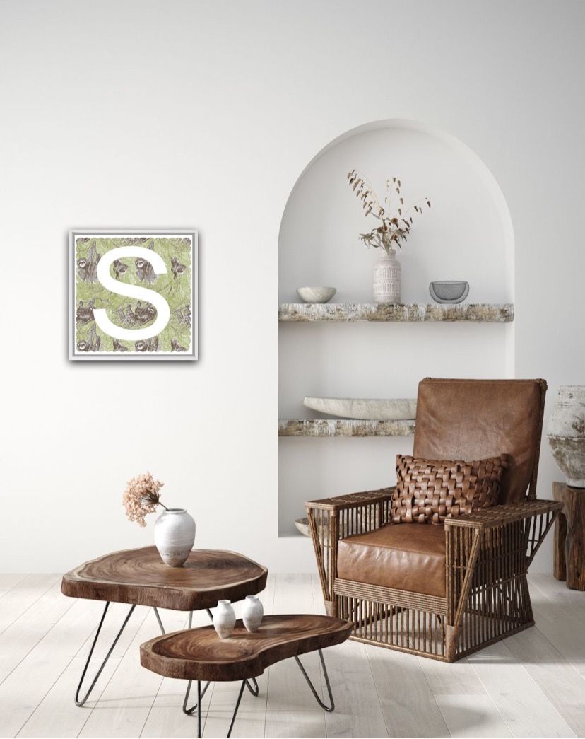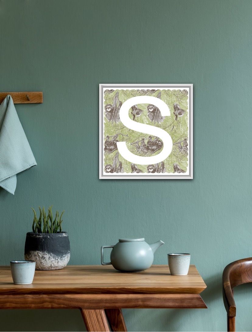 An Alphabet series using animals in their natural habitats to create a patterned background to the letter. S is for Sloth is a 3 colour screen print hand printed by the artist onto somerset satin 300gms with deckle edge. Clare Halifax S is for Sloth Limited Edition 3 colour screen print