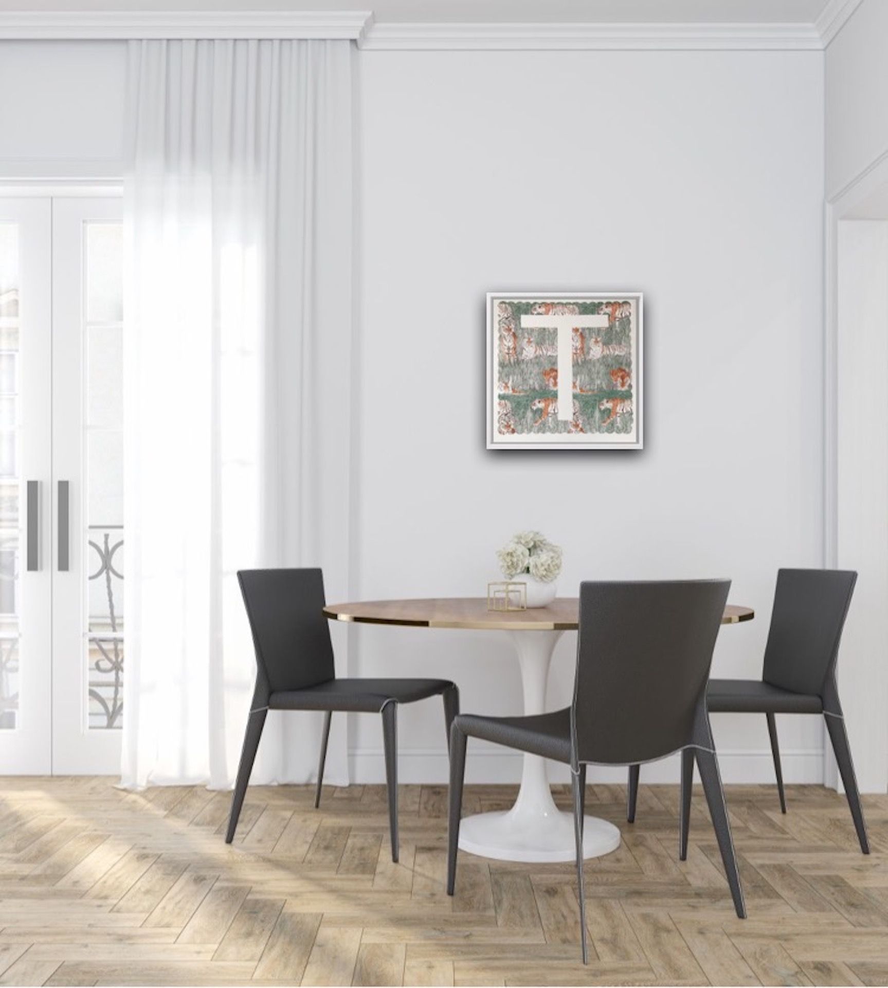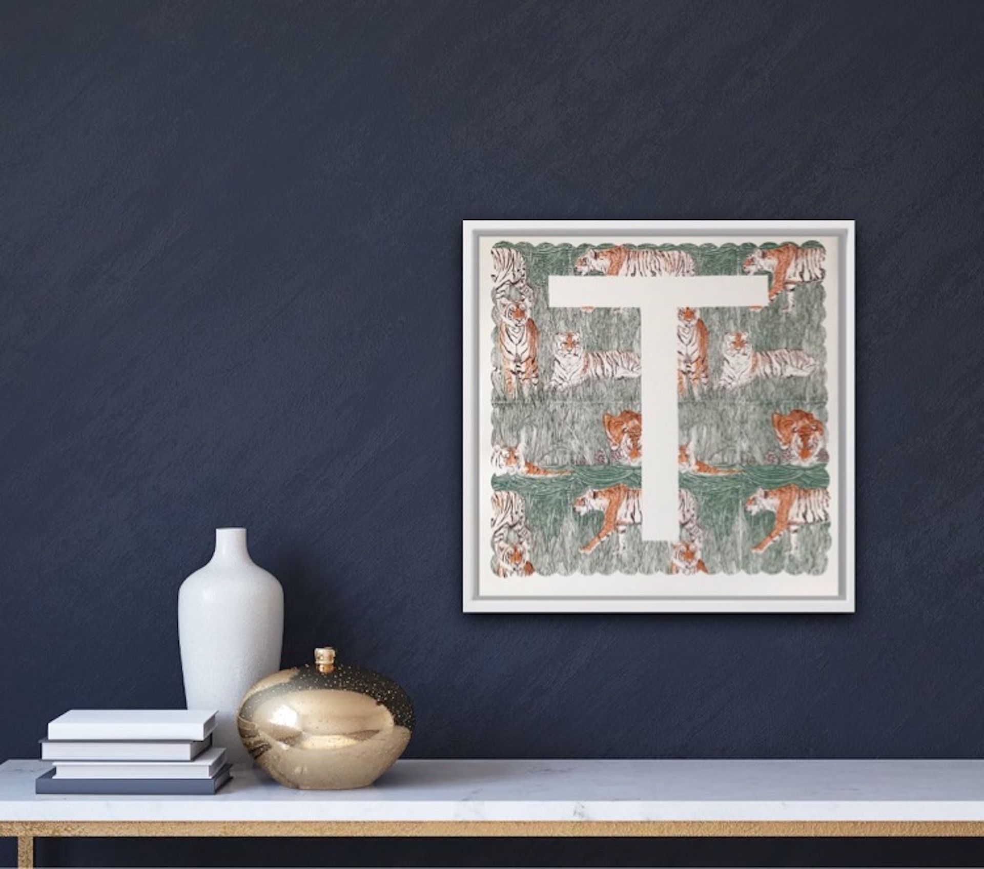 Clare Halifax T is for Tiger Limited Edition 3 colour screen print Edition of 100 Sheet Size: H 38cm x W 37cm x 0.1cm Sold Unframed Hand printed by the artist onto somerset satin paper 300gms with deckle edge. Please Note that in situ images are purely an indication of how a piece may look An Alphabet series