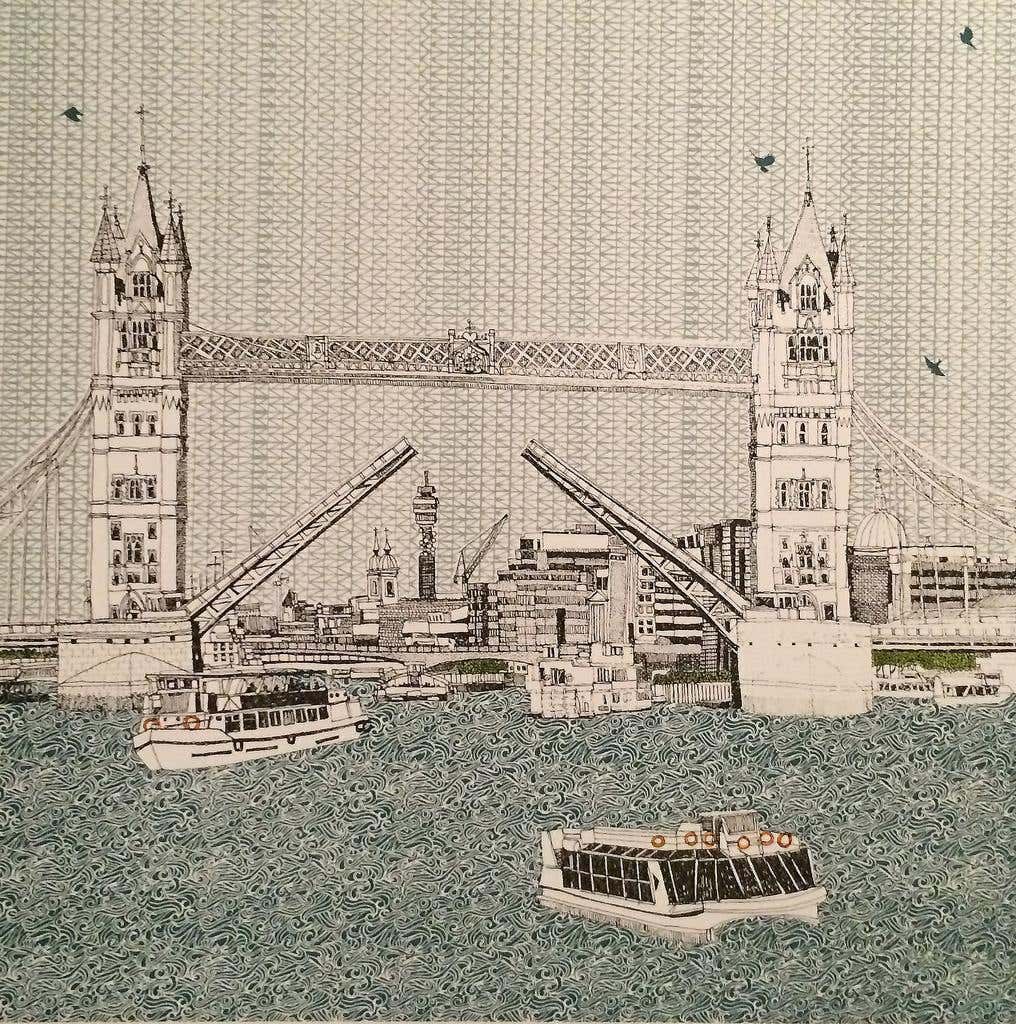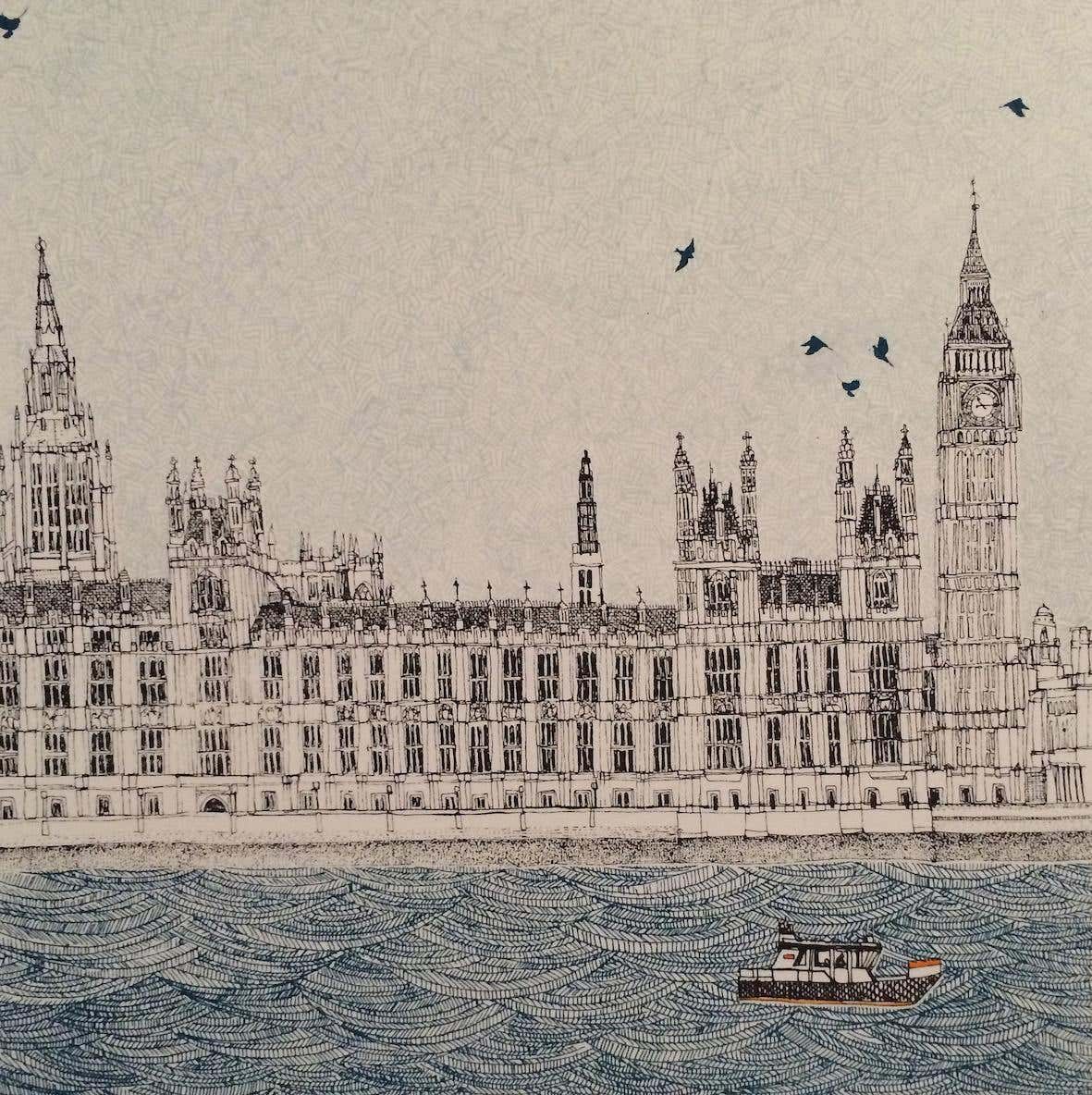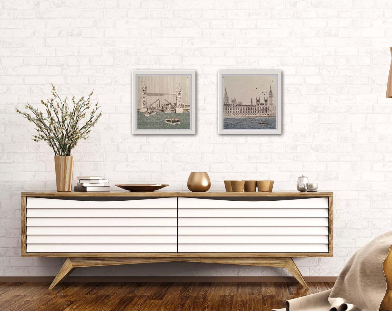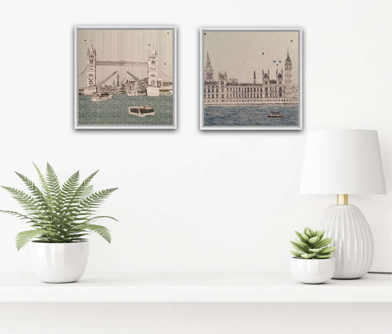 Tower Bridge and Waves at Westminster diptych Overall sheet size: H55.8 X W52 Clare Halifax. Waves at Westminster- a Thames view of the houses of parliament and Big Ben. Limited Edition Print; edition of 100. Sold Unframed. IMAGE SIZE: H:23CM X W:23CM SHEET SIZE: H:28.5CM X W:25.5CM Size: H:28 cm x W:25 cm Clare Halifax. A thames View of the