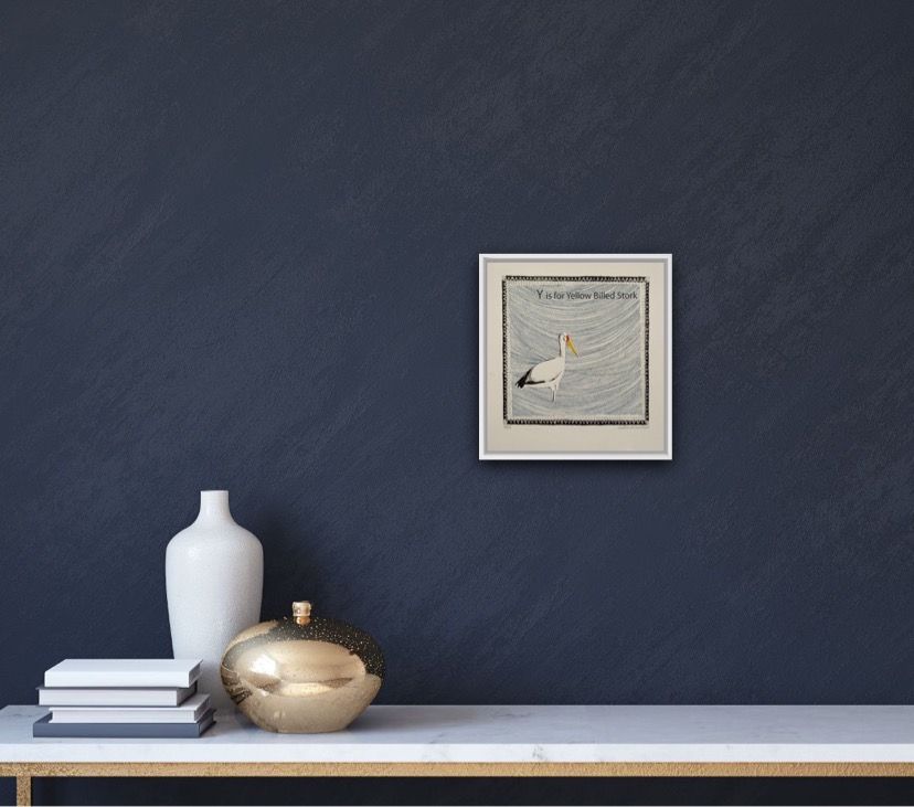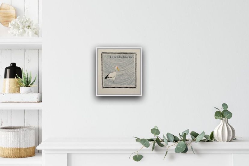 Clare Halifax Y is for Yellow Billed Stork. Limited Edition 4 Colour Silkscreen Print. Edition of 75. Image size H 22 x W 22cm Sheet Size: H 27 x W 25cm x D 0.1cm. Sold Unframed. Please note that in situ images are purely an indication of how a piece