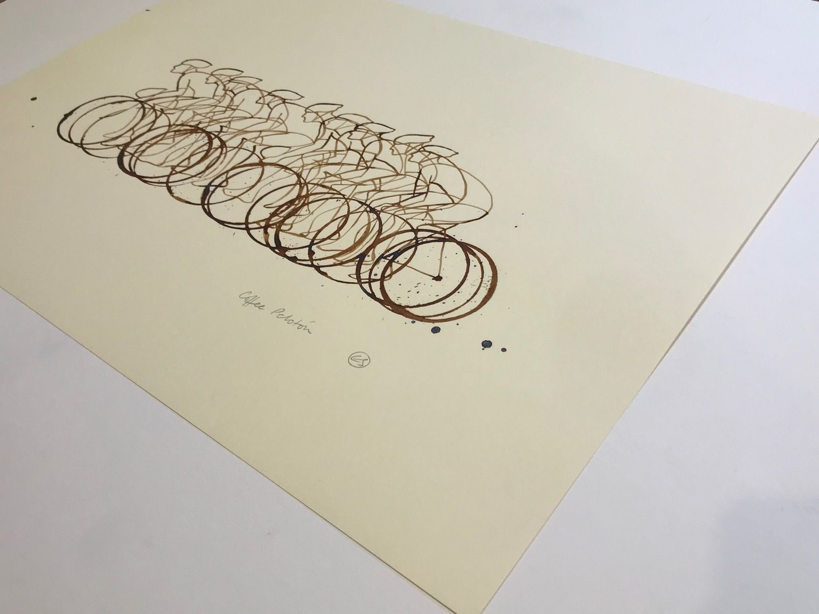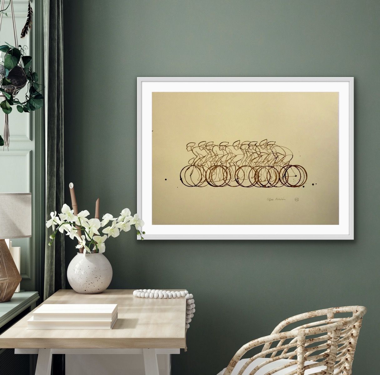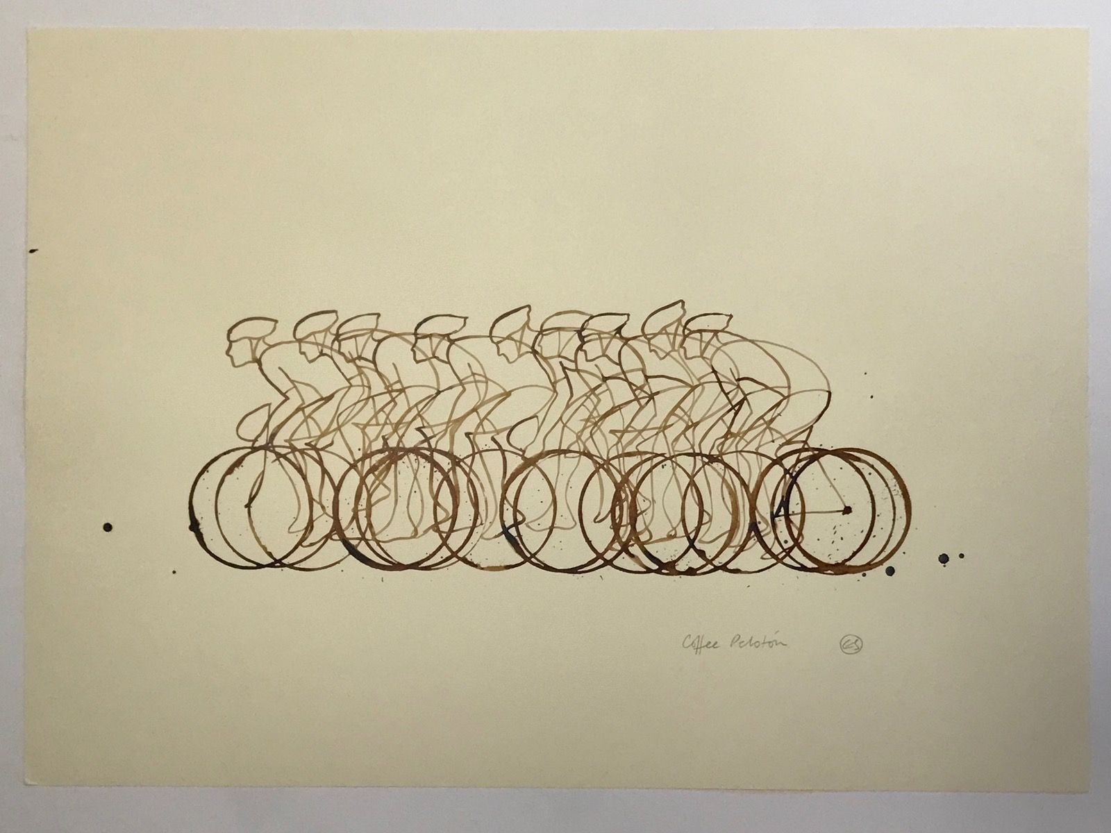 Additional information:Eliza SouthwoodCoffee on paperSold unframed Image size ( dimentions of the cyclists): Height: 17.2cmWidth: 47cmComplete size of unframed painting Height:49cmWidth: 69cmDepth: 0.1cm