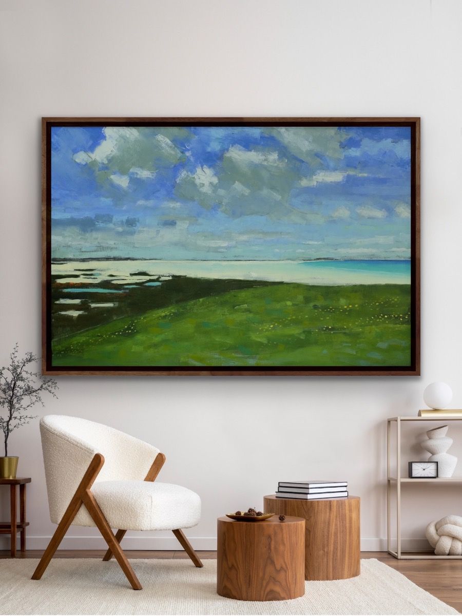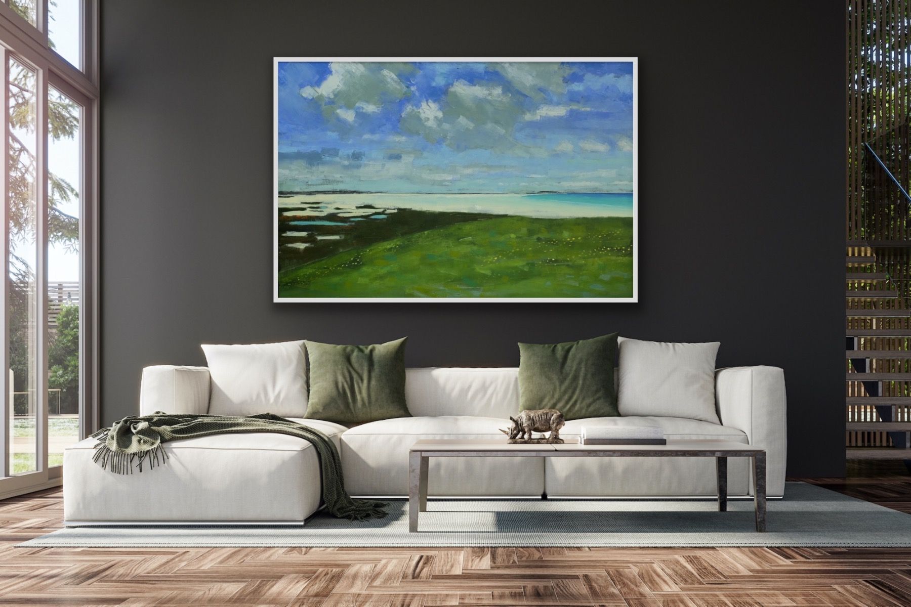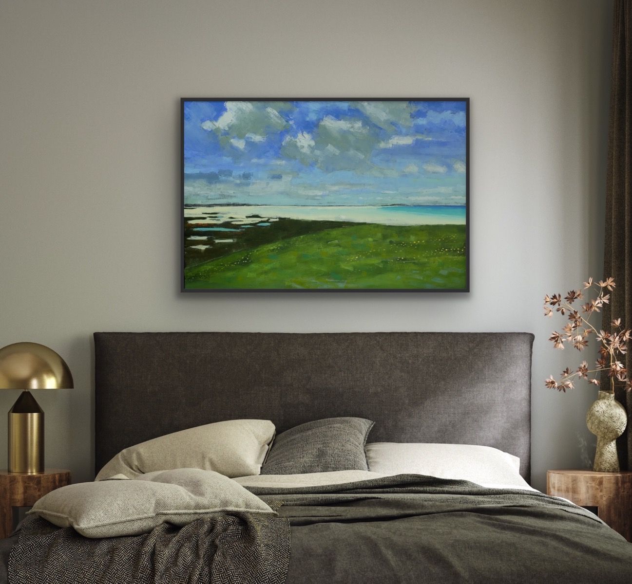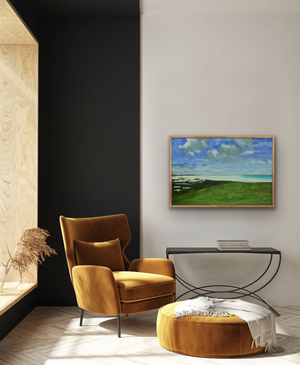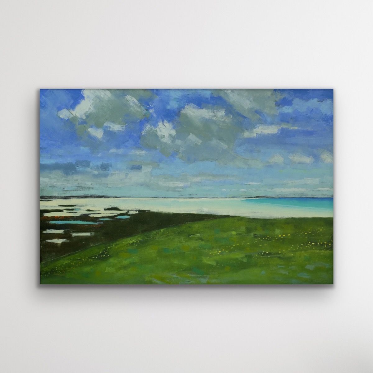 Machair II is an original landscape painting by Colin Moore. This painting depicts a beautiful seascape view looking out from land. Colin Moore printmaker and painter was born on the Clyde Coast of Scotland in 1949. ADITINAL IMFORMATION: Colin Moore Machair II Original Landscape Painting Oil on Linen Canvas Size: H 61cm