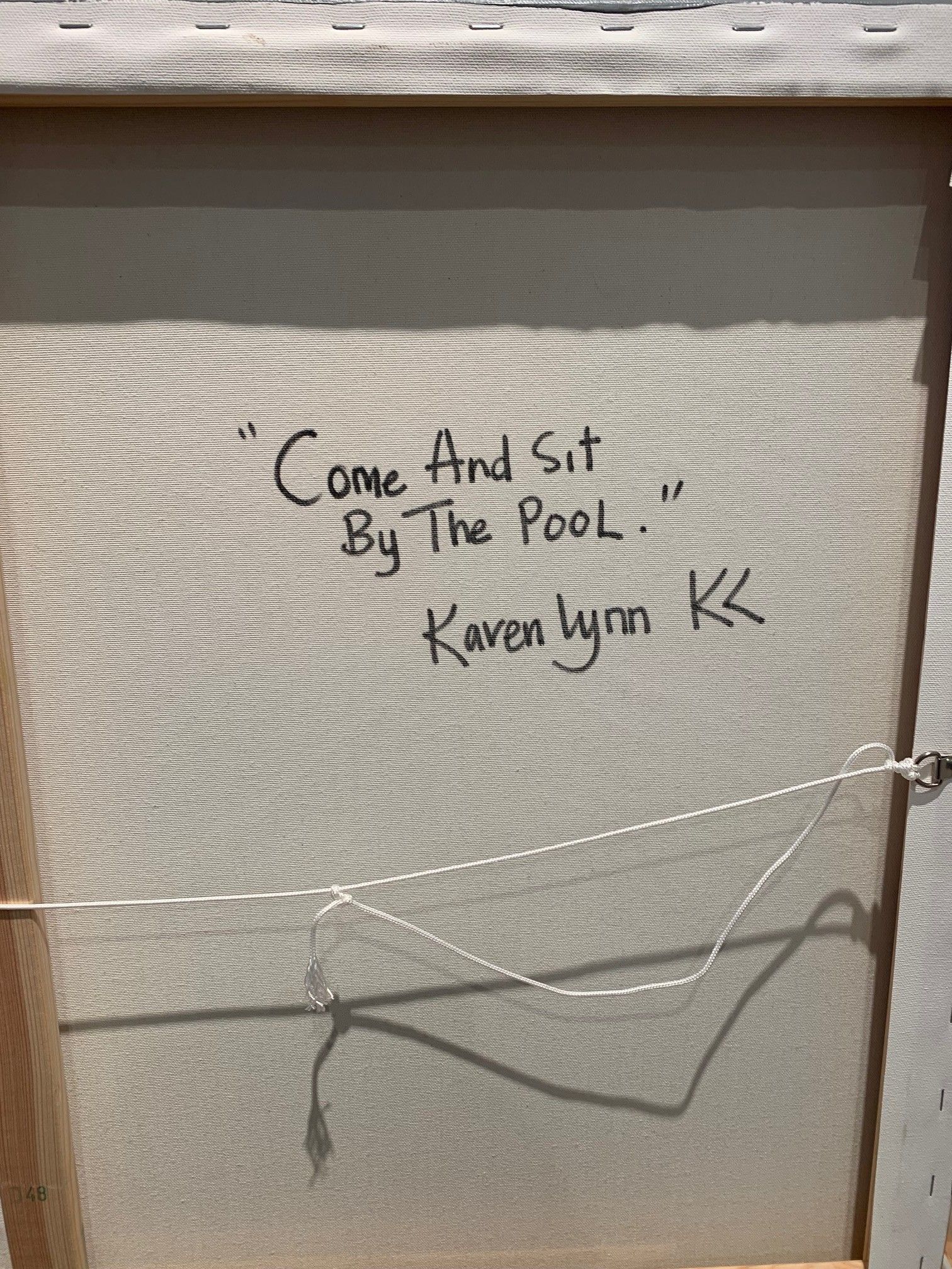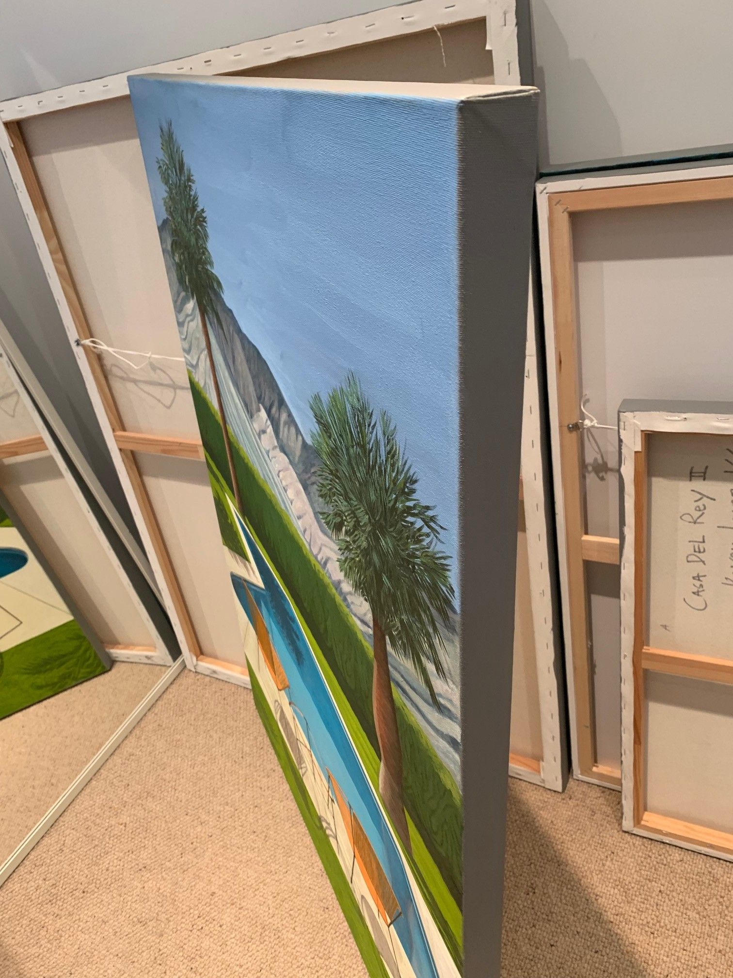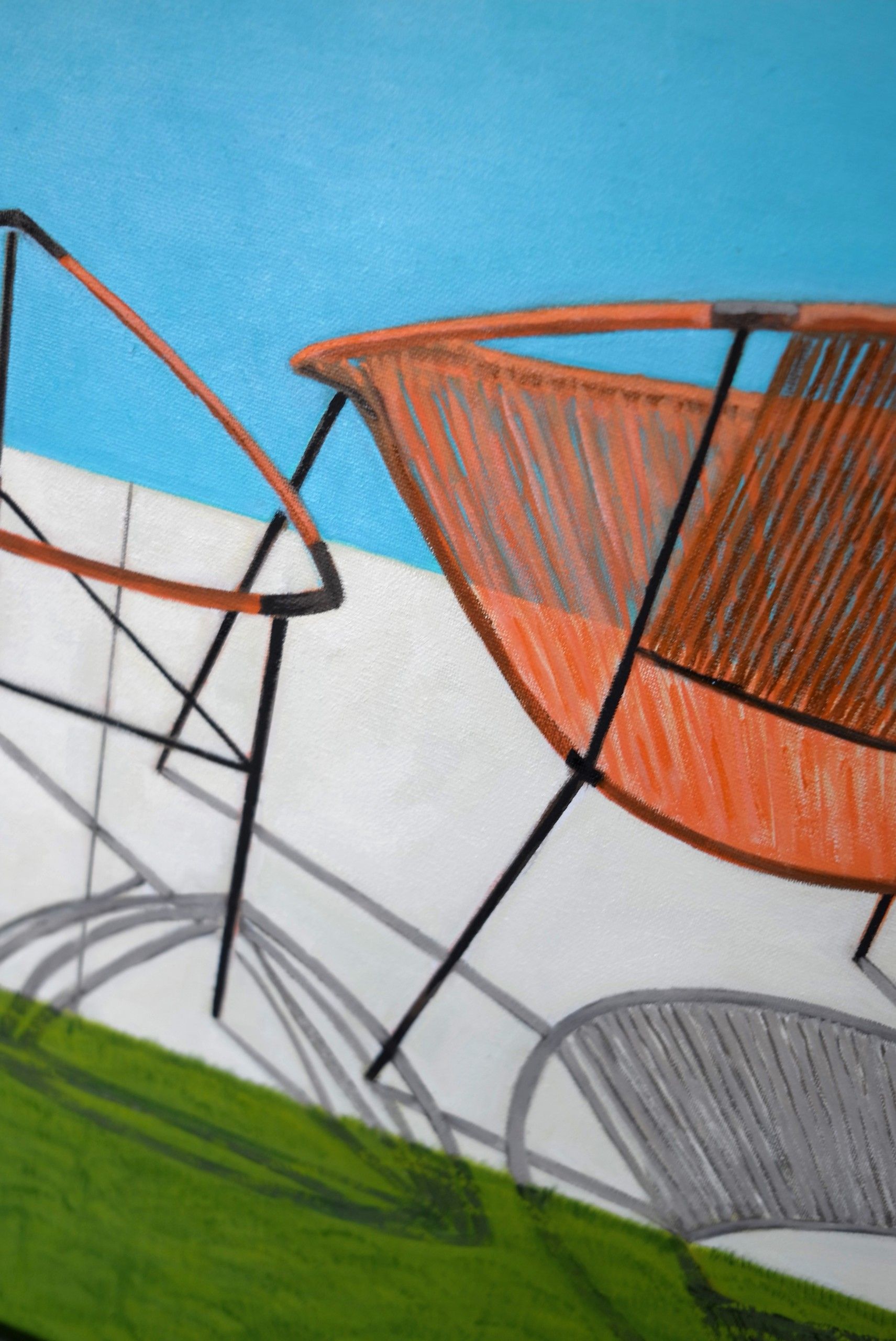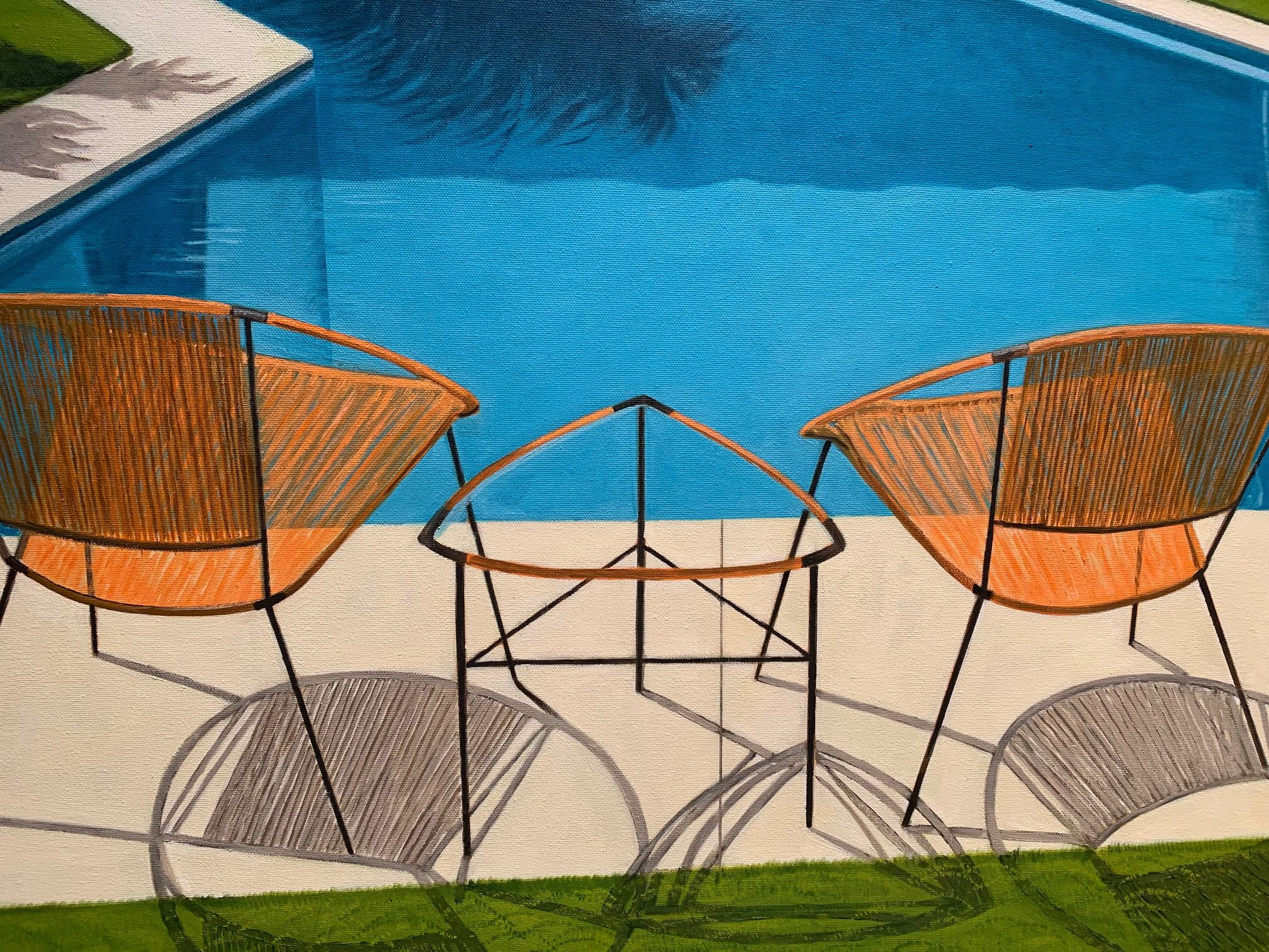 This is a painting from my series of pool paintings. In this painting I wanted to capture a pop art feeling of contrasting colours of a brilliant blue pool and the vibrant modernist orange chairs and table. I often place imagined mountains in my scenes resembling Palm Springs or other mountainous regions. I