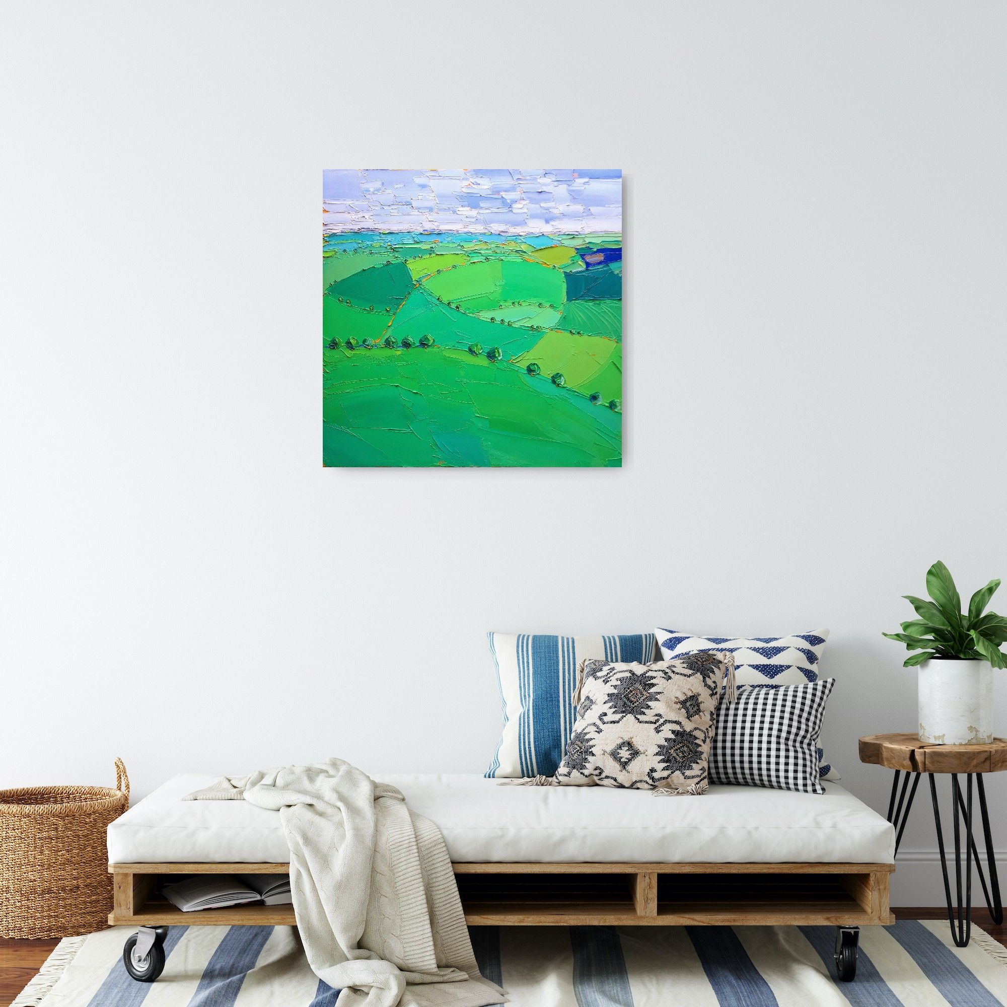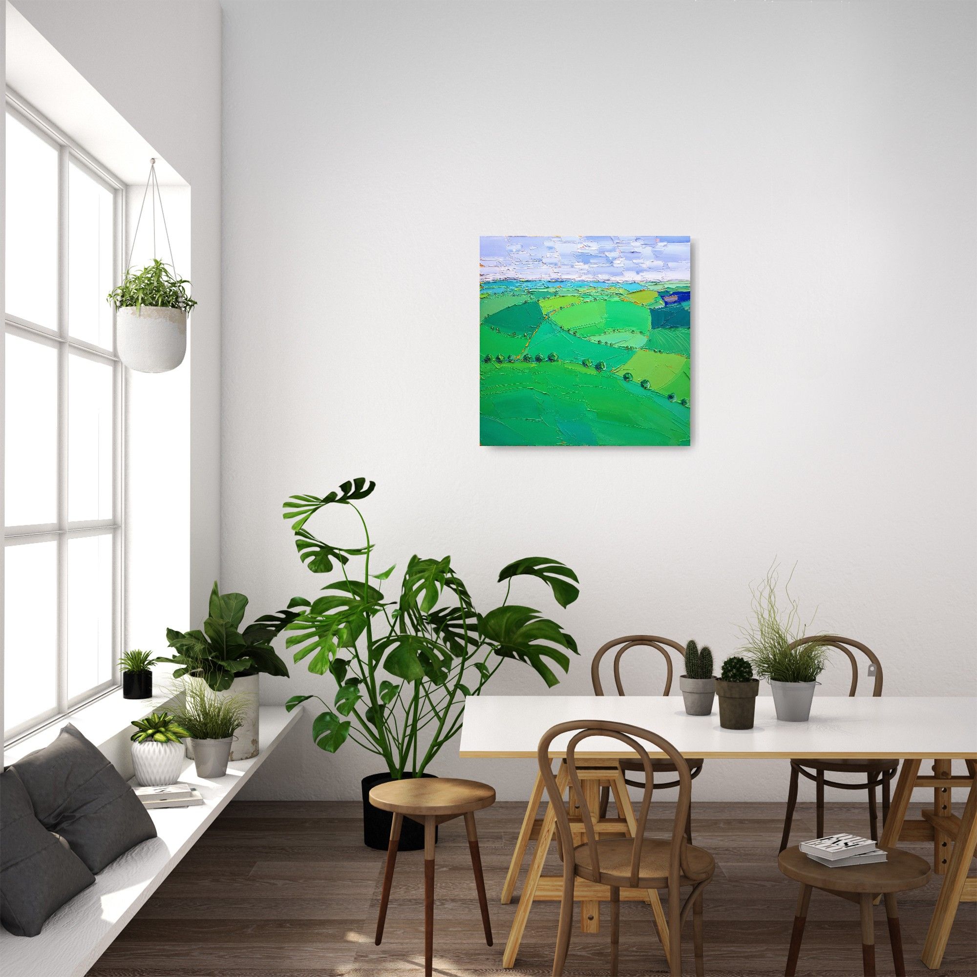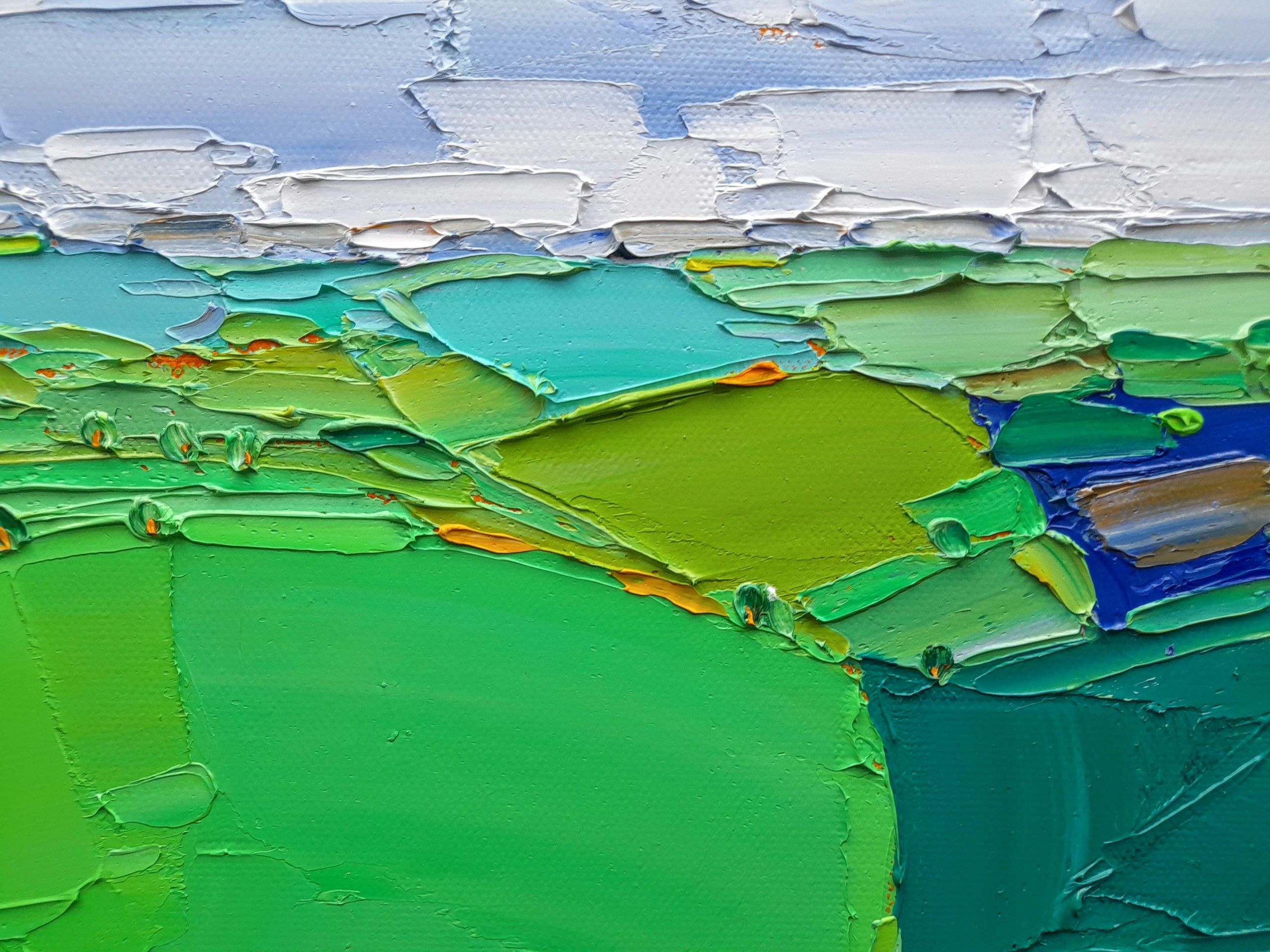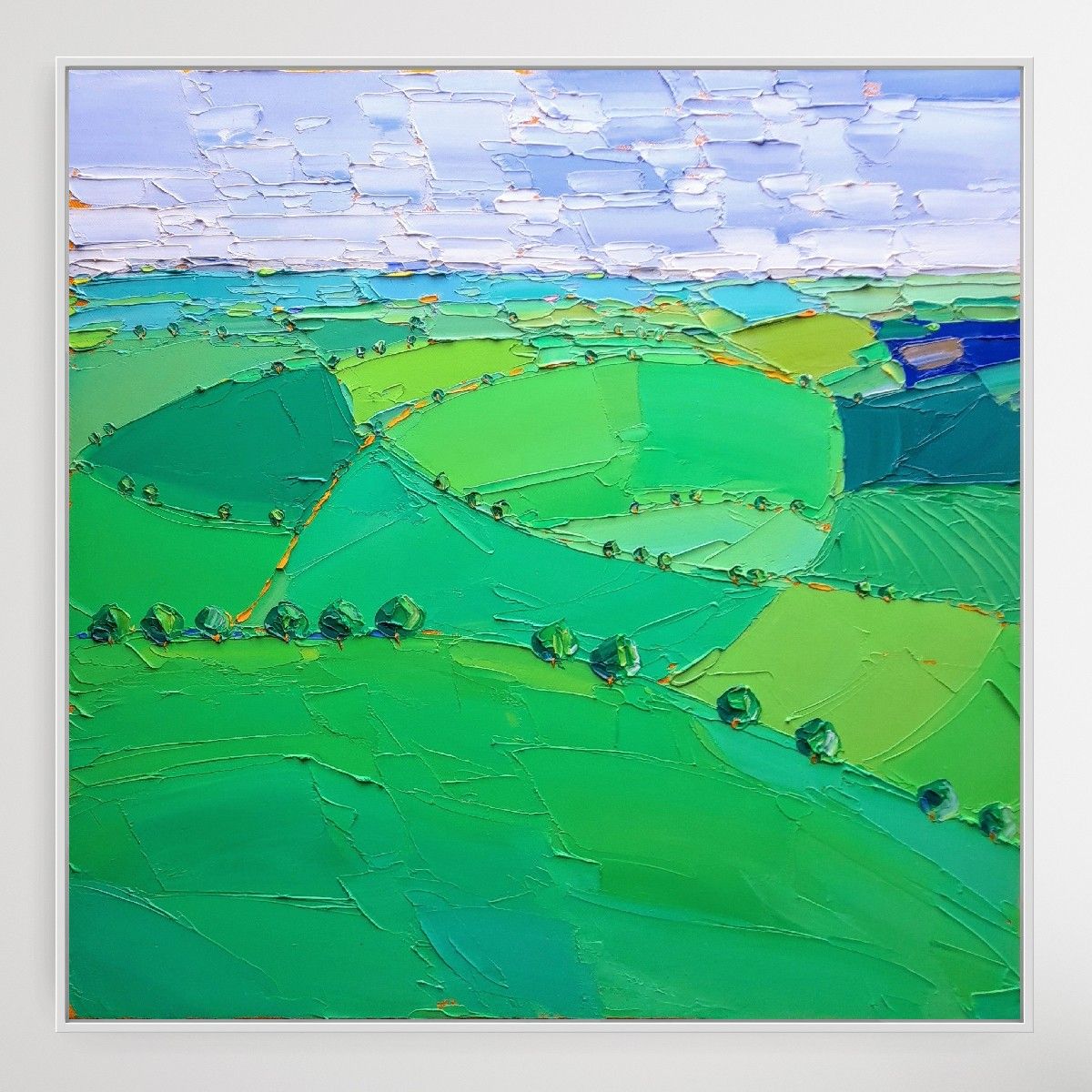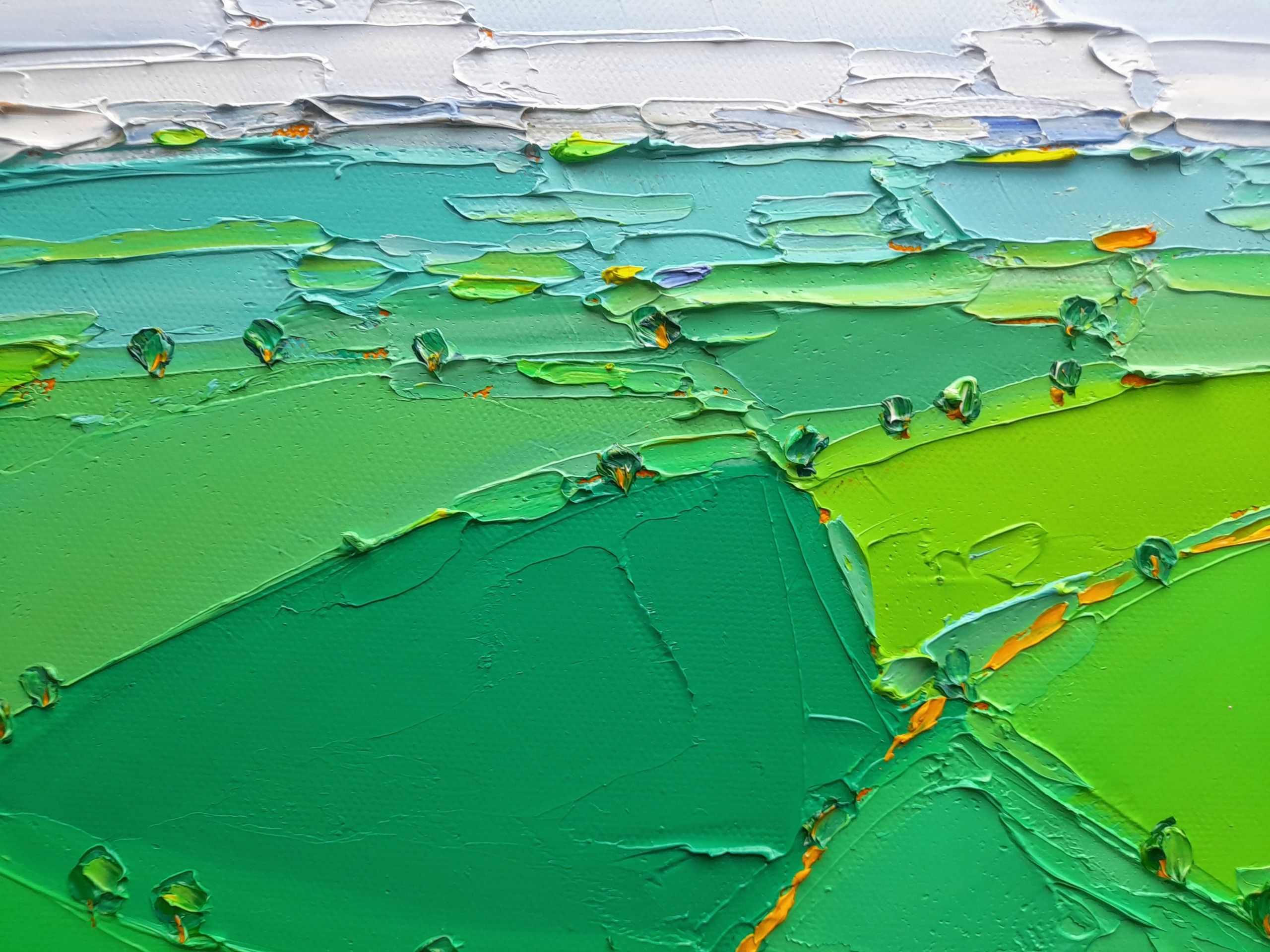 This painting depicts a view of patchwork fields in the Cotswolds portrayed by thick strokes of paint applied with a palette knife, exploring the variety of shapes and colours we see in the landscape. A photograph was taken on horseback as a reference for this piece which was then created
