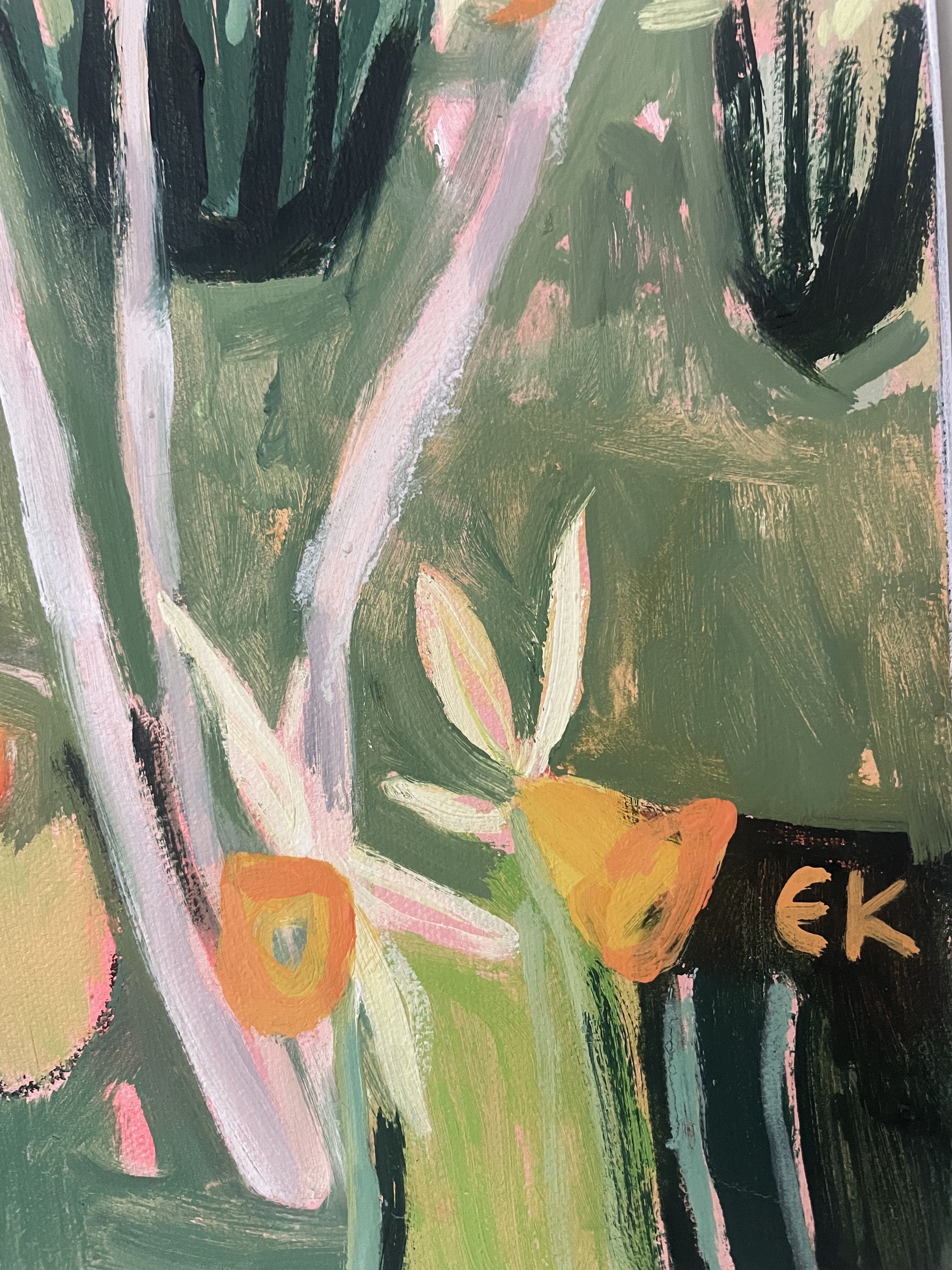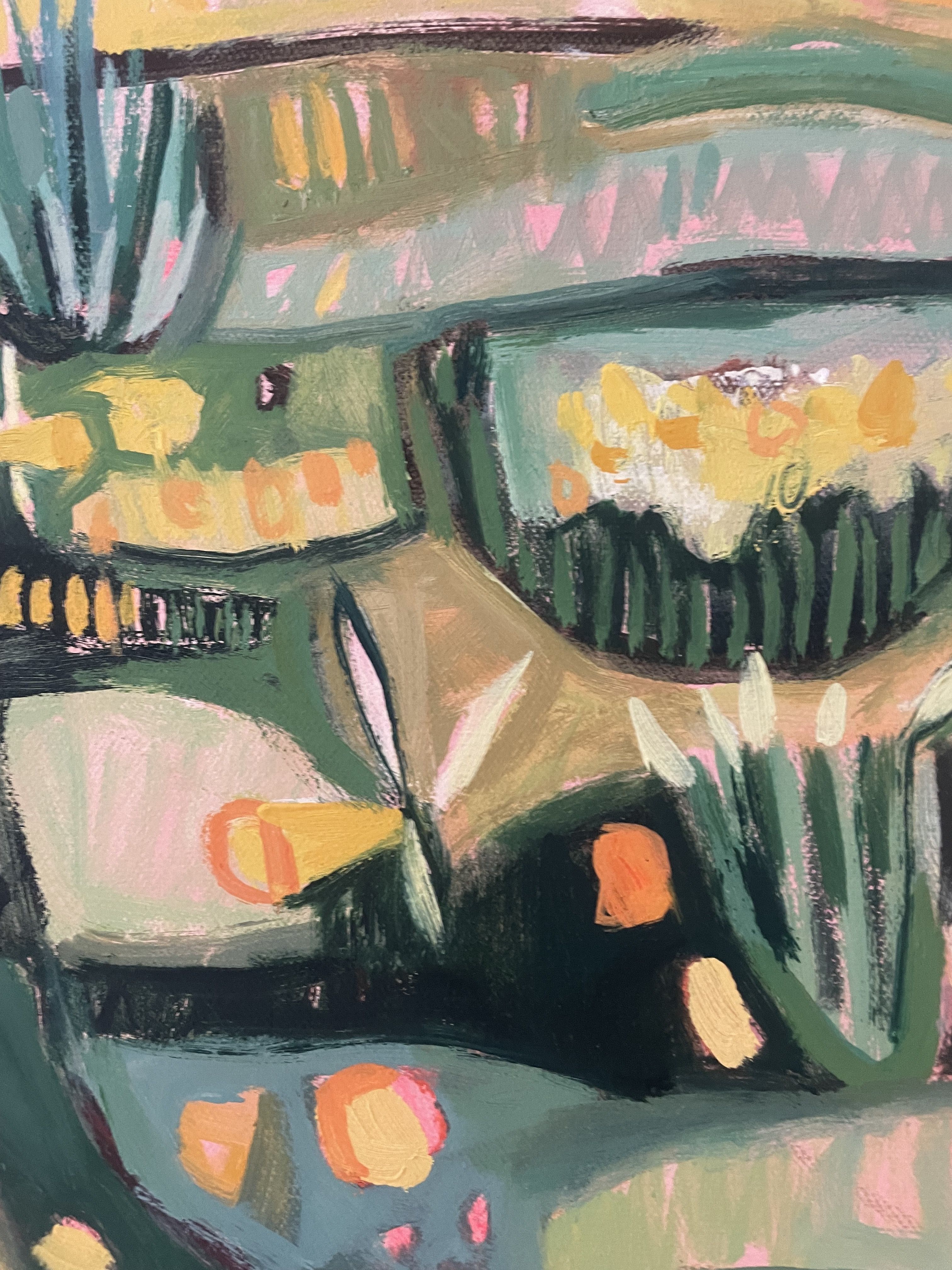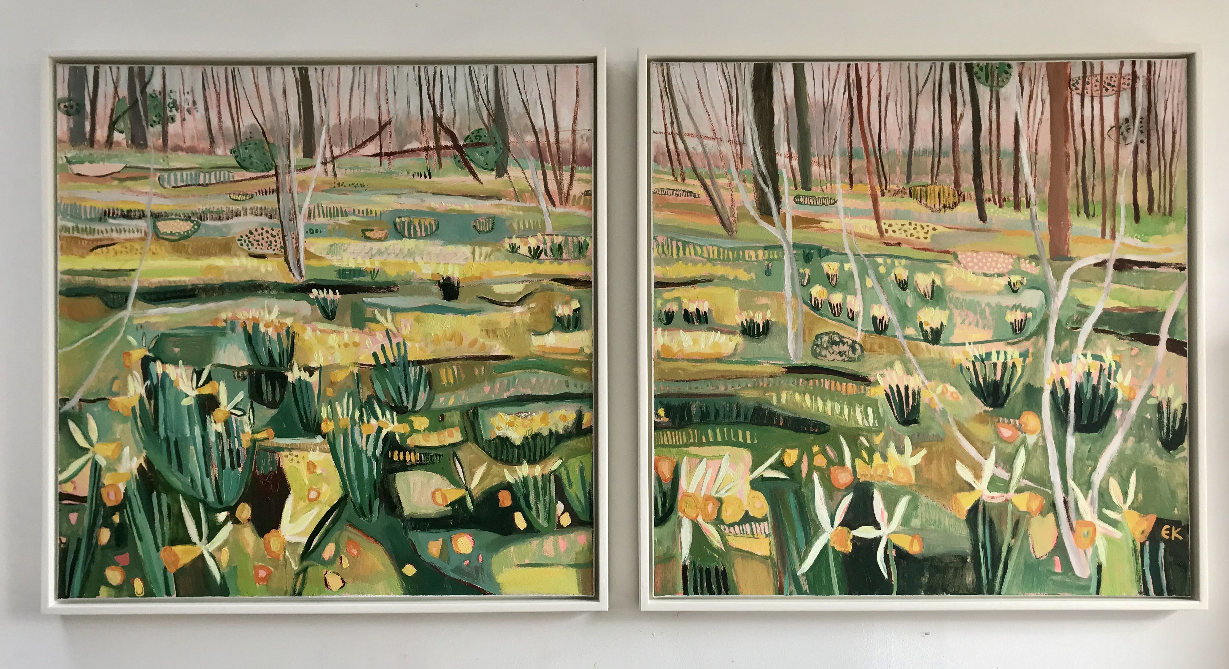 A woodland of wild daffodils in Wales, dappled with spring sunshine. The light creates contrasting shades of bright and darker green which is almost turquoise blue in the shadowy spots, and catches the pretty yellow petals. ADDITIONAL INFORMATION:Oil Paint on Canvas61 H x 122 W cm (24.02 x 48.03 in)Sold framed Image