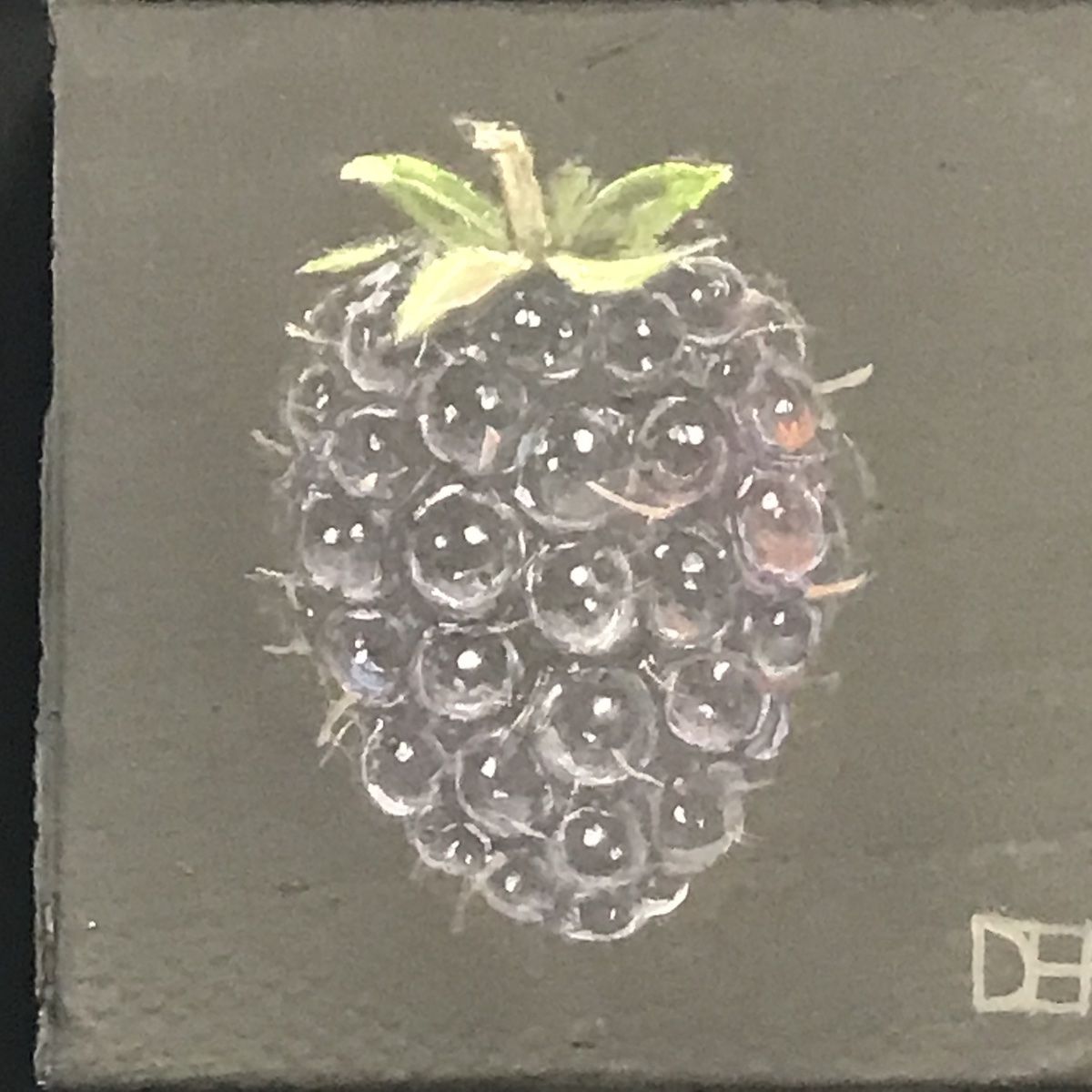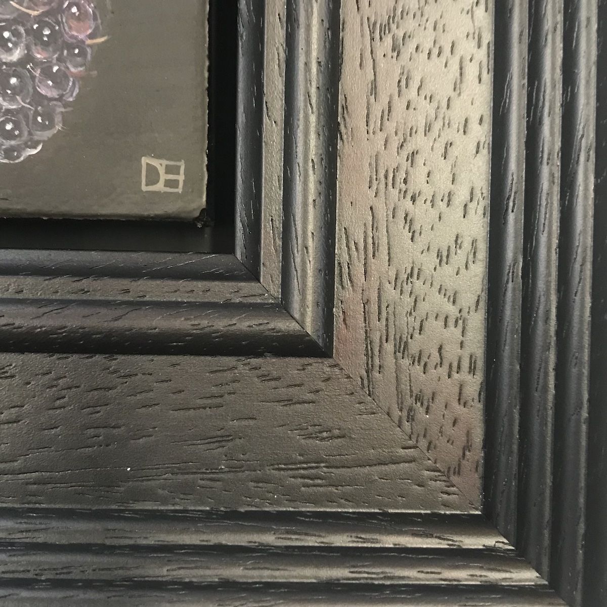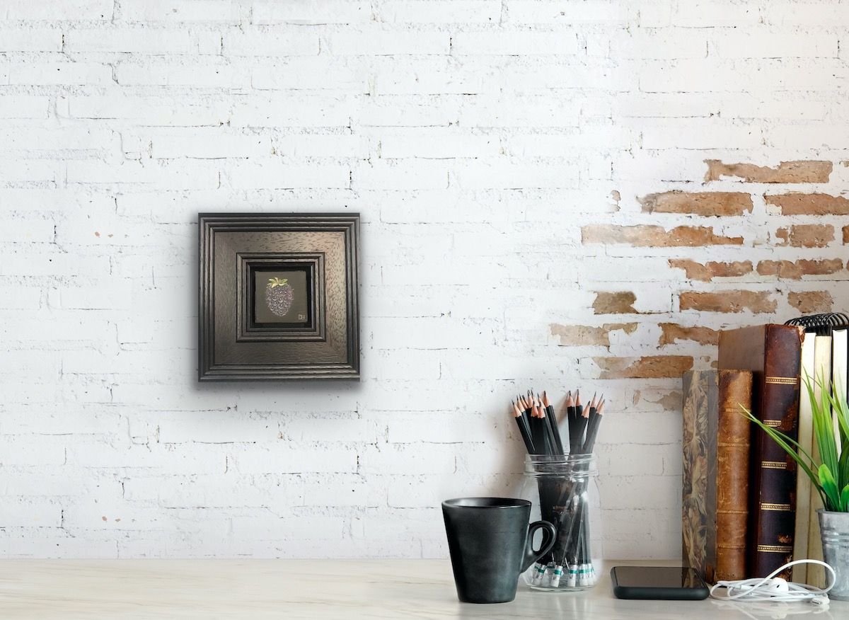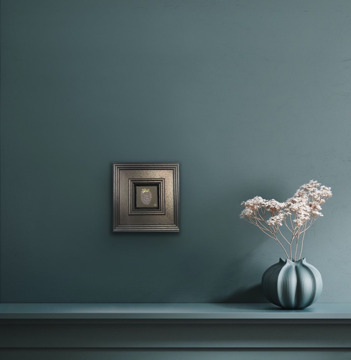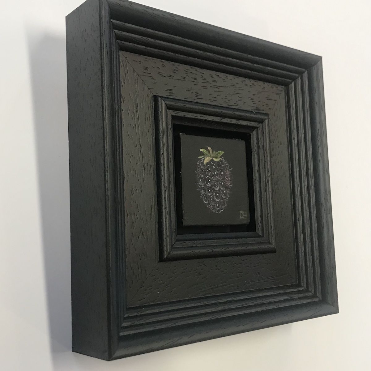 Dani Humberstone's Pocket Blackberry is a classically painted still life piece. The black background and layered black frame focuses your attention on the attention to detail in this very precisely painted work.