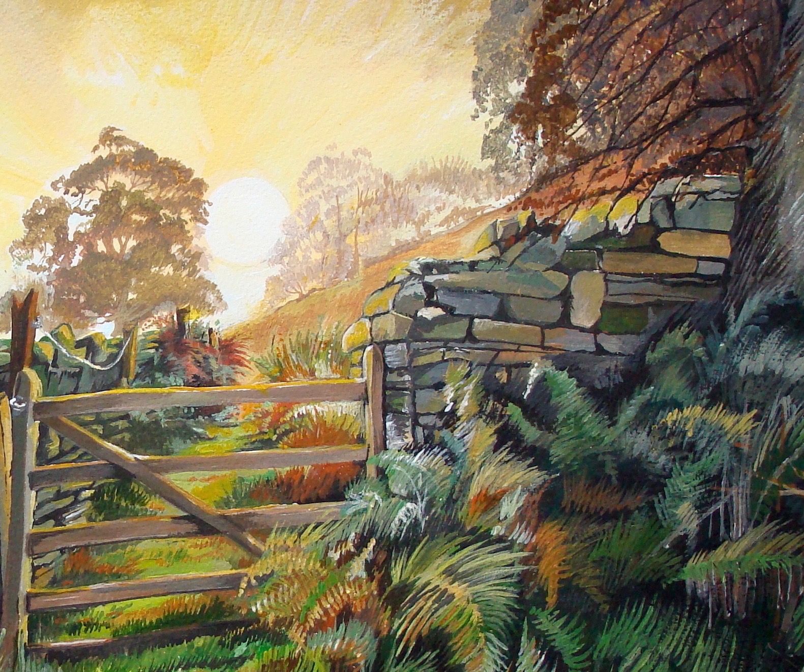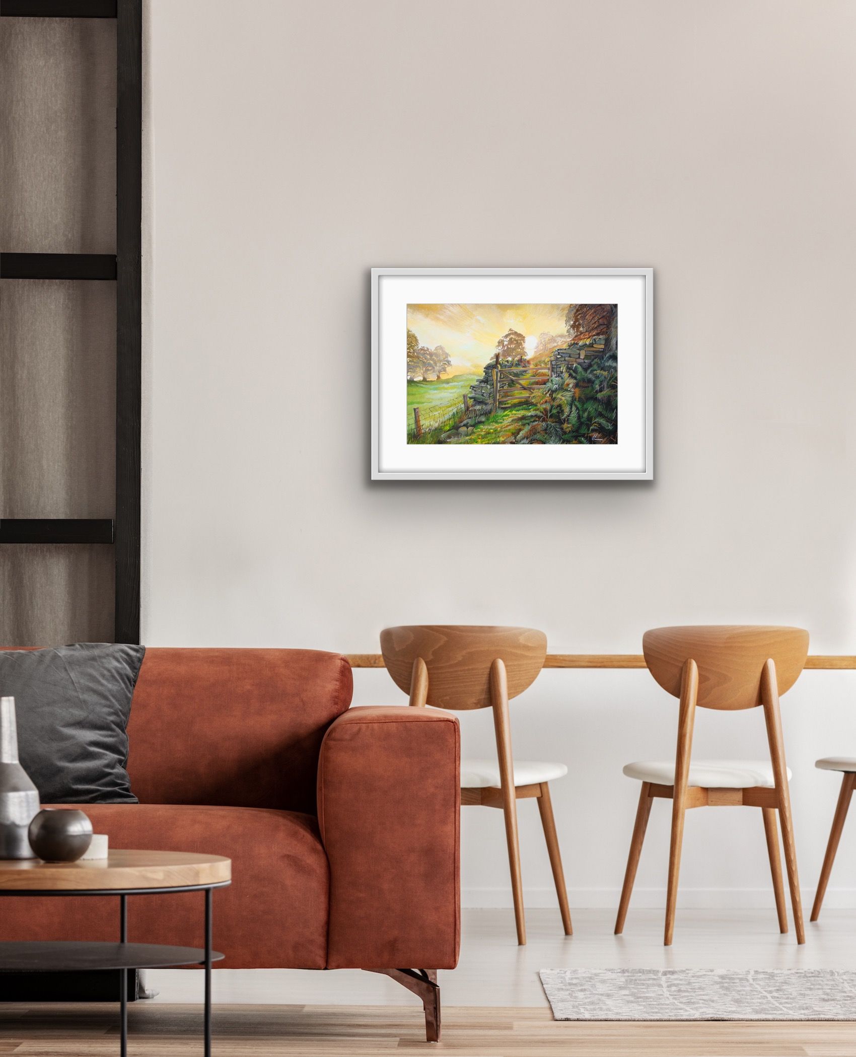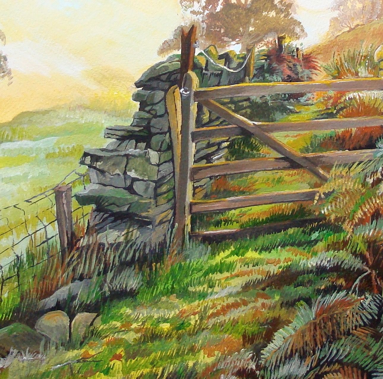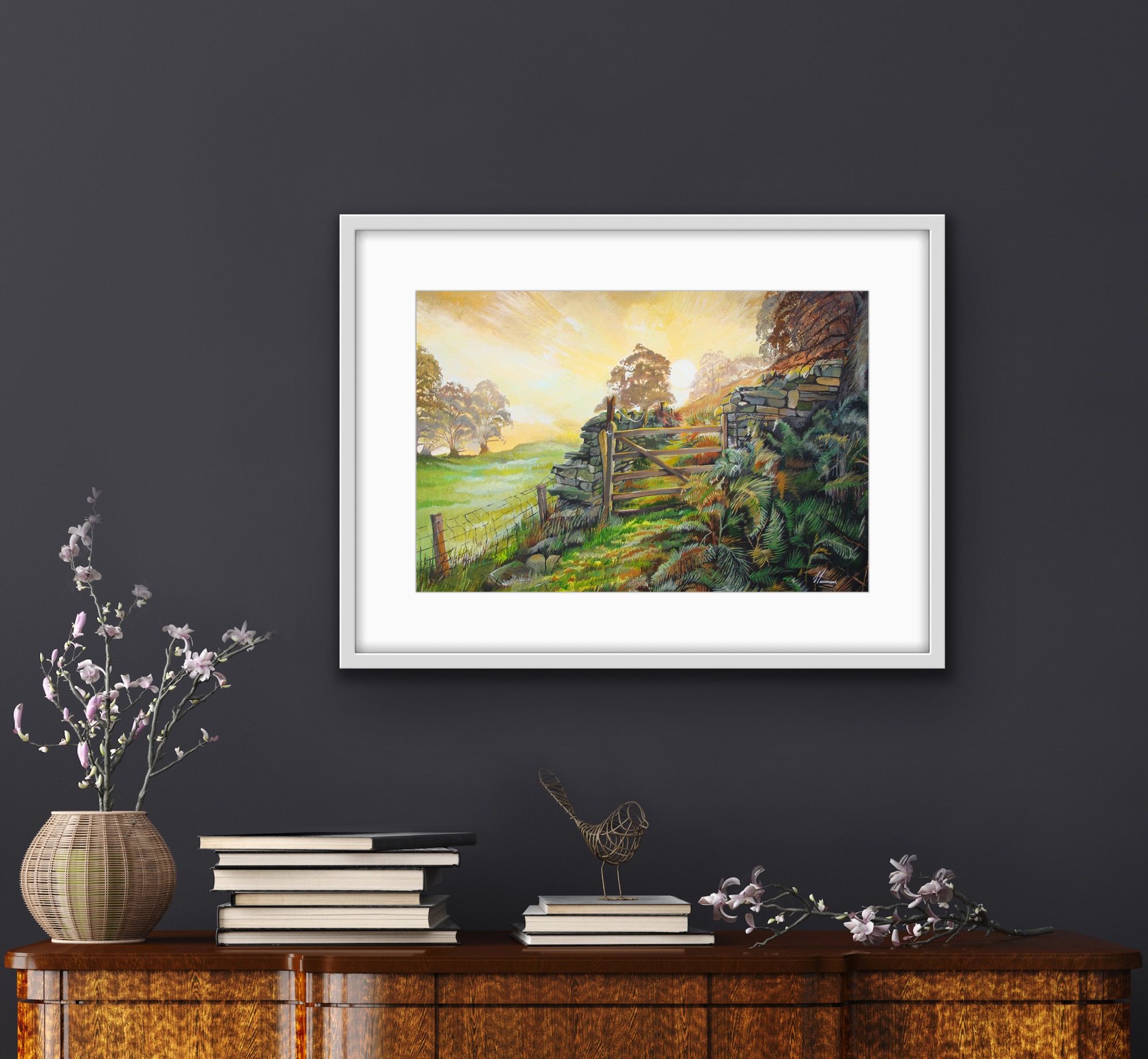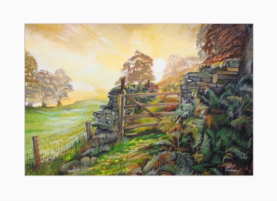 Autumnal Dawn depicts a early sunrise through mist, lighting up a bridle path above Derwent Water in Derbyshire.