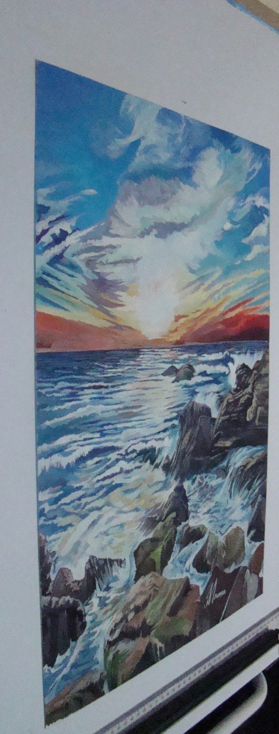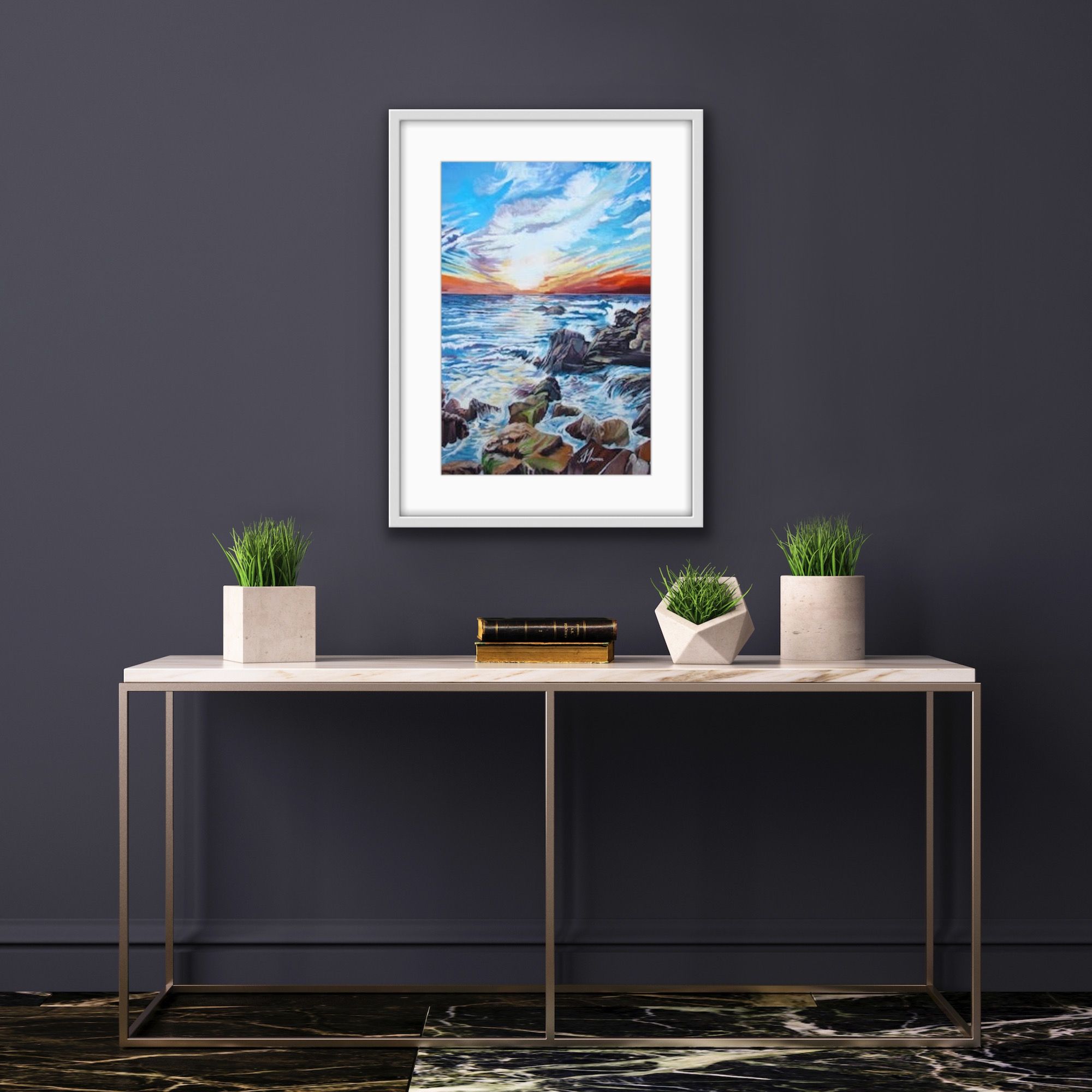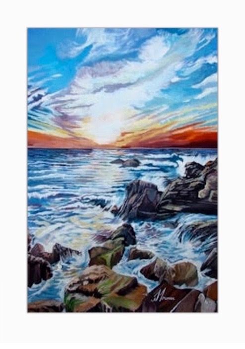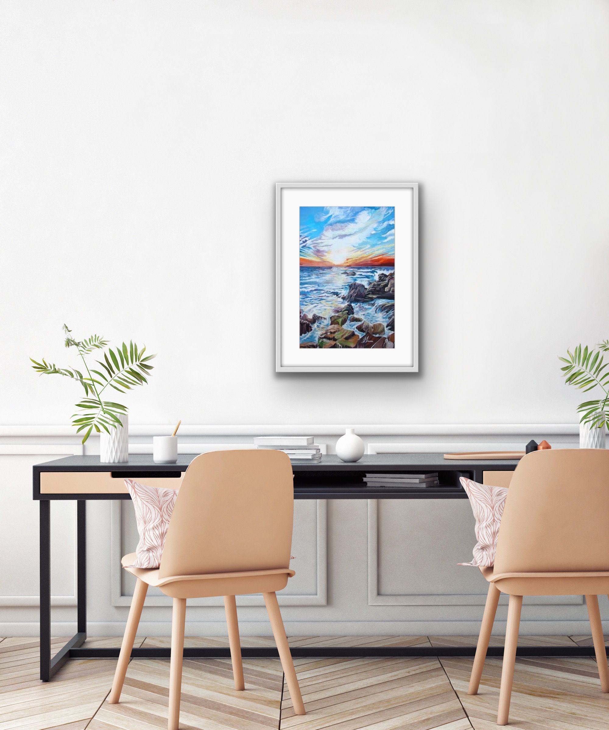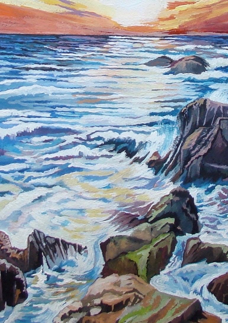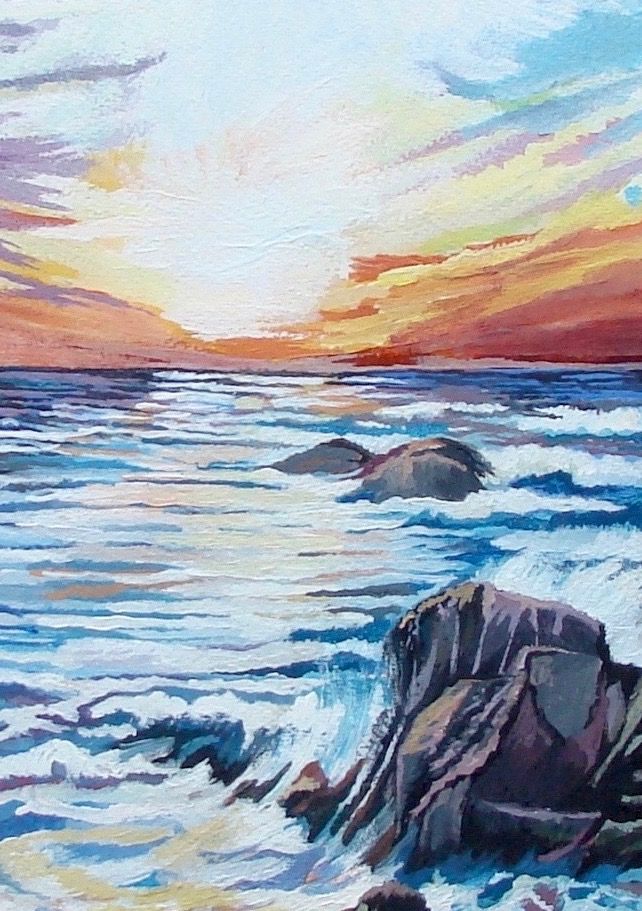 Kaleidoscope Coast is a mixed media painting that depicts the wealth of colour, that emits from a sunset on the Pembrokeshire Coastline. The original photograph was taken by myself using a high sensitive light setting.