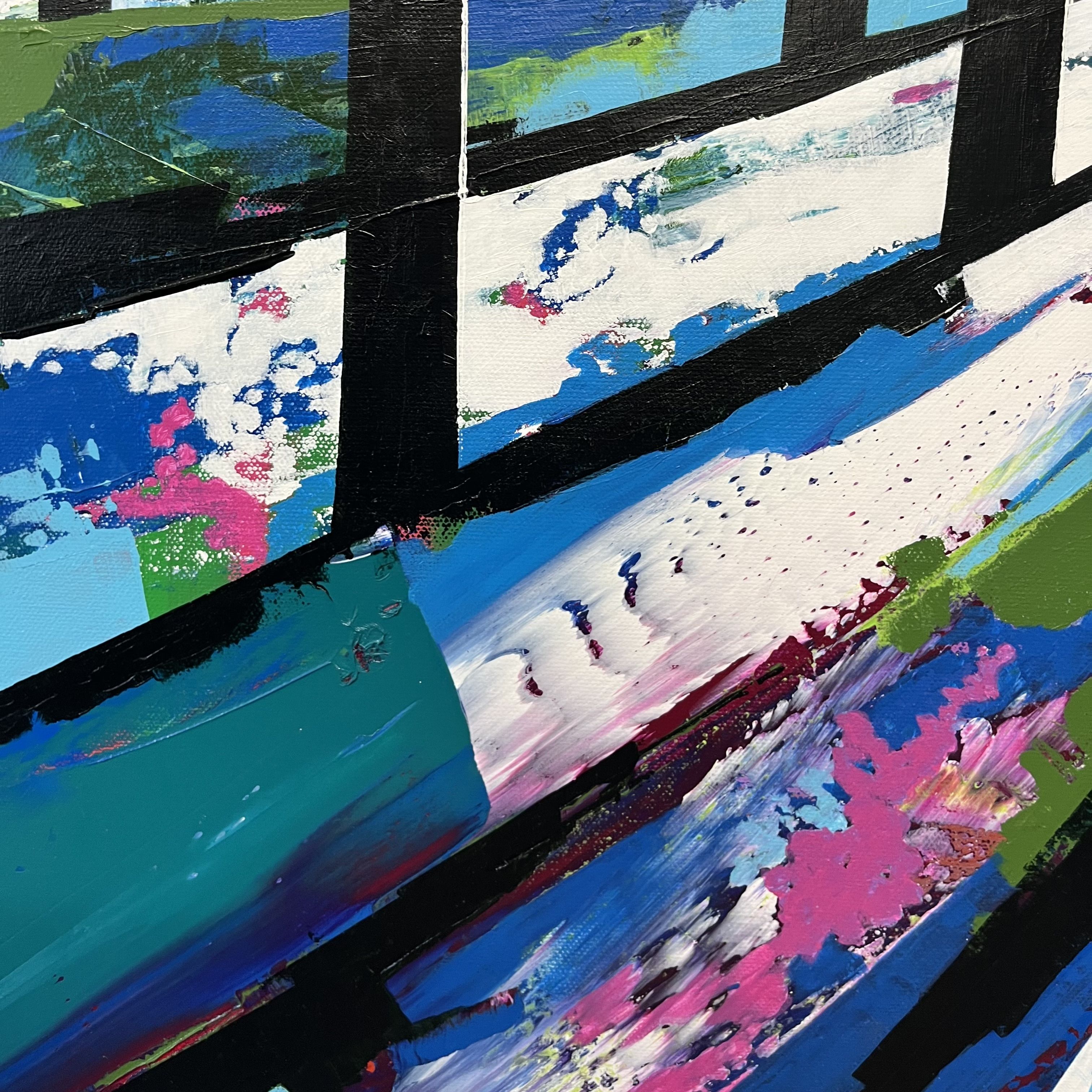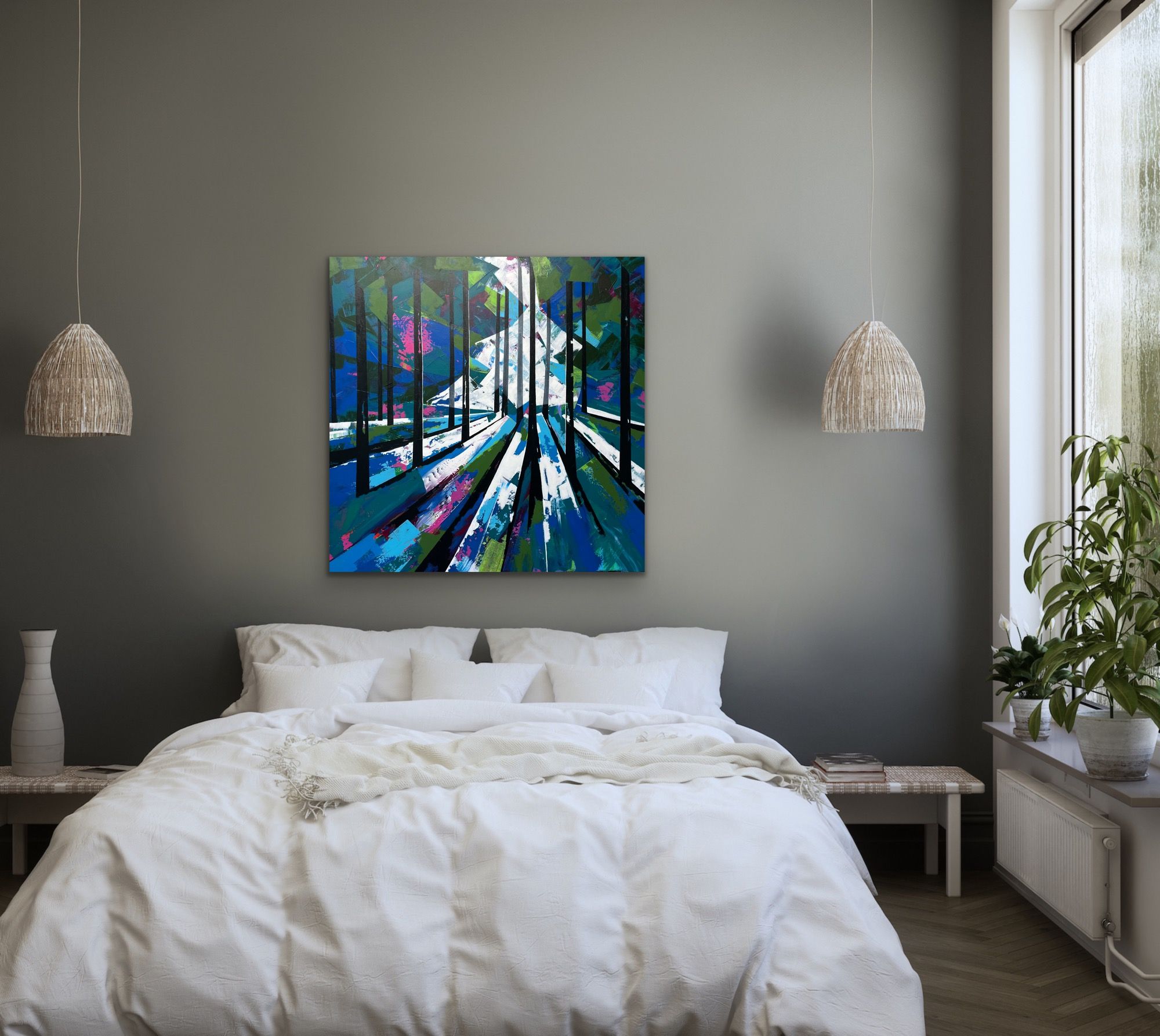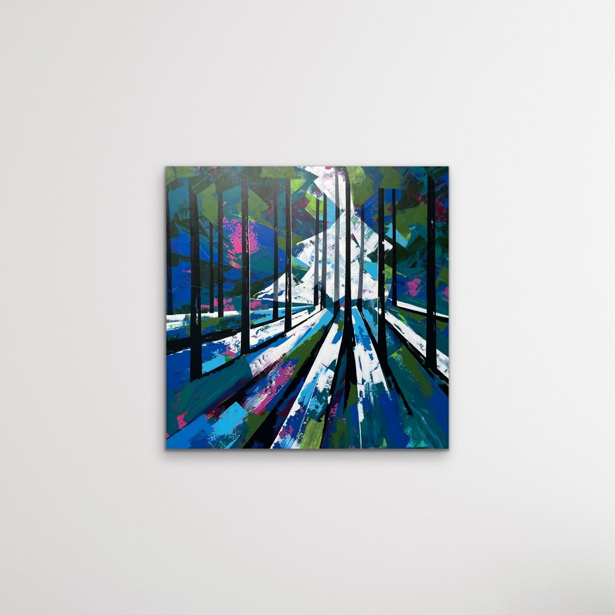 Bluebells are always a stunning muse and the woodlands around me hold a certain kind of magic. These pieces are still in my geometric style but instead of a brush I use a credit card to build layers of paint before I add the powerful trees. ADDITIONAL INFORMATION:Acrylic paint on Canvas91