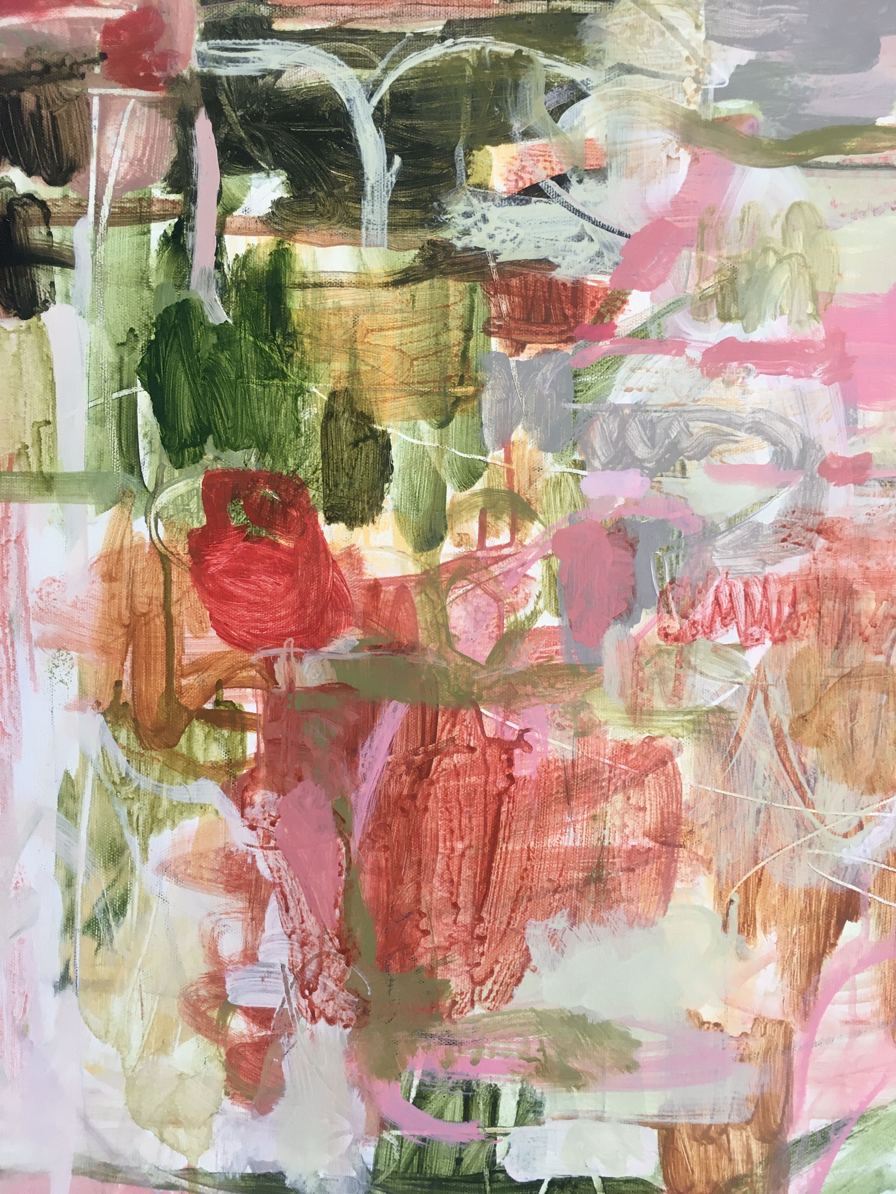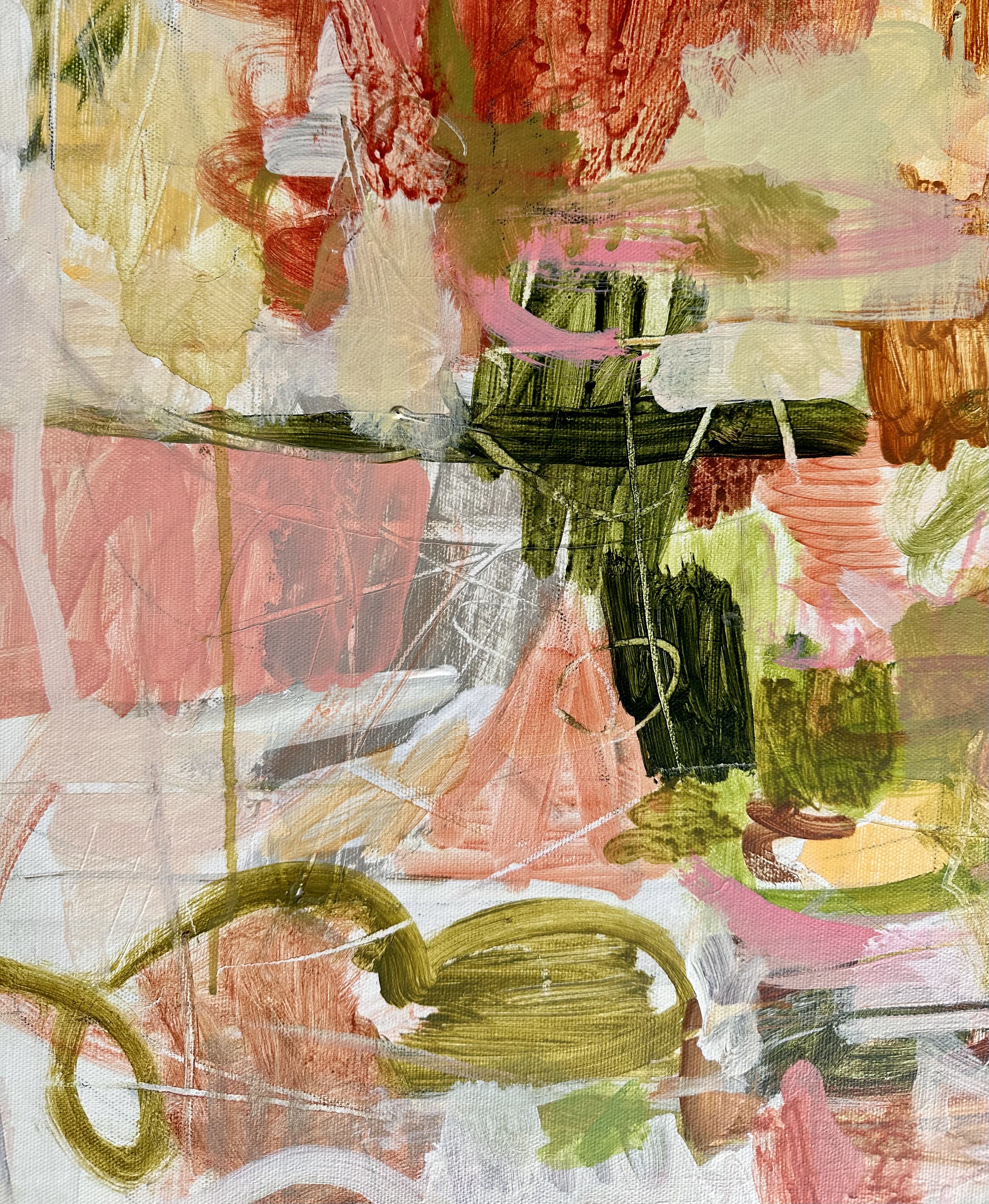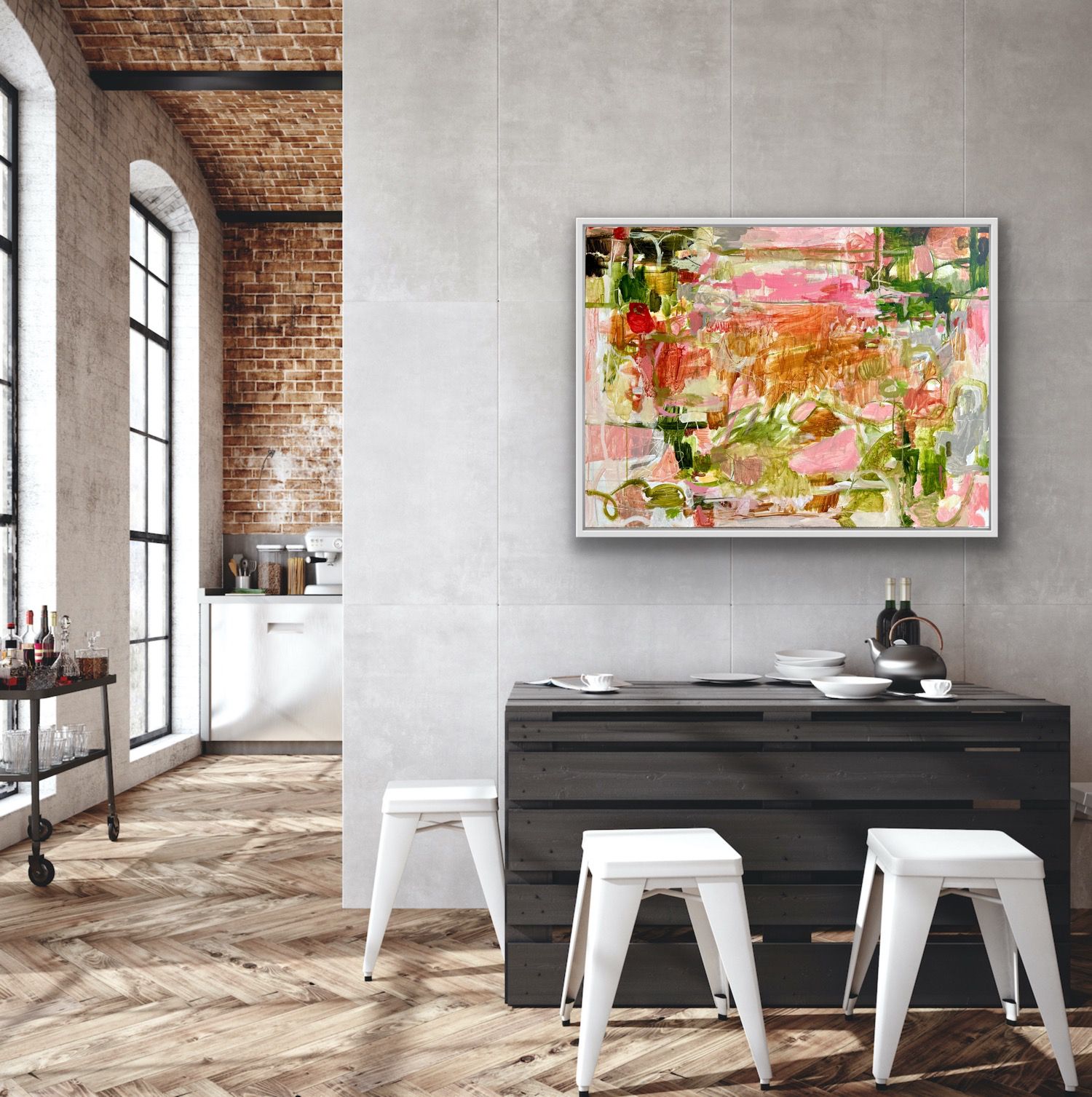 Dilly Dallying is an original abstract painting by Janet Keith. Dilly Dallying is a colourful, expressive, gestural painting perhaps evoking the feeling of an abundant garden or landscape. The painting is built up of veils of colour, scribbles and scratches.There is a variety of mark making and contrasting areas of