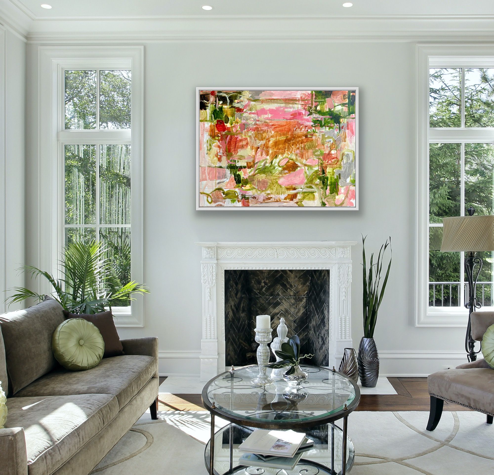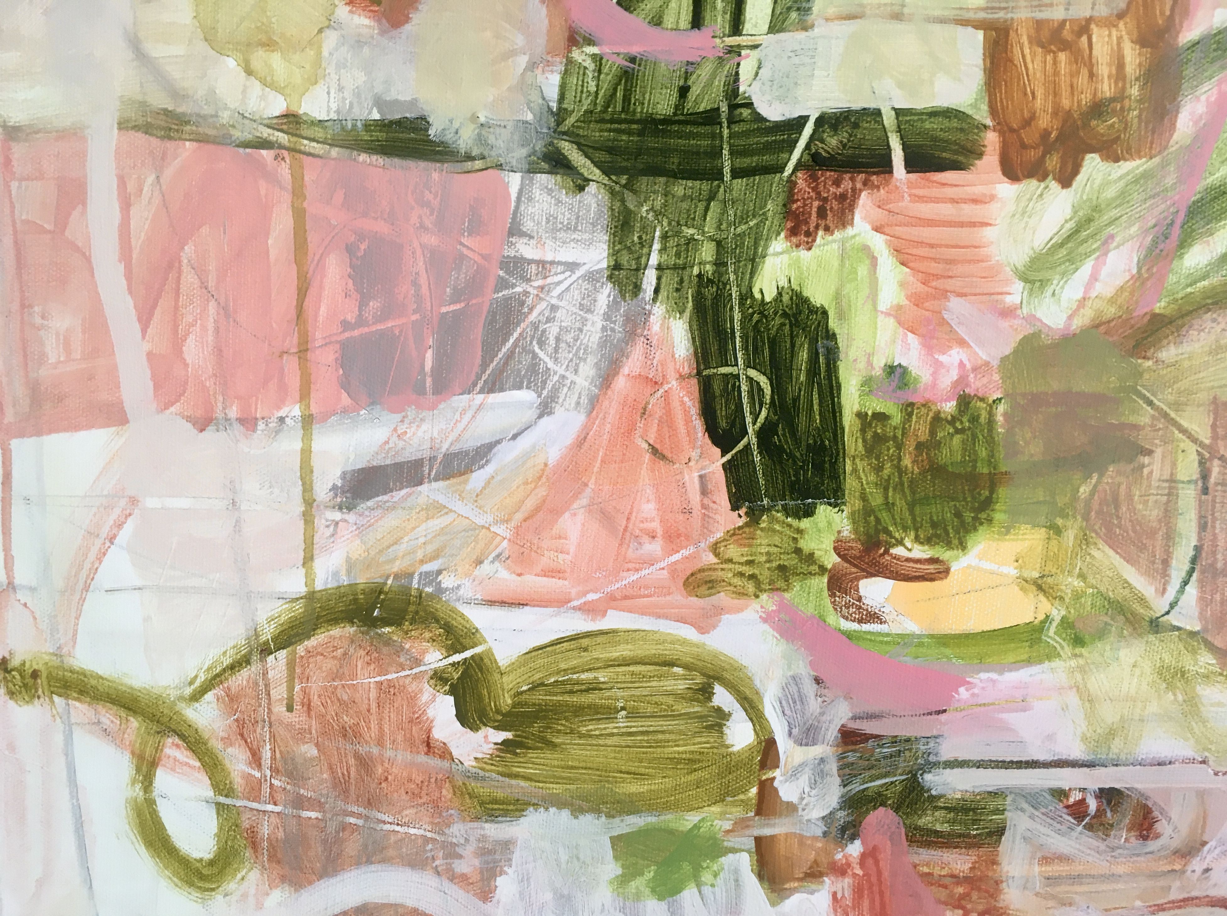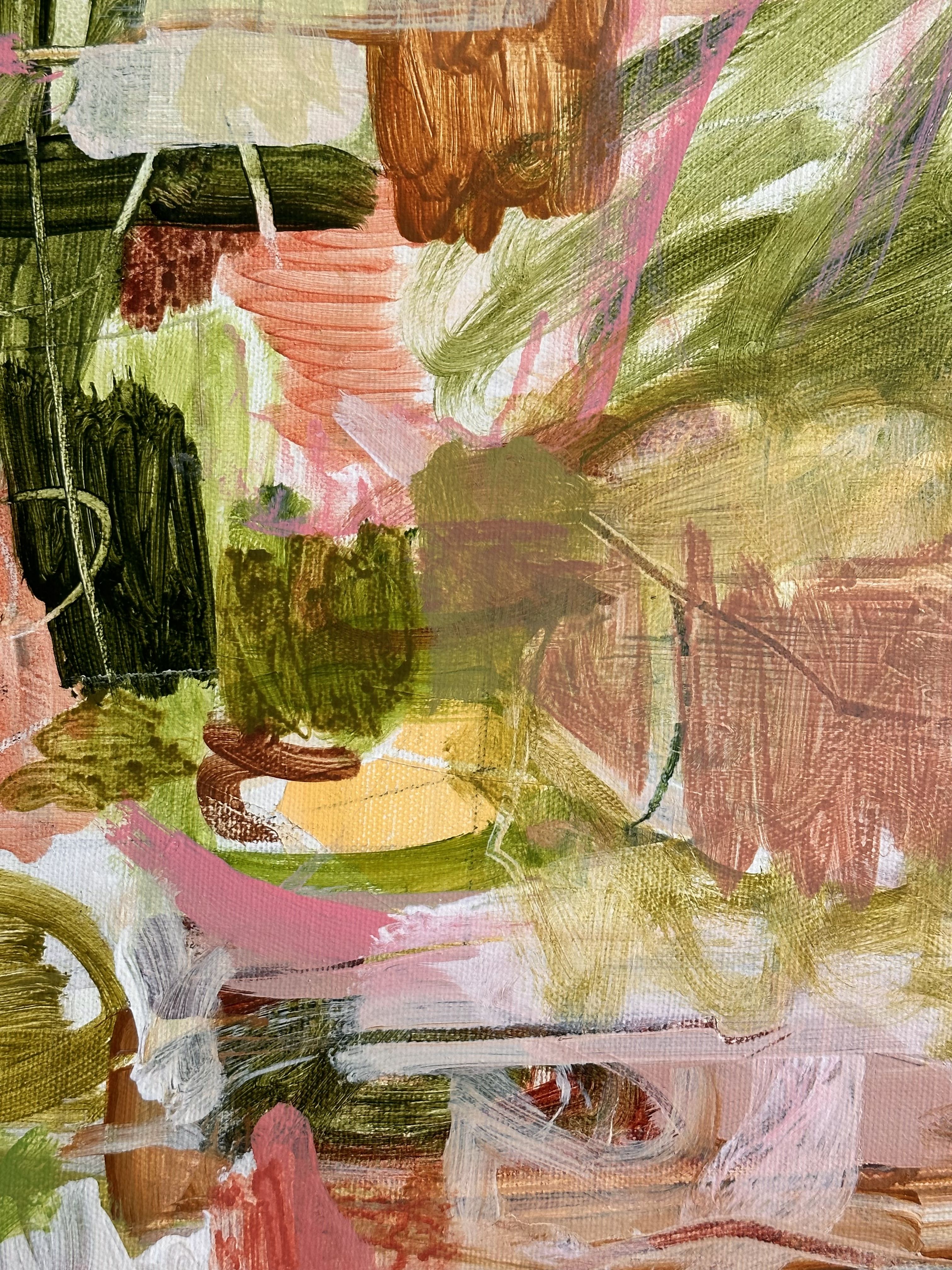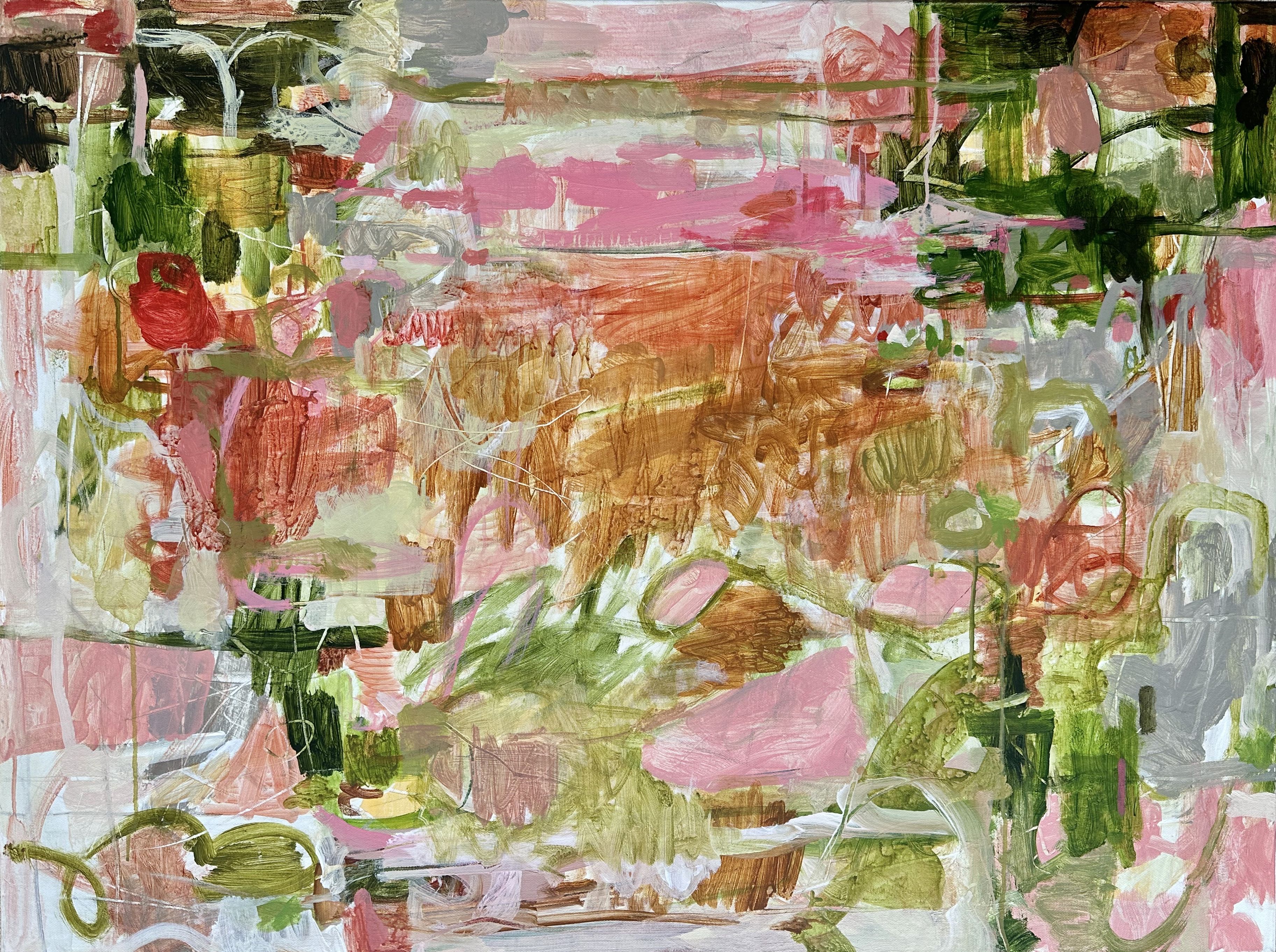 Dilly Dallying is an original abstract painting by Janet Keith. Dilly Dallying is a colourful, expressive, gestural painting perhaps evoking the feeling of an abundant garden or landscape. The painting is built up of veils of colour, scribbles and scratches.There is a variety of mark making and contrasting areas of