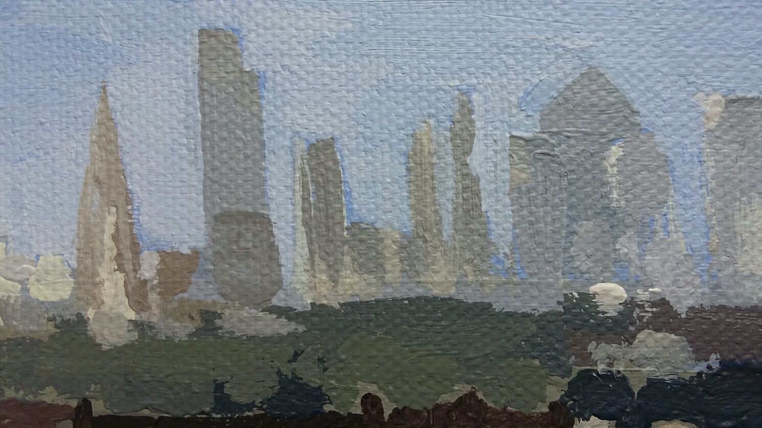 Dinky postcard sized depiction of the London Skyline from a vantage point in Honor Oak Park, London