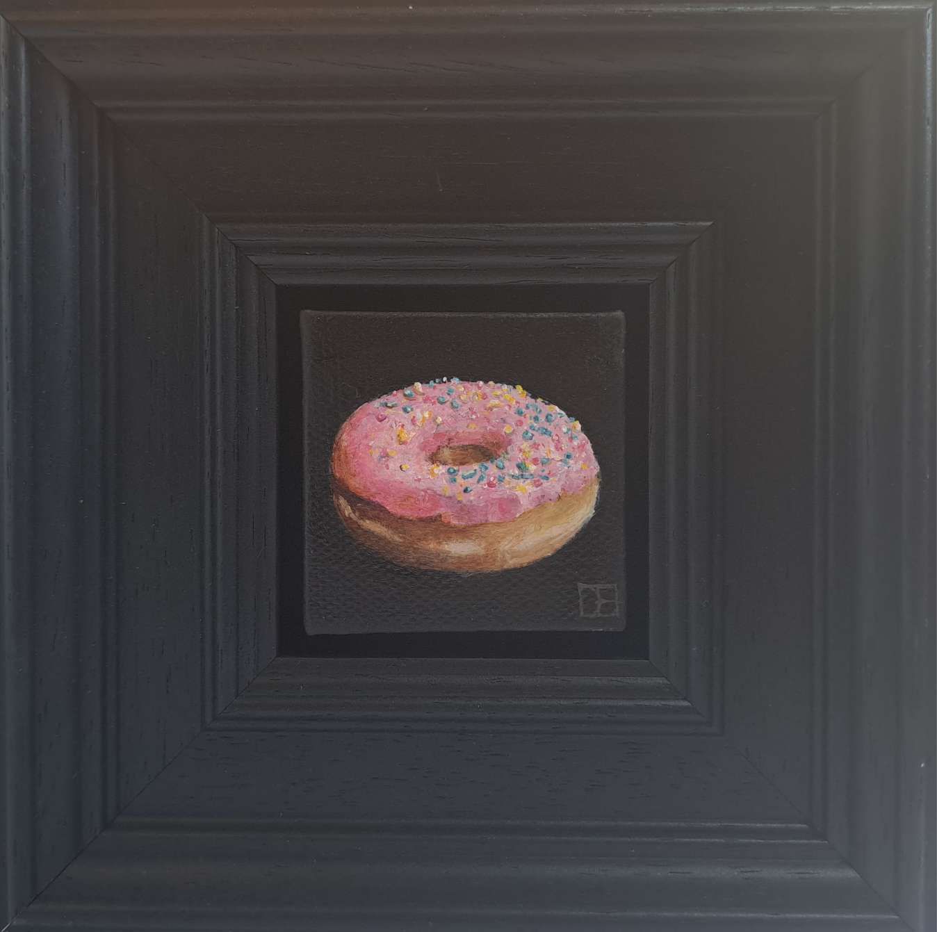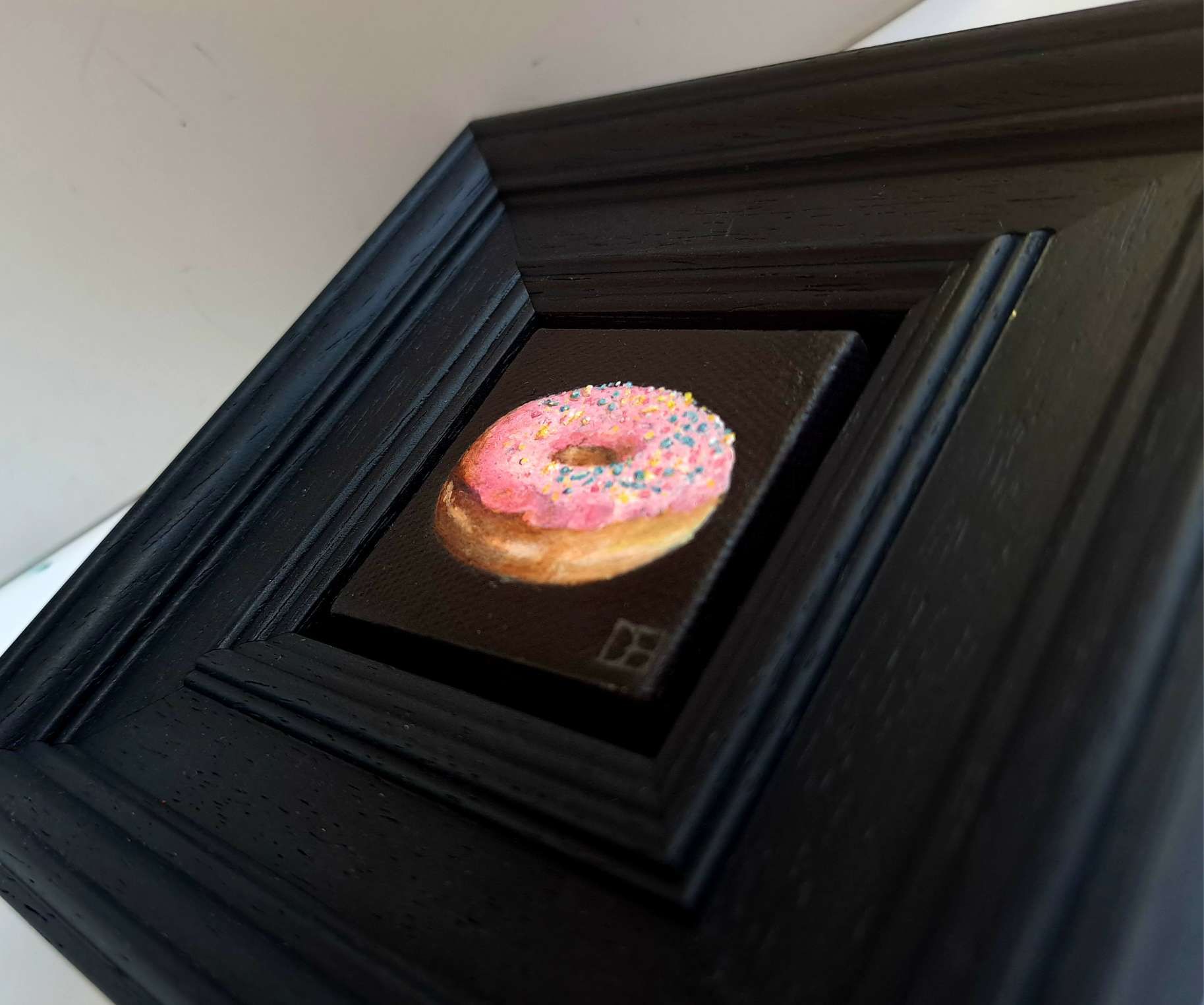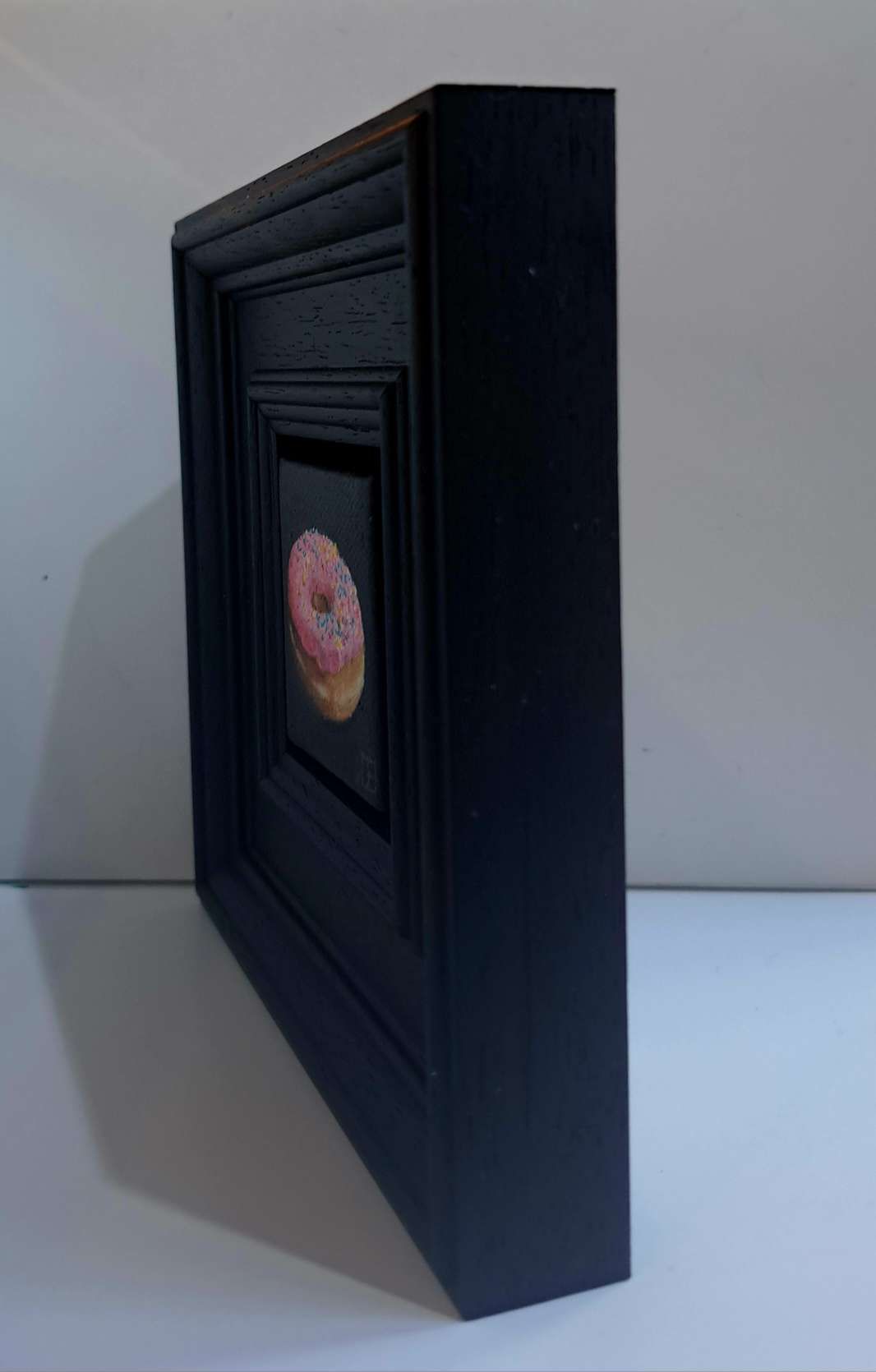 Pocket Doh-Nut 3c is an original oil painting by Dani Humberstone as part of her Pocket painting series featuring small scale realistic oil paintings, with a nod to baroque still life painting. The paintings are set in a black wood layered frame.