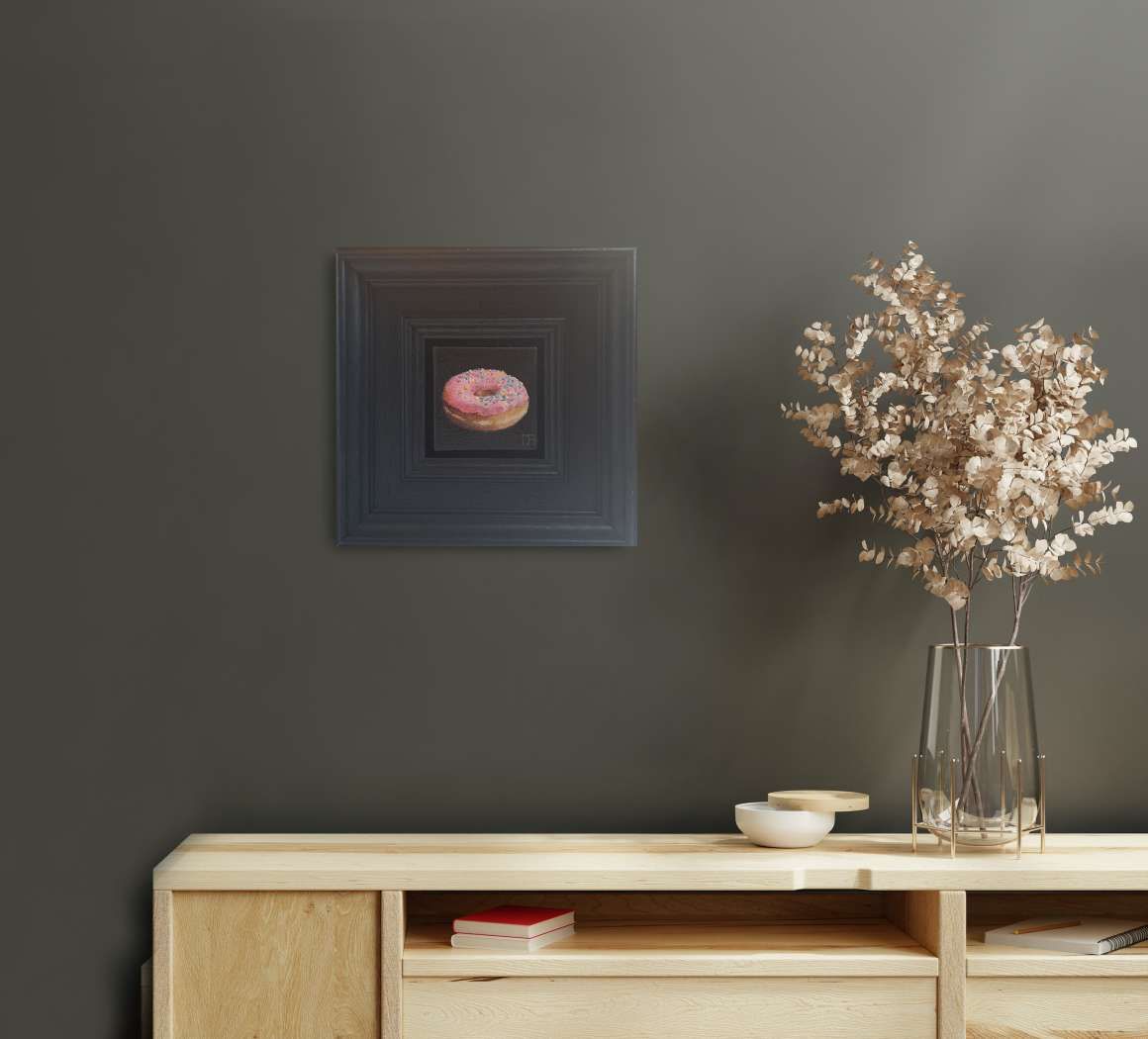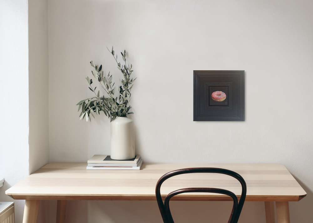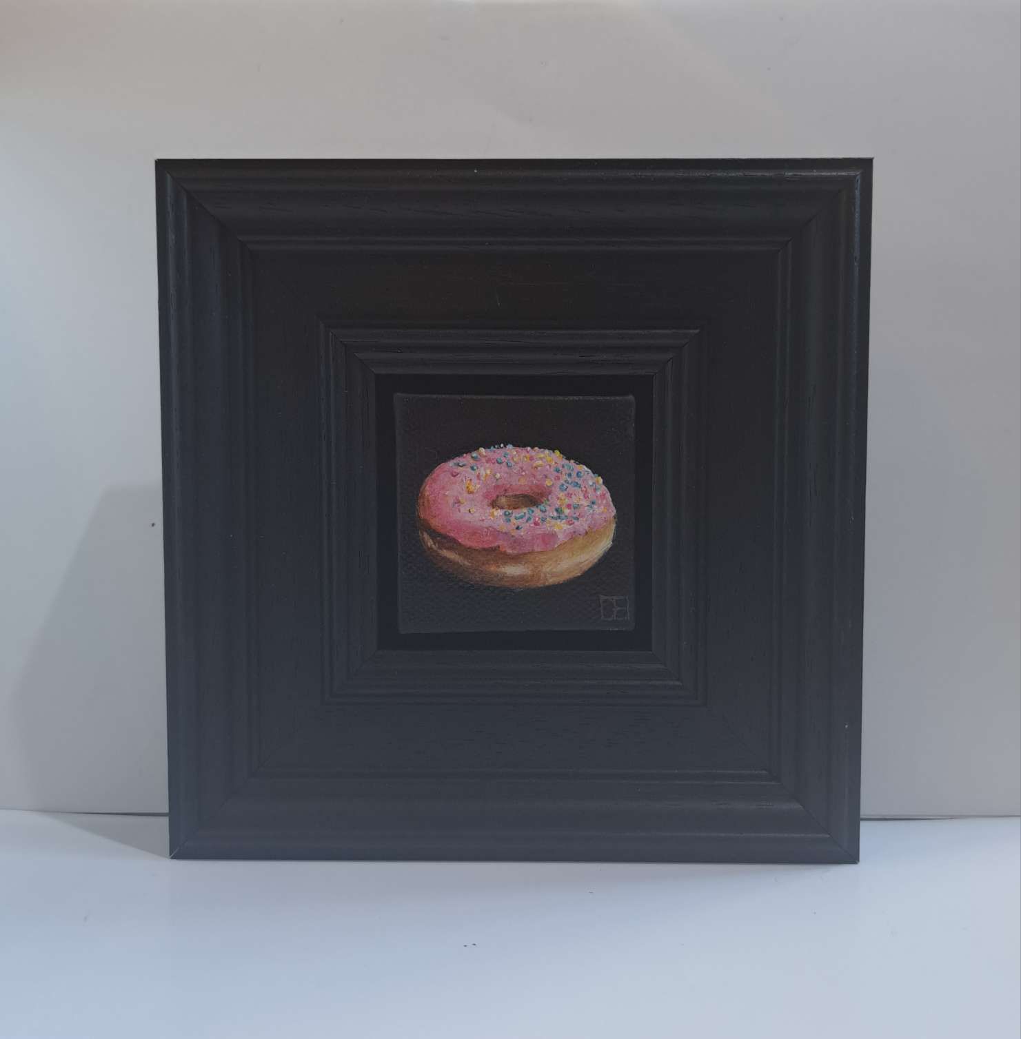 Pocket Doh-Nut 3c is an original oil painting by Dani Humberstone as part of her Pocket painting series featuring small scale realistic oil paintings, with a nod to baroque still life painting. The paintings are set in a black wood layered frame.