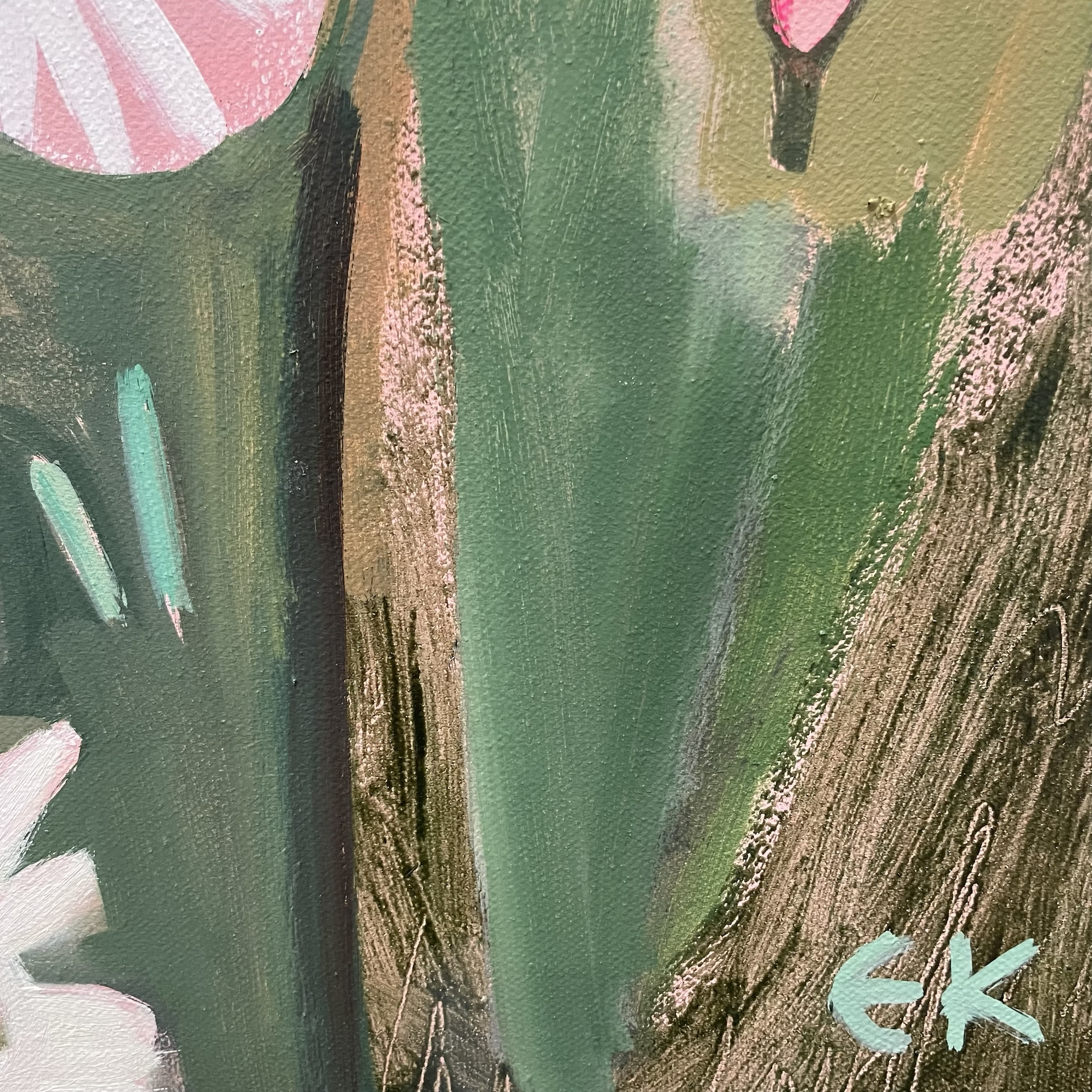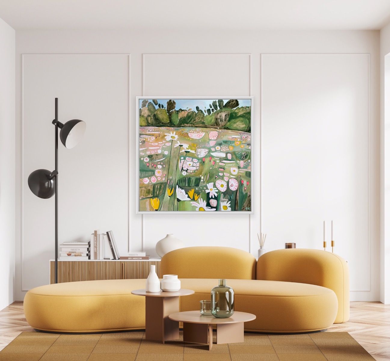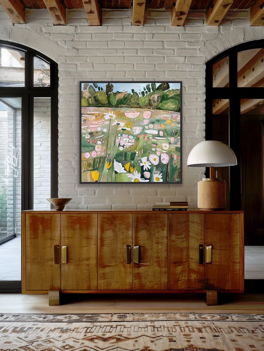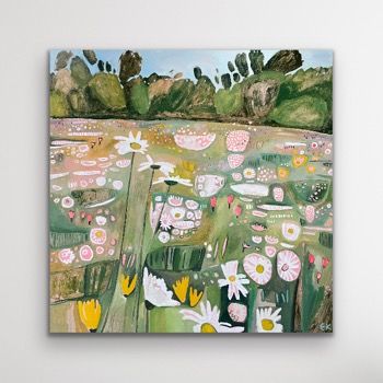 This work is the right hand panel of a pair of painting which form a diptych. The diptych comprises two panels depicting a traditional wildflower meadow in full bloom. Although the paintings could be available separately, the two panels form a continuous landscape when hung side by side. They also