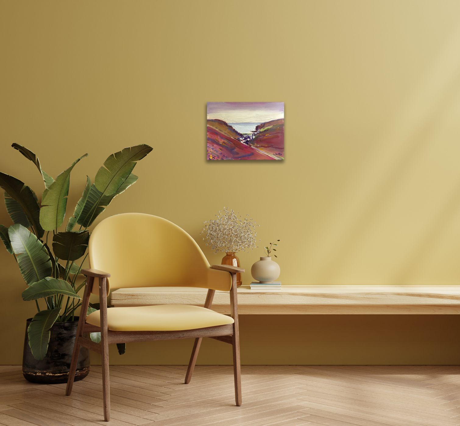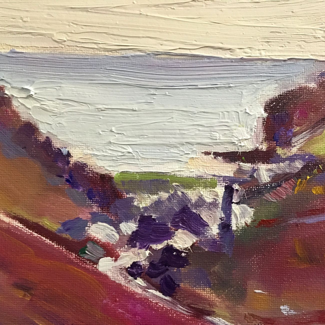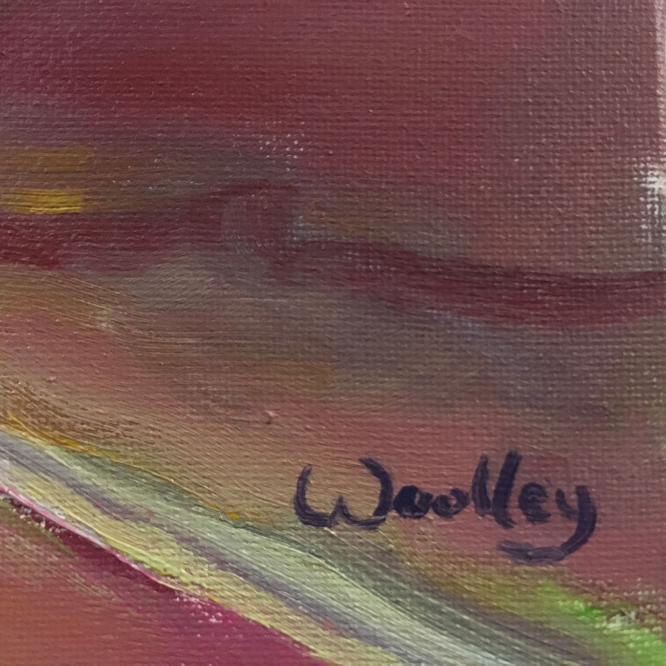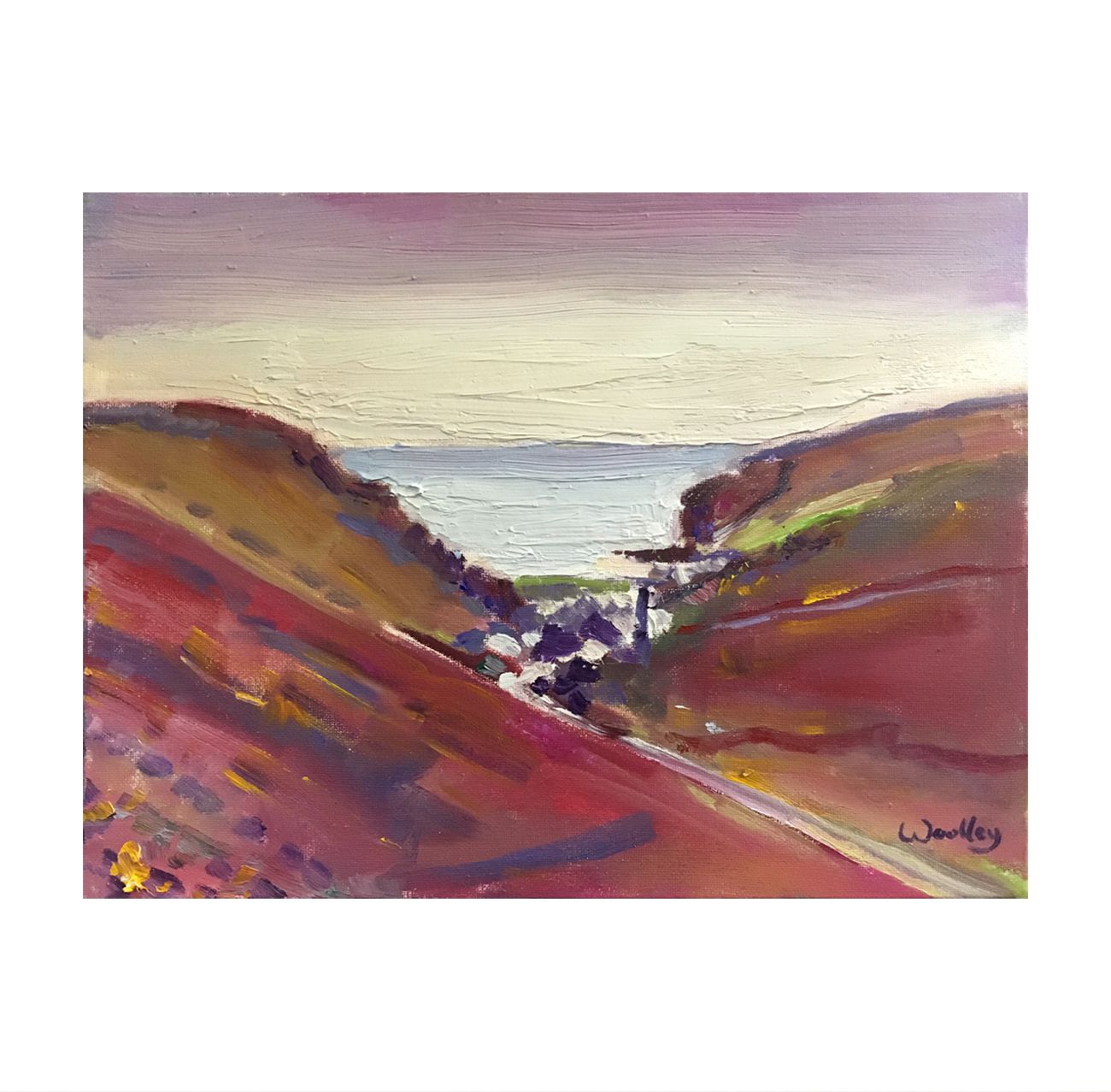 Down to Porthtowan is an original painting by Eleanor Woolley. This painting was painted Plein Air on the footpath down from Mount Pleasant Eco Park. It shows the lovely heather banks of the old copper mining area. Their russet tones depicted here in magenta and ochre. The little town of