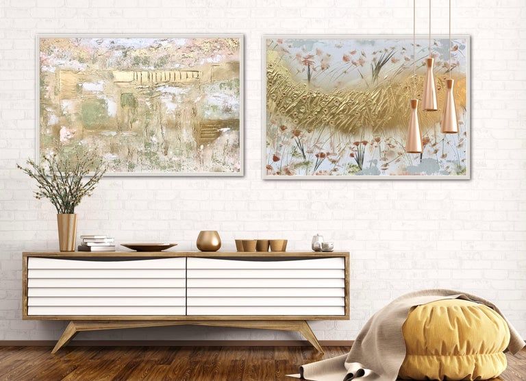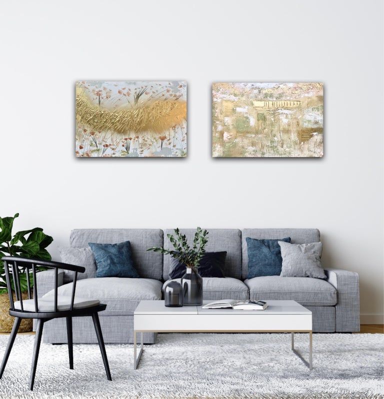 The complete size of this diptych is 120cm x 90cm x 4cm Dreaming Of Cherry Blossoms by Sarah Berger [2021] original Acrylic on stretched canvas Image size: H:60 cm x W:90 cm Complete Size of Unframed Work: H:60 cm x W:90 cm x D:4cm Sold Unframed Please note that insitu images are purely an indication of