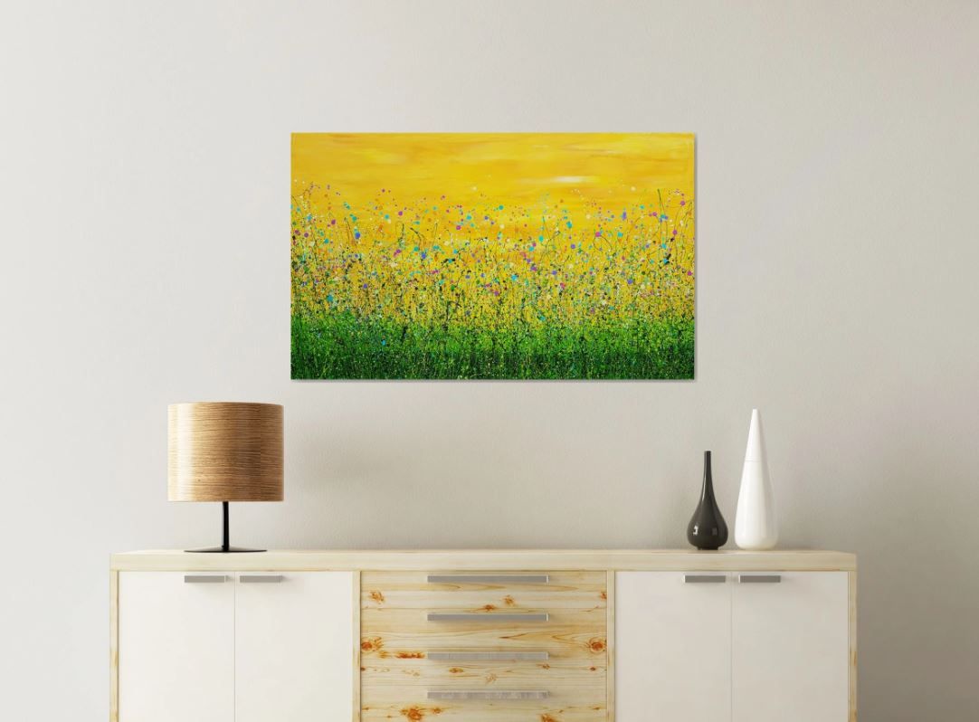 Dreams Gone By - A whimsical meadow bursting with Sunshine. An Original semi-abstract painting by Lucy Moore. Using her signature string grass technique Lucy has created a semi-abstract twist to her classic meadow paintings. Colourful yellow flowers beneath a sunlit skyline. This piece would brighten any home or office, bring