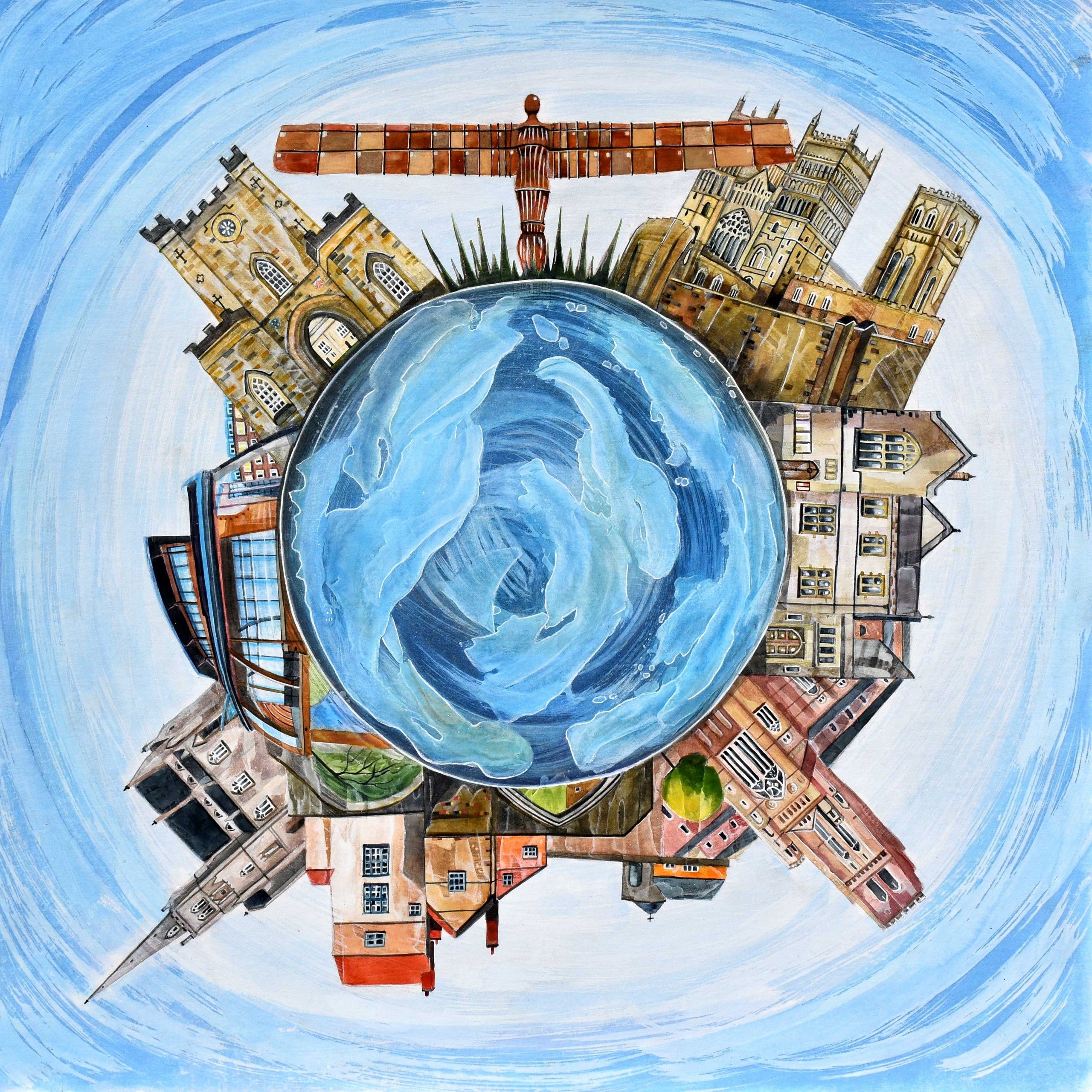Durham World is a limited edition print by Anya Simmons, inspired by the Angel of the North and the beautiful city of Durham. This Giclée limited edition print is created using archive quality fine art paper and pigment inks. It comes beautifully mounted with a white border. The approximate size stated