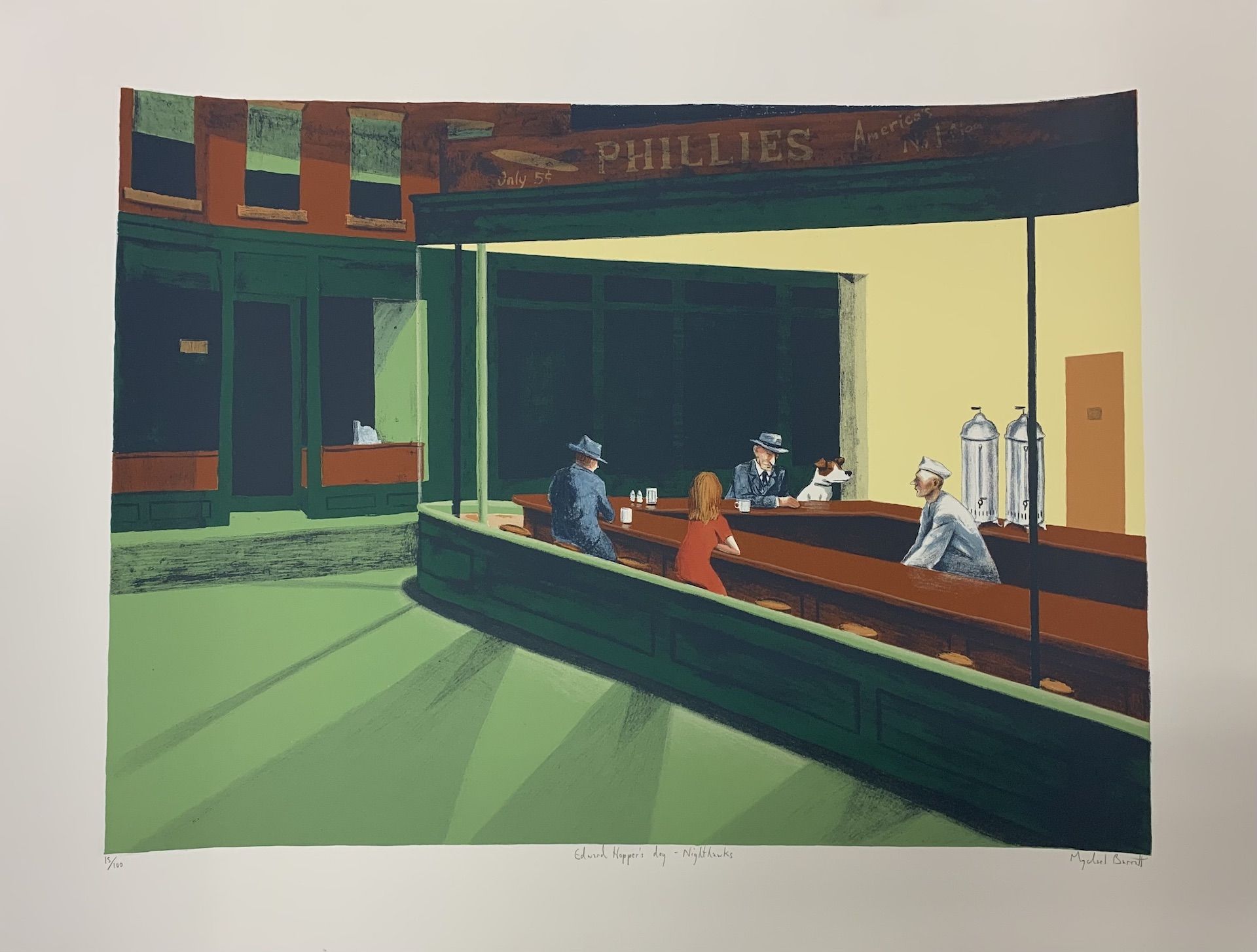 Edward Hopper's Dog - Nighthawks by Mychael Barratt is a limited edition print of Edward Hopper and his dog at a diner