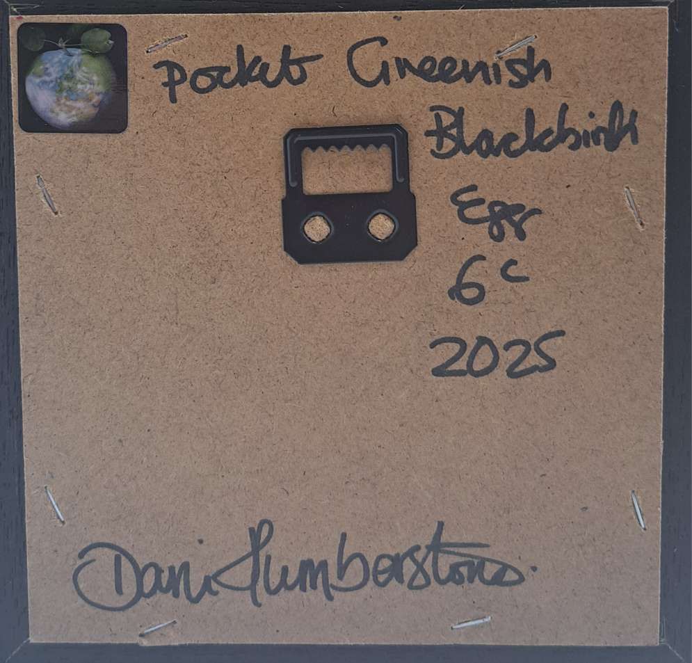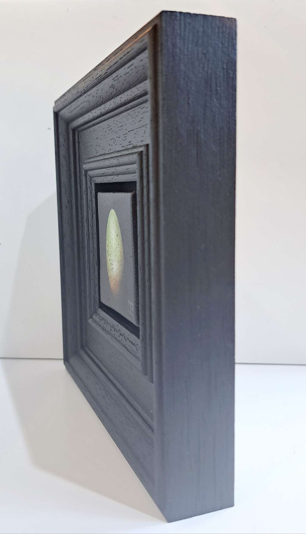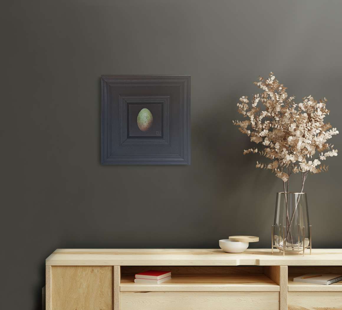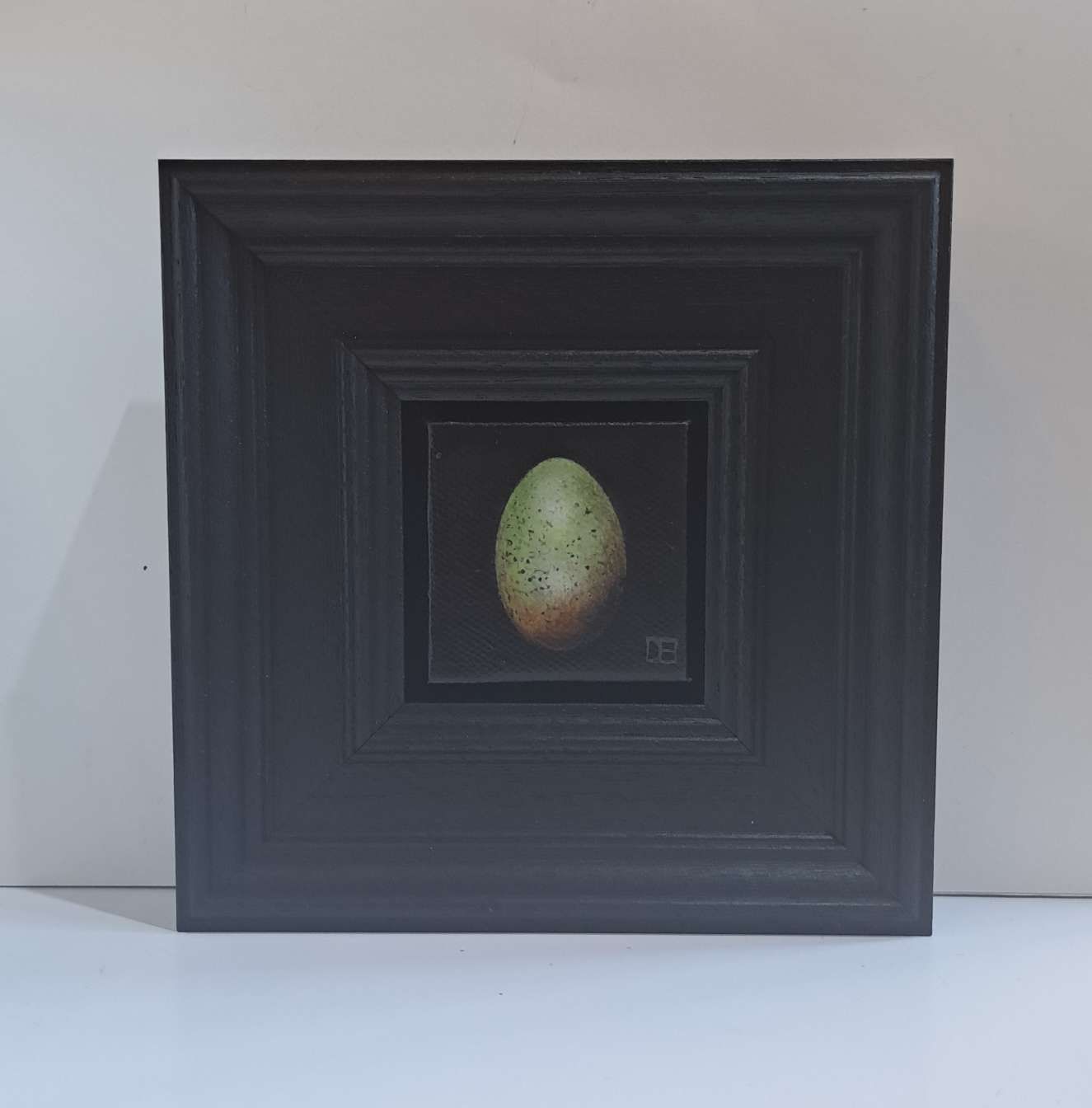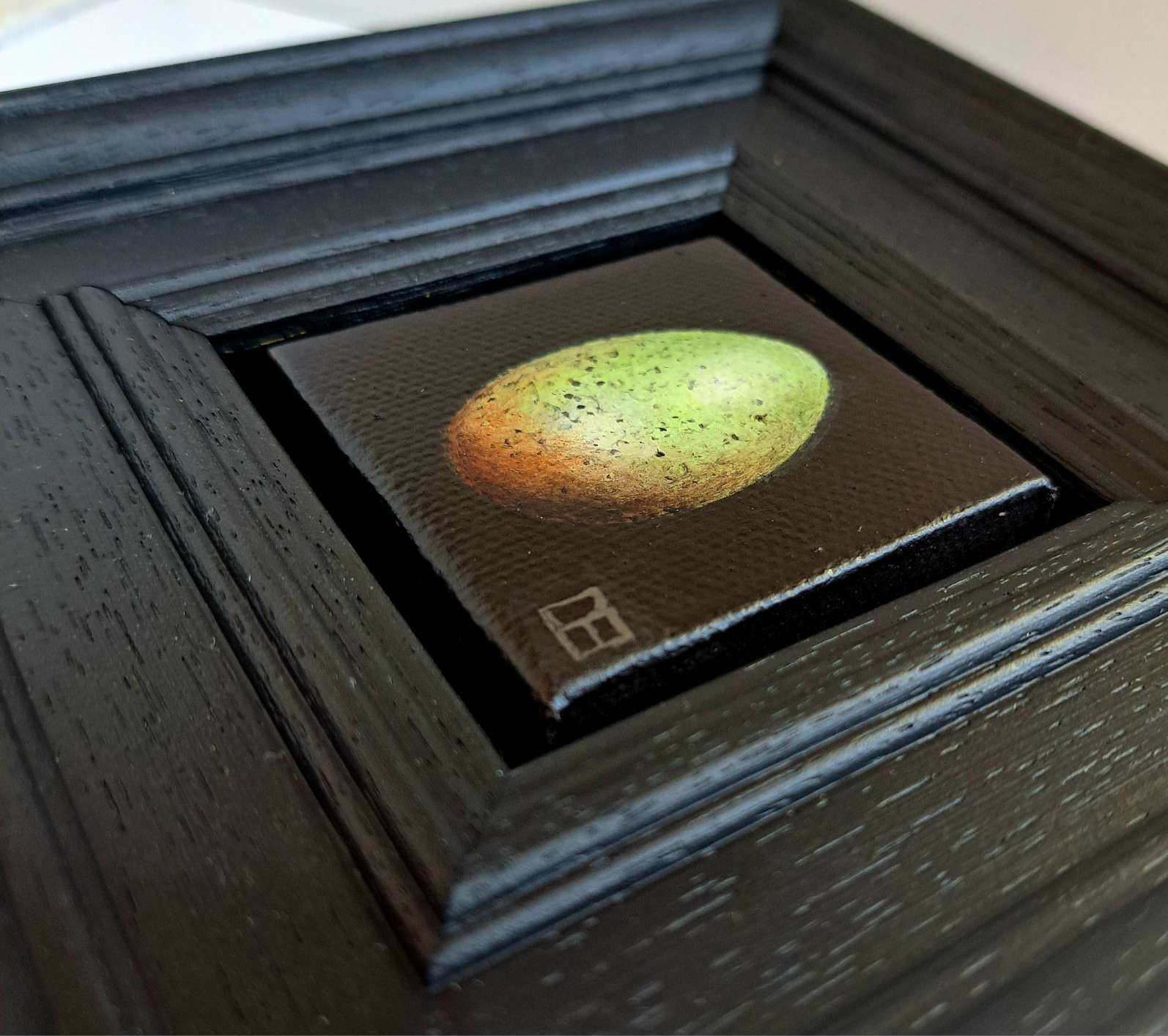 Pocket Greenish Blackbird's Egg 6c is an original oil painting by Dani Humberstone as part of her Pocket painting series featuring small scale realistic oil paintings, with a nod to baroque still life painting. The paintings are set in a black wood layered frame.