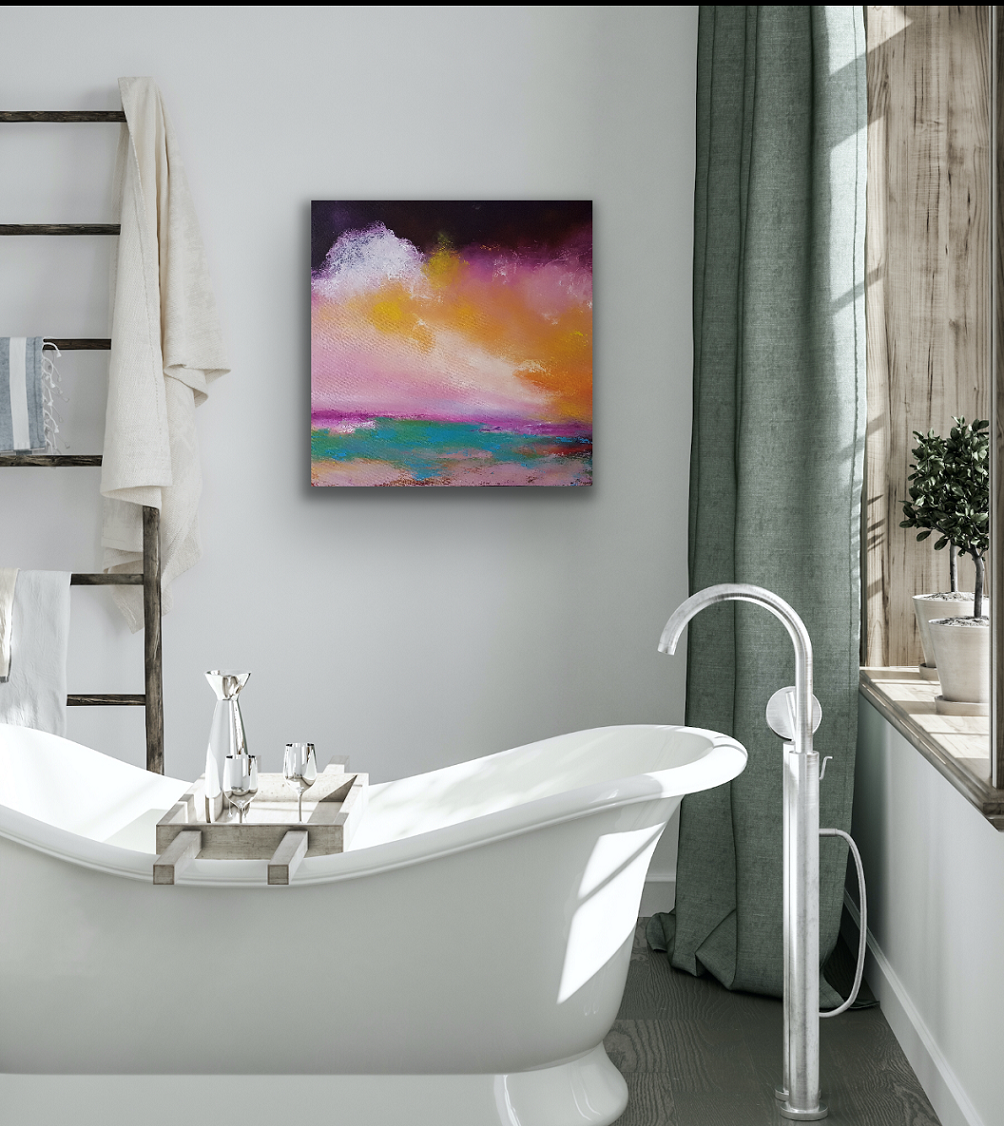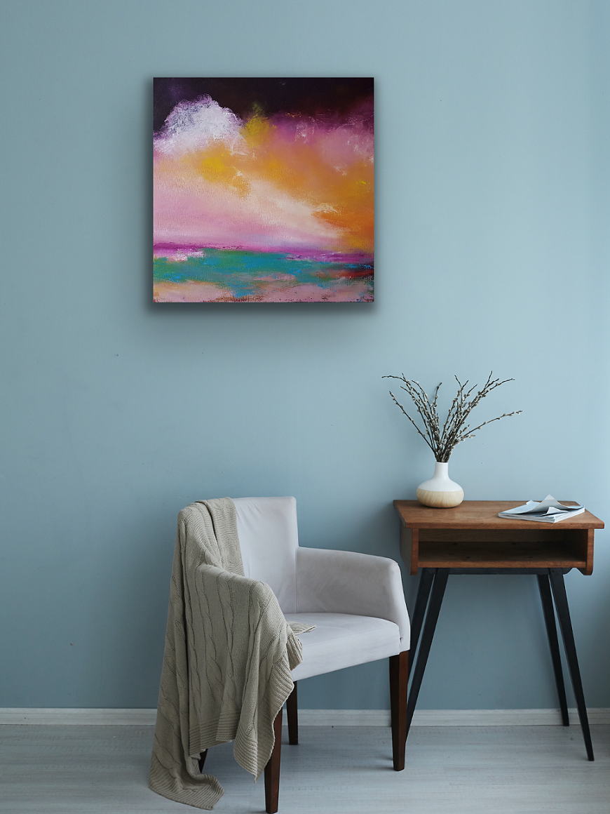 I am seduced by colour and this is an abstract interpretation of a seascape inspired by a visit to St, Ives in Cornwall, where the light is constantly changing.