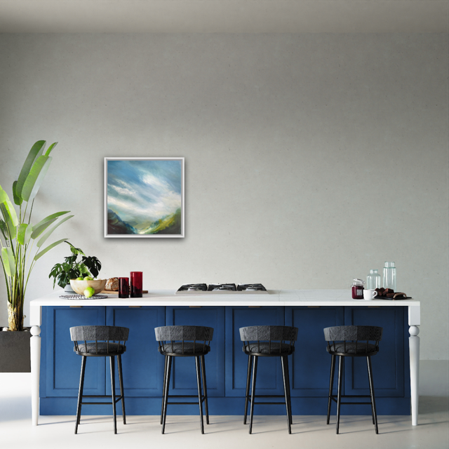 A painting reminiscent of the valleys and mountains on Skye the Hebrides are inspiring with the dramatic landscapes with deep valleys and soaring mountains. There is an atmosphere of quiet beauty. This work was completed after a trip to Skye and what struck me it the ever changing light on
