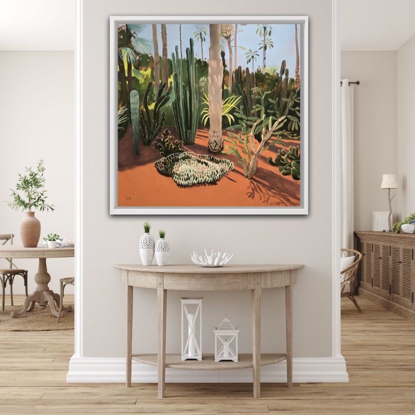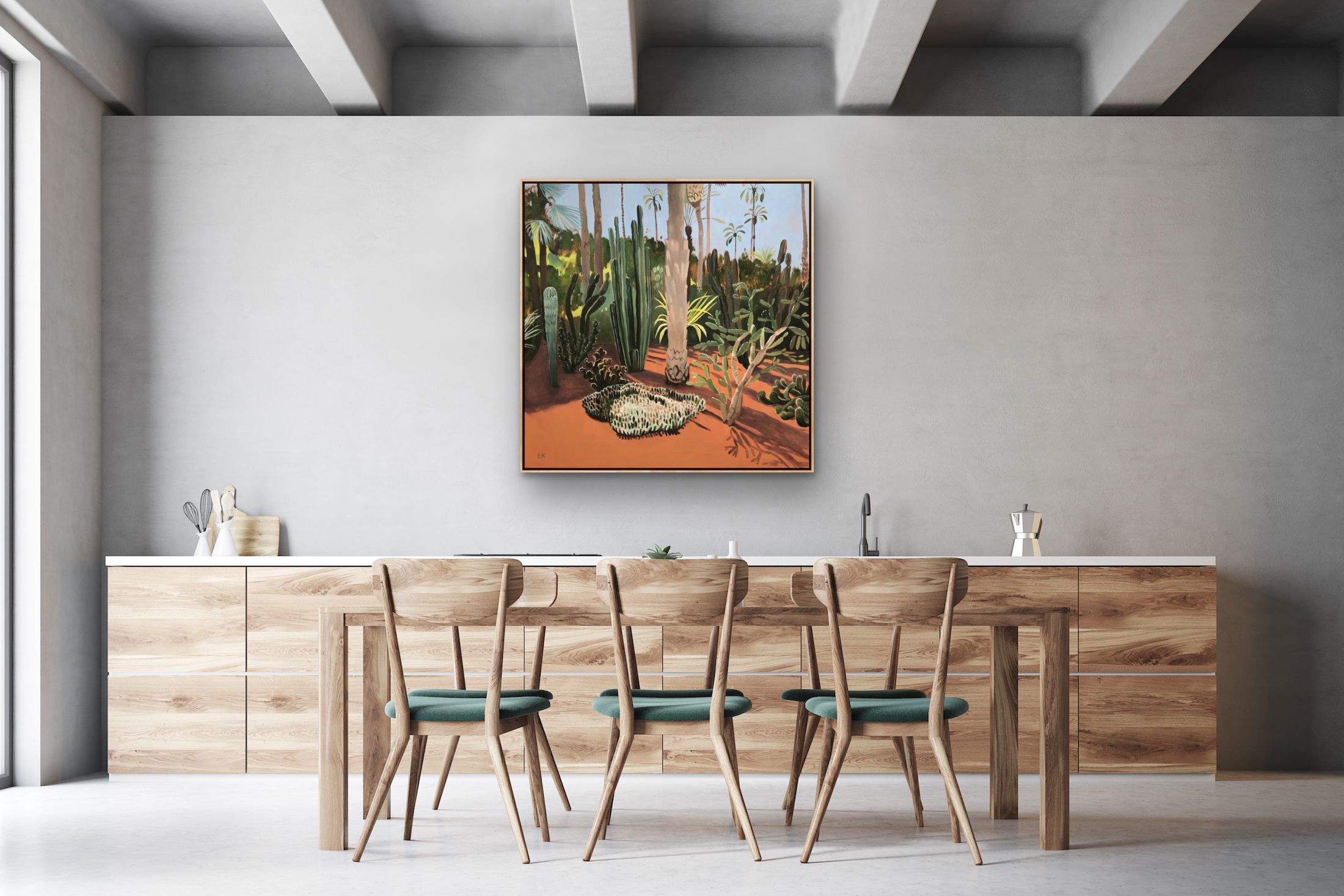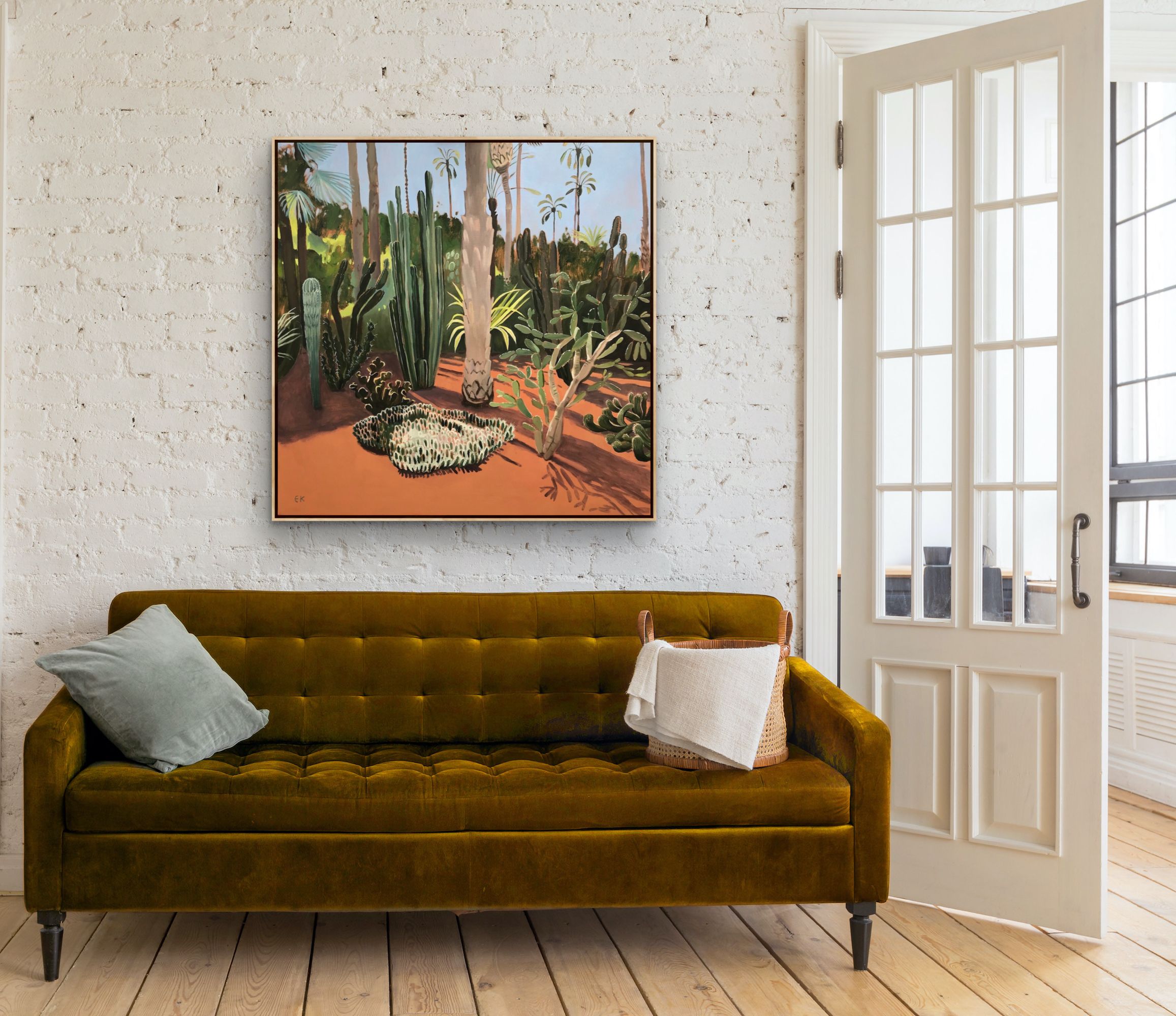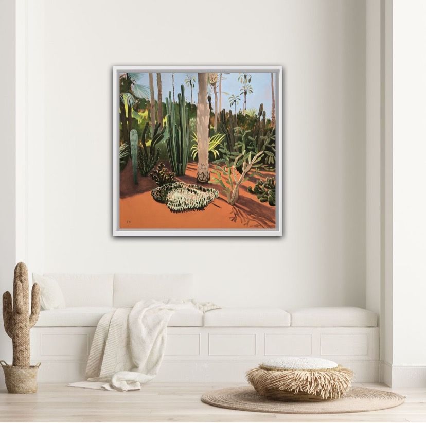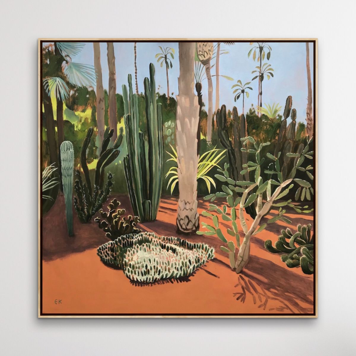 This is a stylized representation of the lush planting of sub-tropical palms and cacti at the Majorelle Gardens in Morocco. Yves Saint-Laurent and Pierre Bergé restored the botanical gardens and lived in the villa there. It is painted on a red-ochre ground to represent the colours of the hot baked