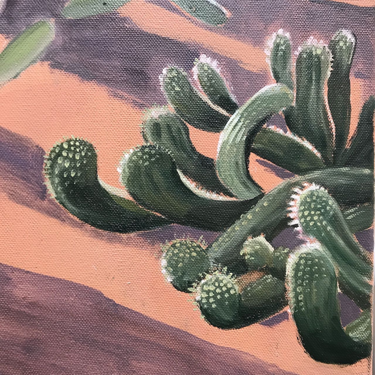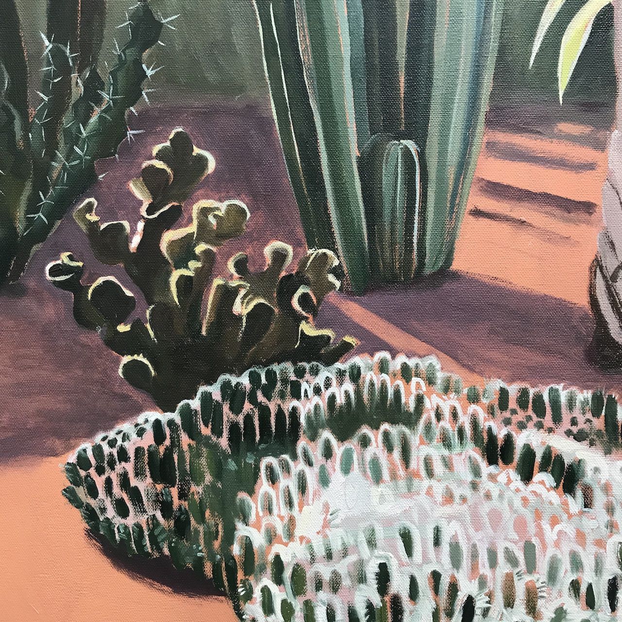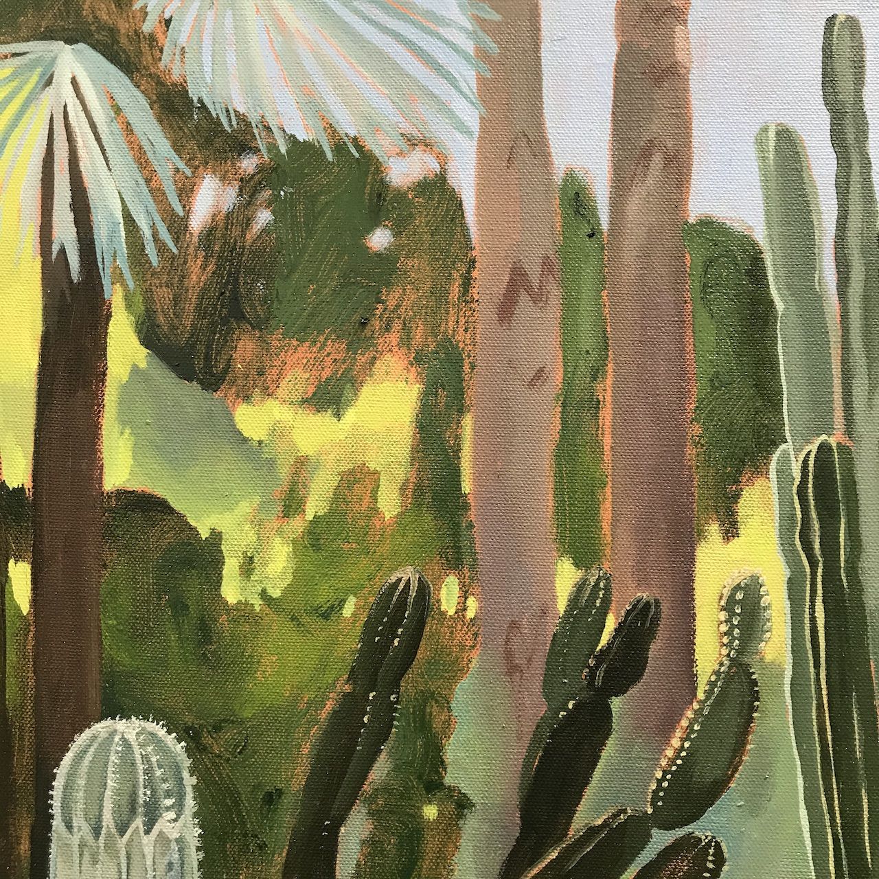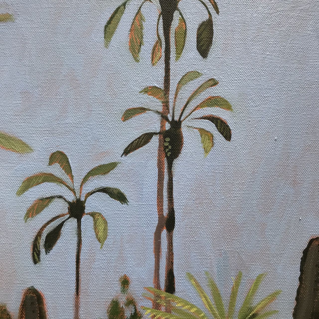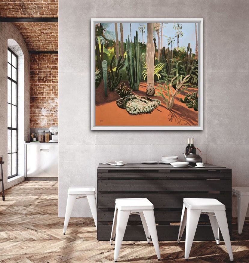 This is a stylized representation of the lush planting of sub-tropical palms and cacti at the Majorelle Gardens in Morocco. Yves Saint-Laurent and Pierre Bergé restored the botanical gardens and lived in the villa there. It is painted on a red-ochre ground to represent the colours of the hot baked