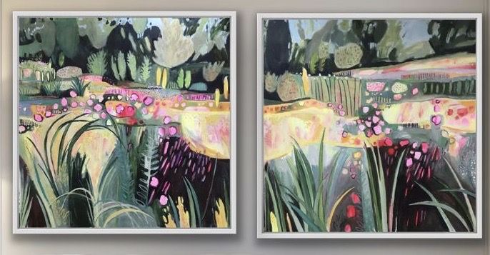 SOLD BUT Red Hot border I is still available (as of 17th April 2024) - please see listing This is a bright jazzy pair of paintings intended to form a diptych, but see also Red Hot BorderI and Red Hot Border II showing the separate panels. The paintings may be hung