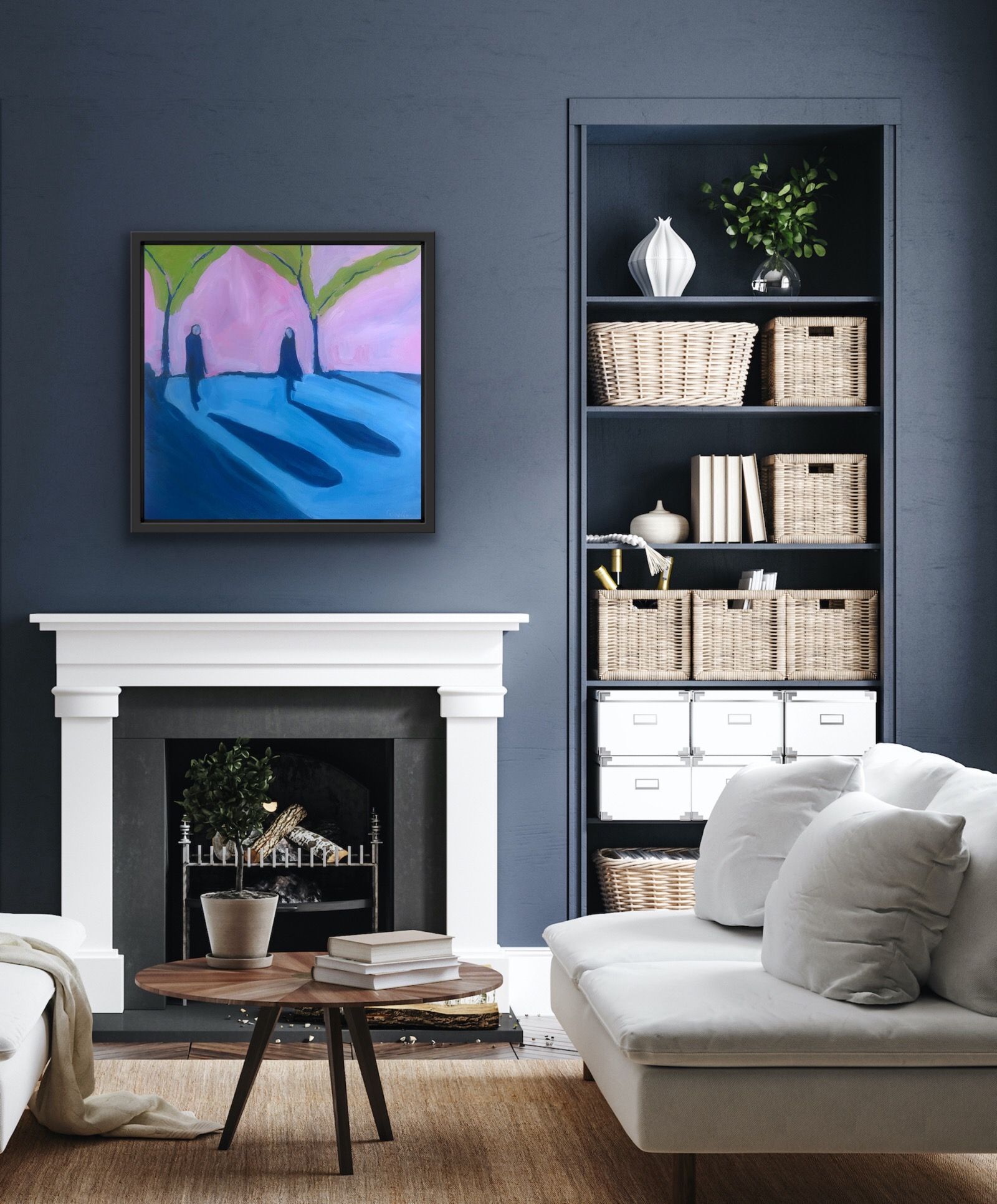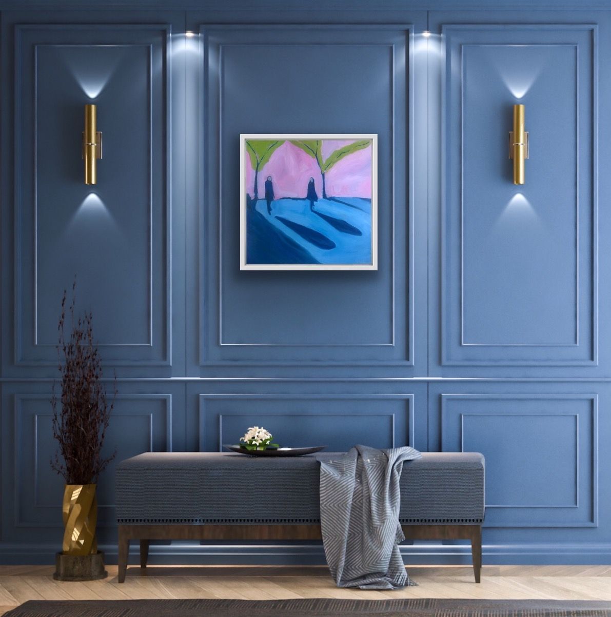 Winter Shadows 27 is an Original Painting by Eleanor Woolley. Insitu Pictures show Winter Shadows 27 with Winter Shadows 26. Winter Shadows 27 depicts the long winter shadows cast by the shoppers on the streets of Cheltenham. It is inspired by the feelings of isolation during Lock Down, when the streets became