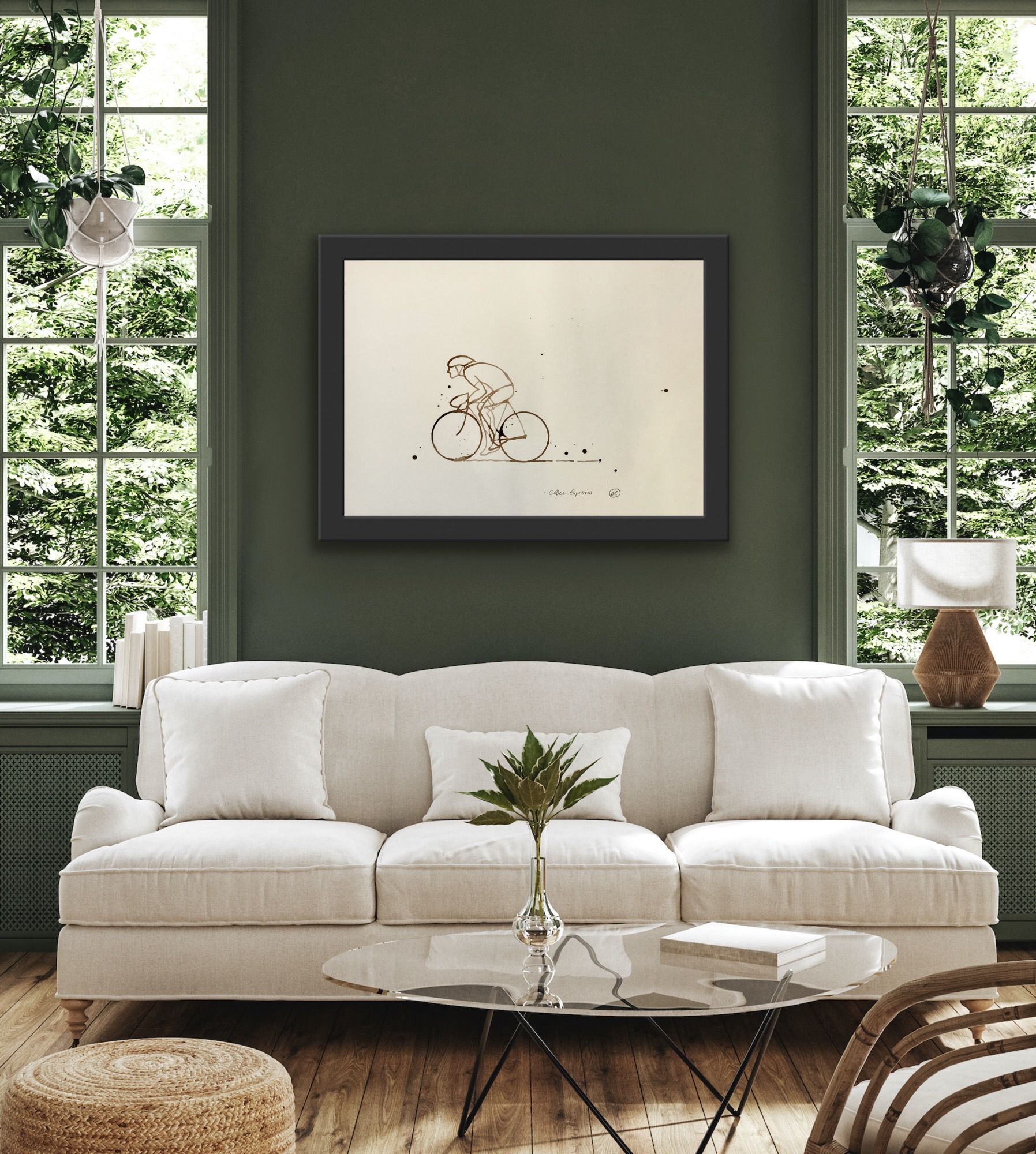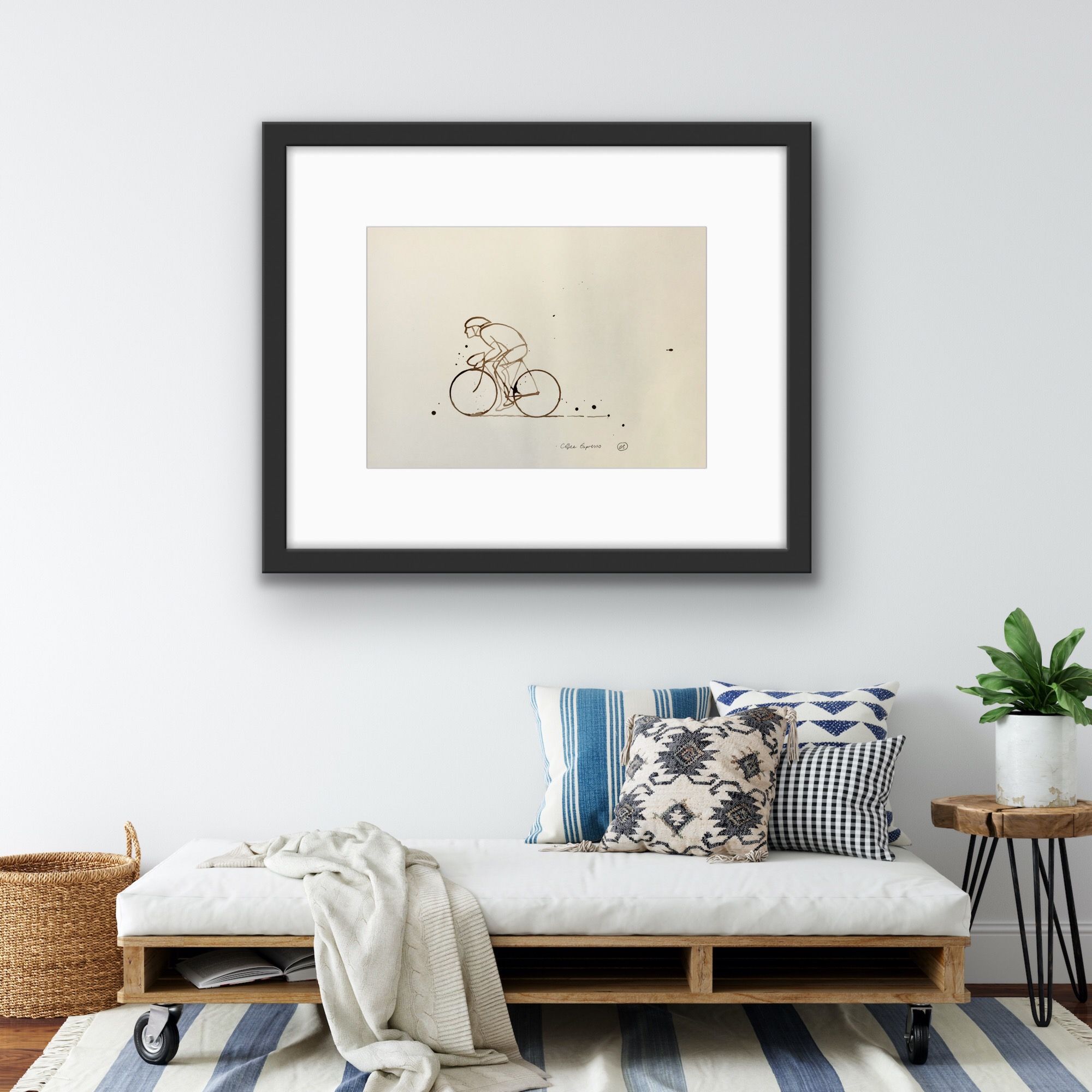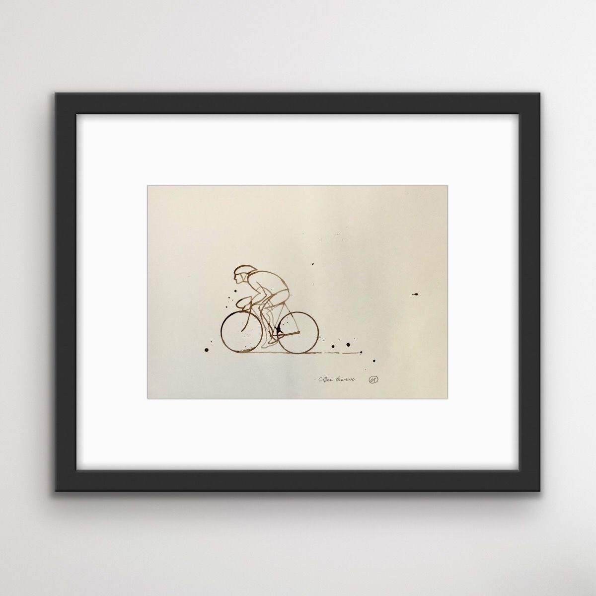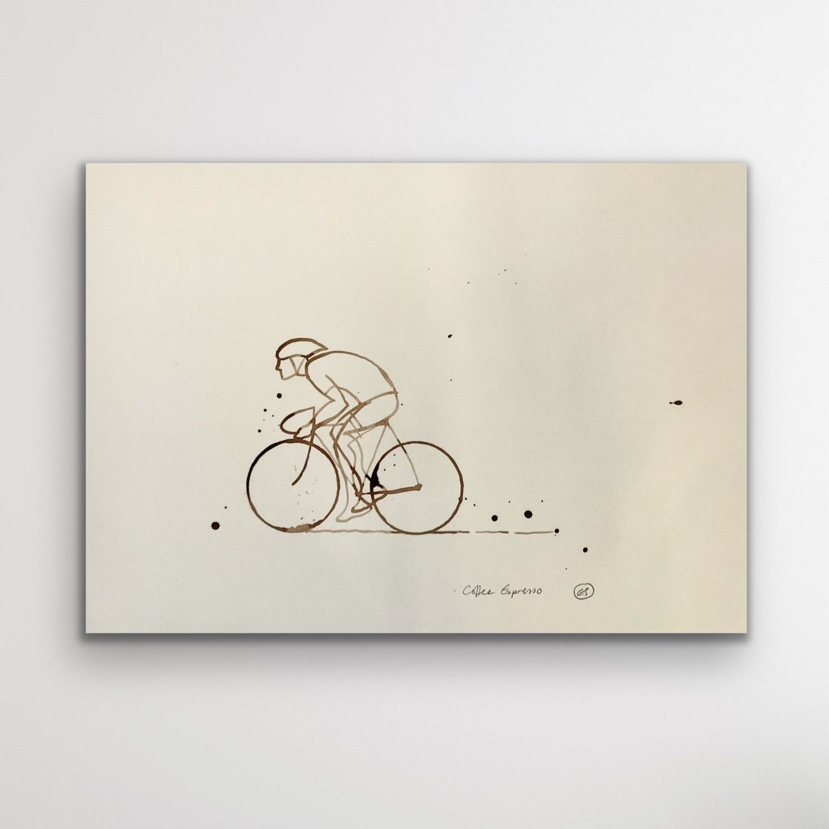 Coffee Espresso #15 is an original coffee on paper by artist Eliza Southwood. It features one cyclist painted in coffee, combining cycling culture with the love of a good coffee break. Additional information: Eliza Southwood Coffee Espresso #15 [2022] Coffee on Paper 42 H x 60 W x 0.1 D cm (16.54 x 23.62 x