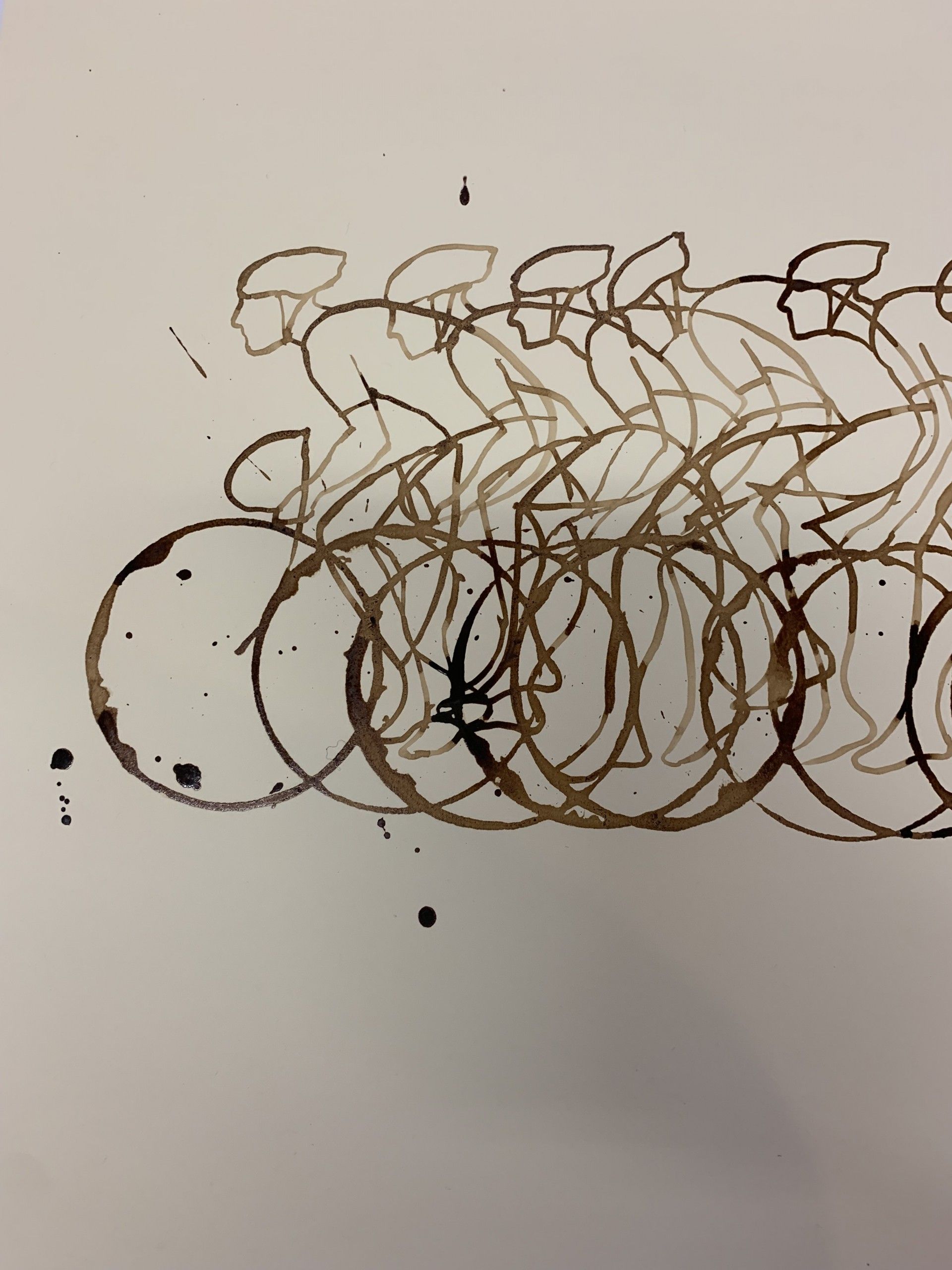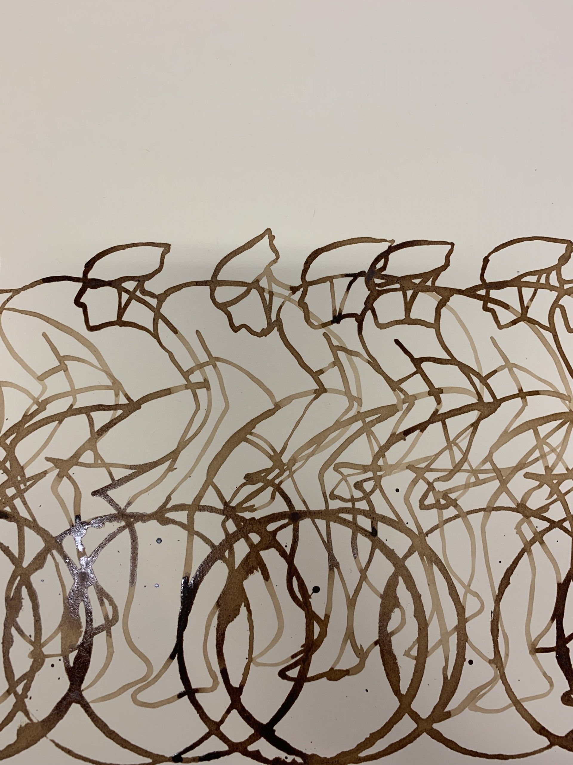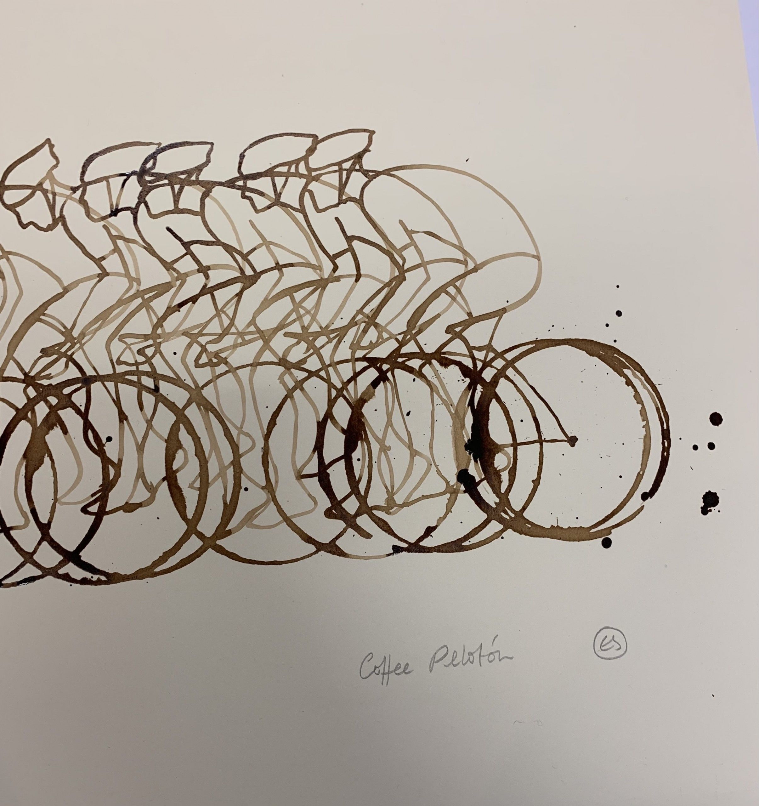 Coffee Peloton XXV is an original signed coffee painting on paper by Eliza Southwood of a group of cyclists racing. This piece is a part of Eliza's coffee peloton series.