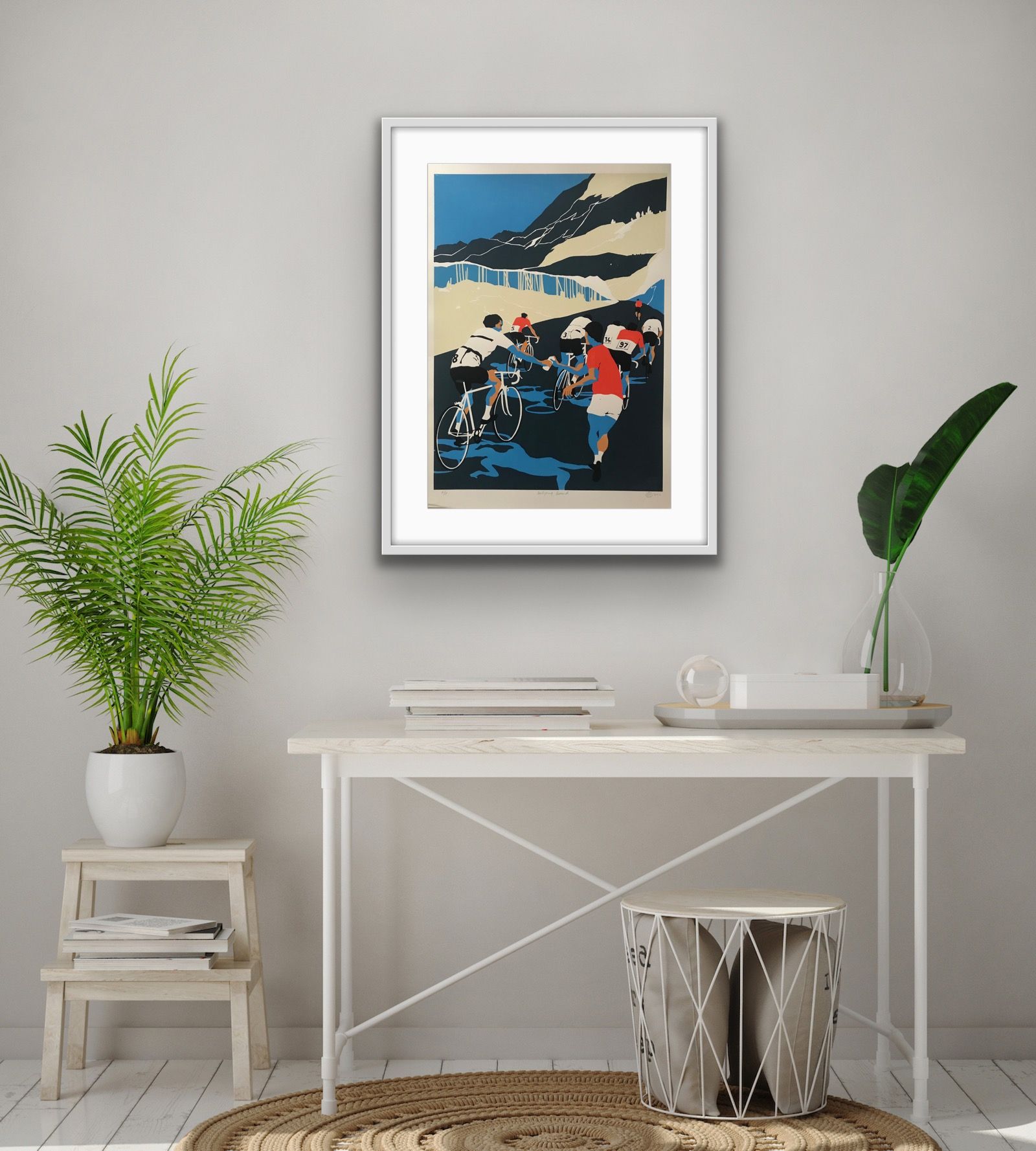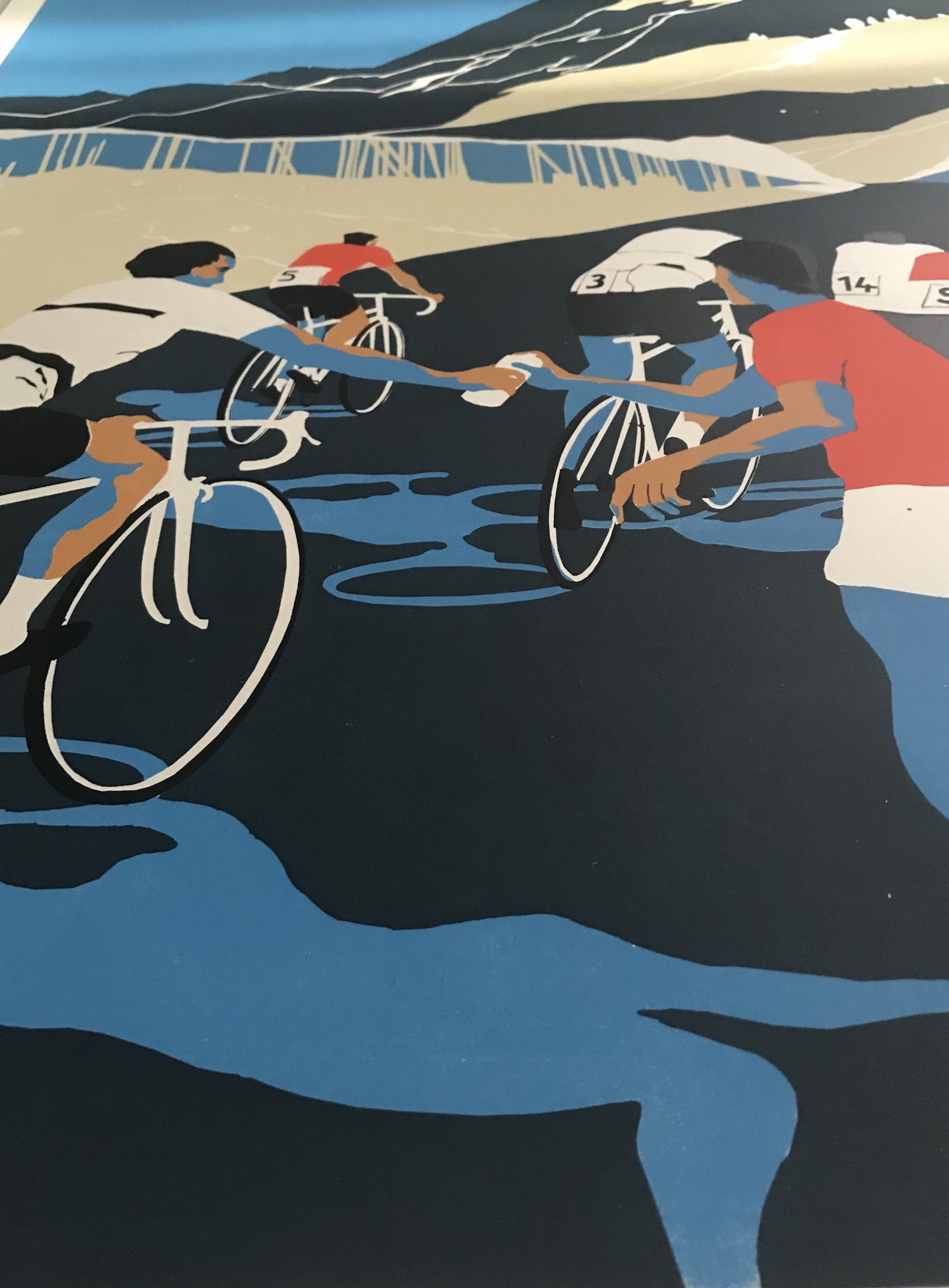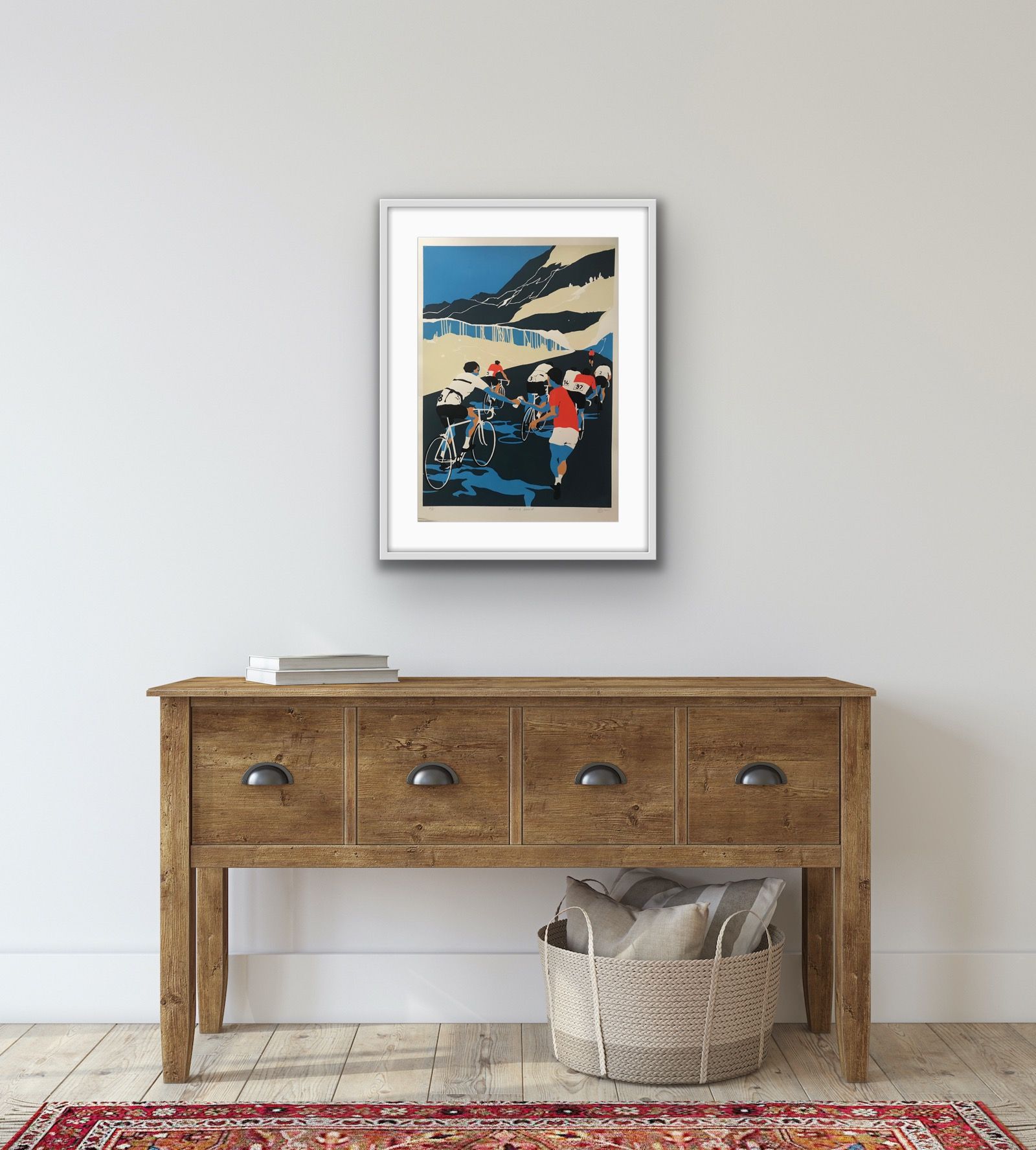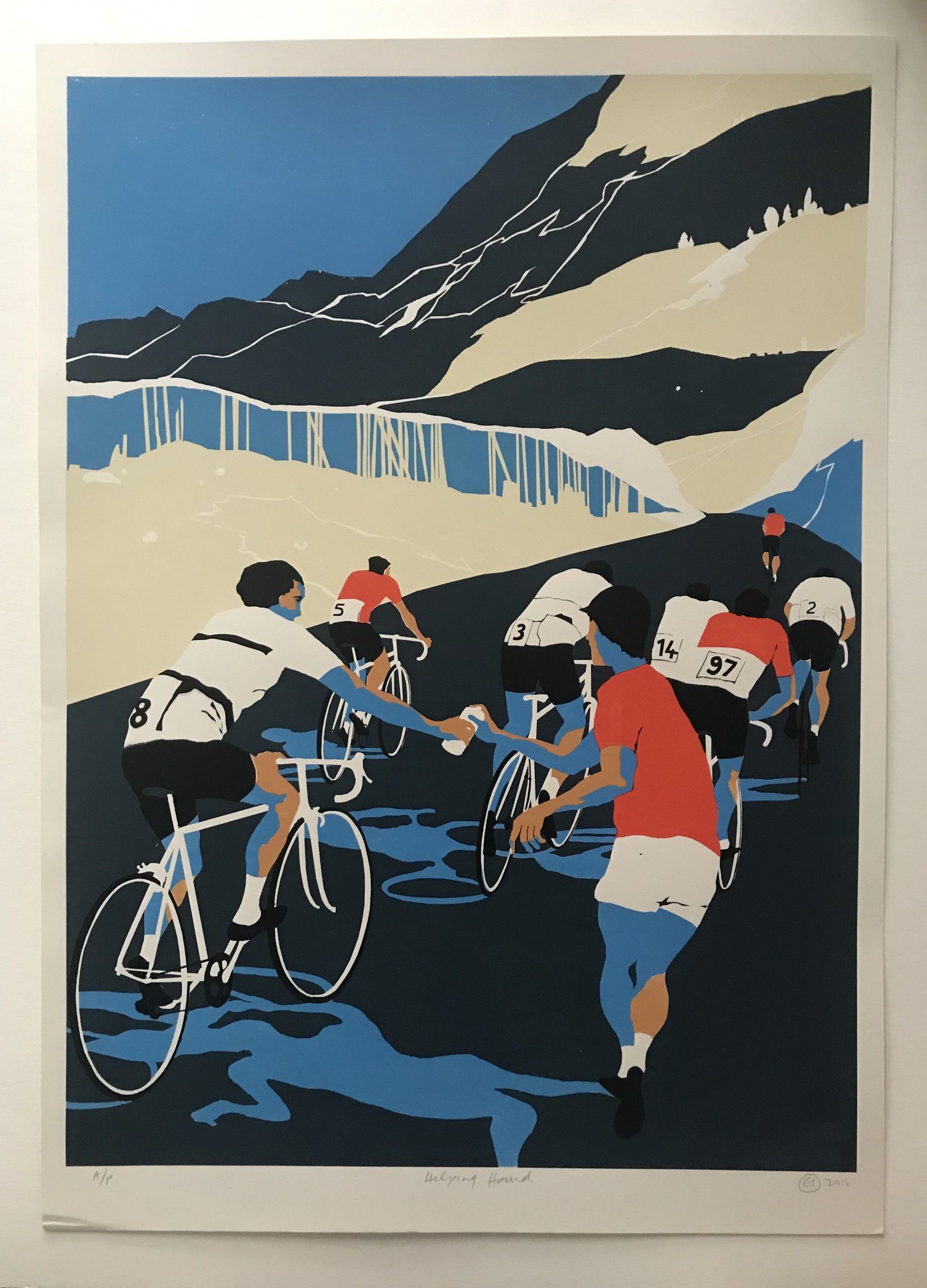 Eliza Southwood Helping Hand Limited Edition Screen Print Edition of 25 and an Artists Proof Image Size: H 64cm x W 47cm Sheet Size: H 70cm x W 50cm x D 0.5cm Signed Sold Unframed Eliza Southwood cycling prints available for sale with Wychwood art online and in our Deddington art gallery. Eliza Southwood is a former architect,