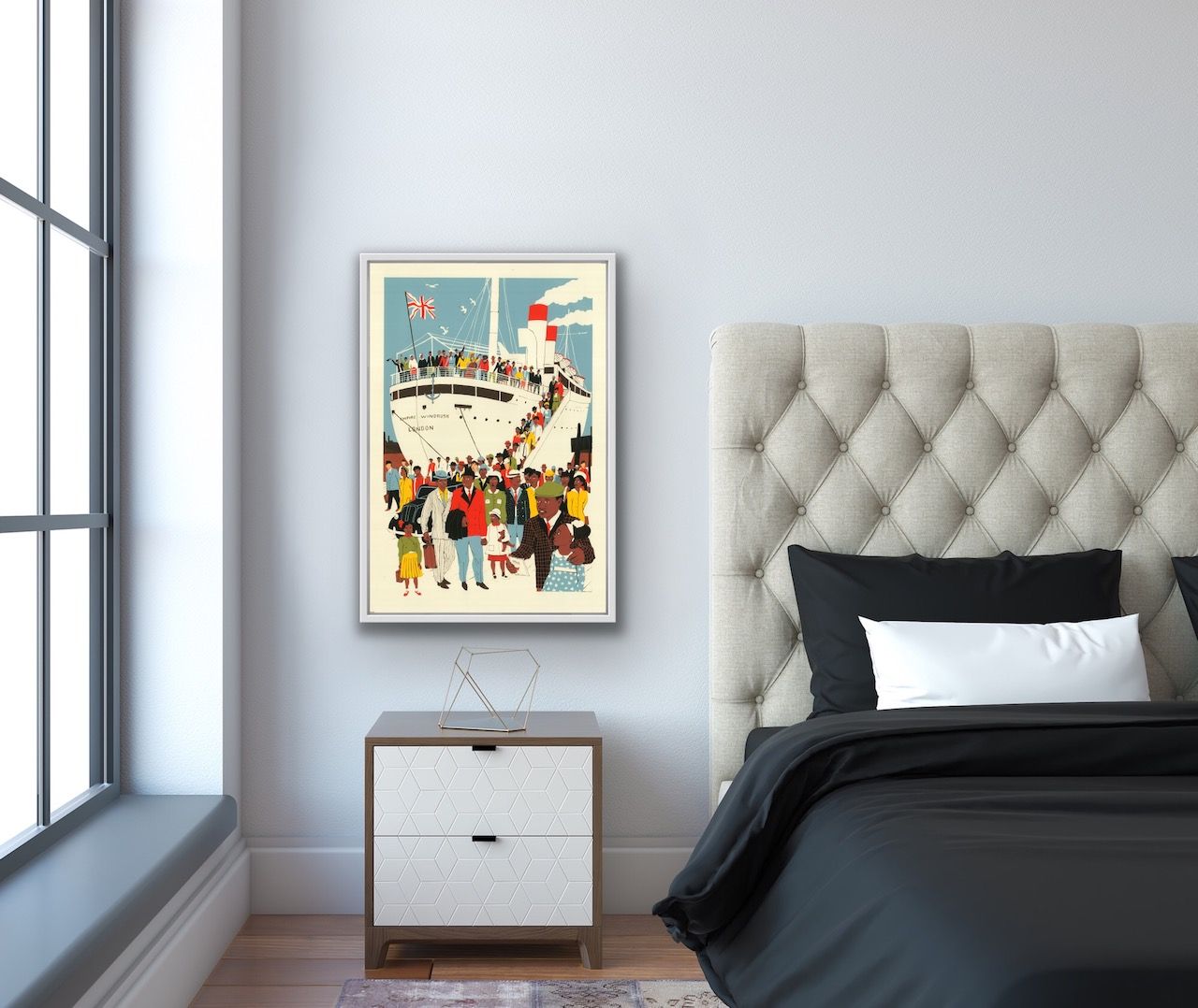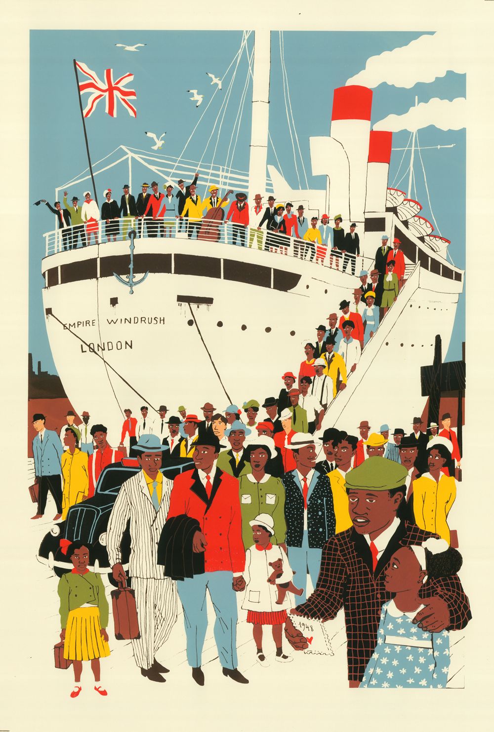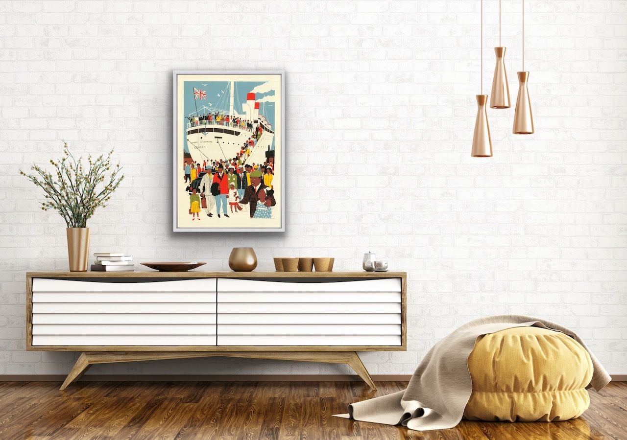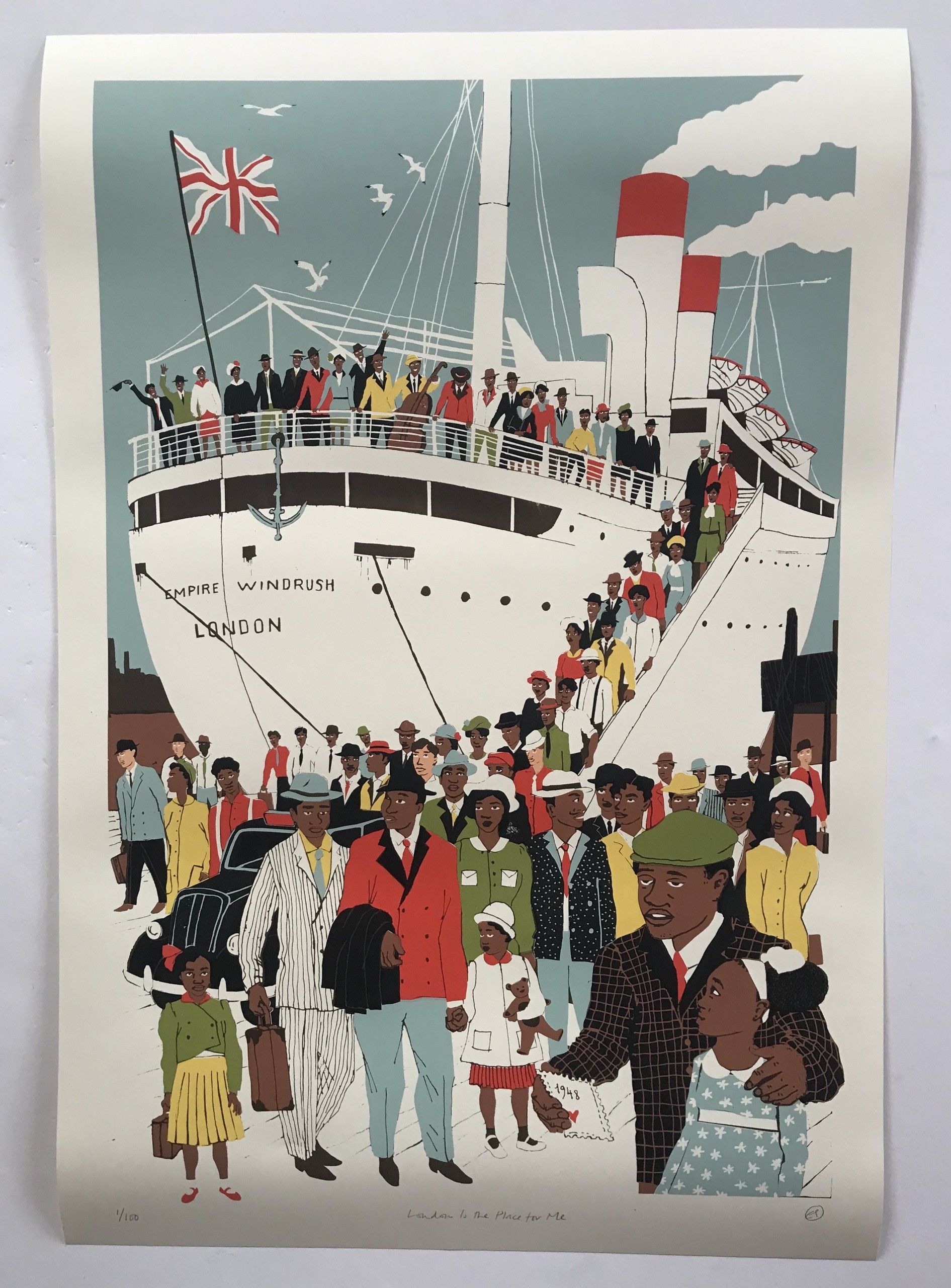 Eliza Southwood London is the Place for Me Limited Edition Screen Print Edition of 100 Sheet Size: H 88cm x W 60cm Image Size: H 79cm x W 52cm Signed and Numbered Sold Unframed This print depicting the Windrush arriving at Tilbury Docks recently won the Poster Prize for Illustration at the London Transport Museum. The print is