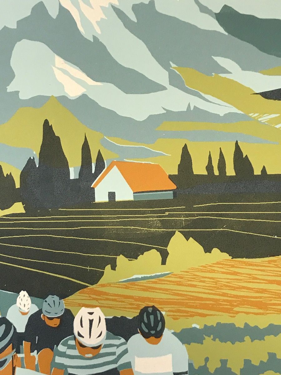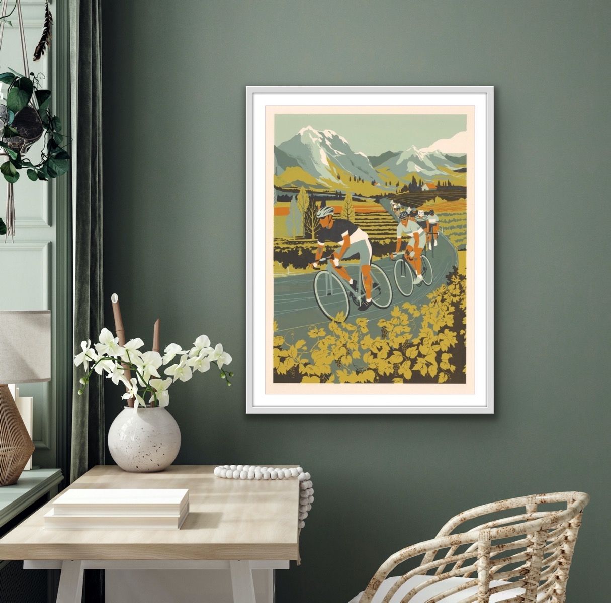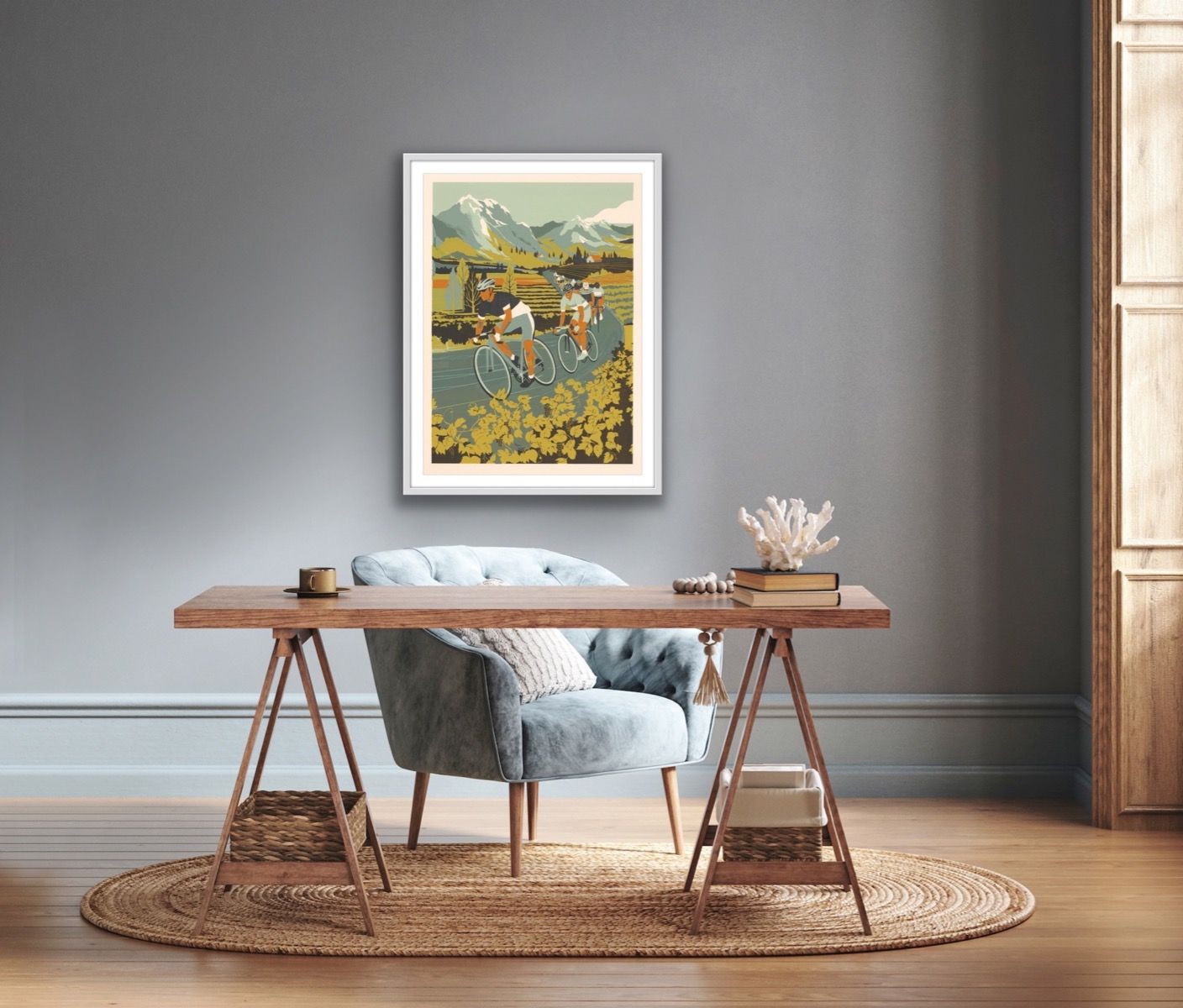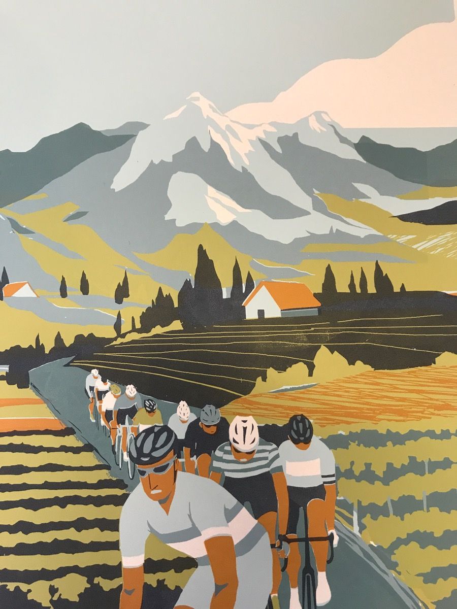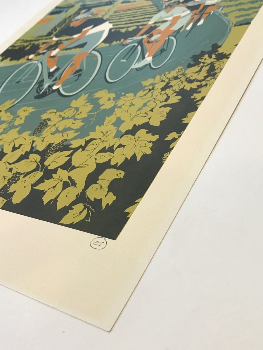 Eliza Southwood's Vineyard cyclists is a limited edition print. Eliza Southwood’s beautiful screen print is signed and numbered and is an edition of 40. Inspired by the French Alps. Sold unmounted and unframed. ADDITIONAL INFORMATION:Vineyard Cyclists by Eliza Southwood Silk Screen print on Paper (270 gsm Context Birch paper)Handmade print - 5 colours