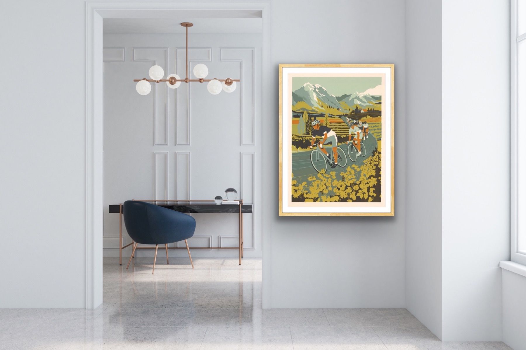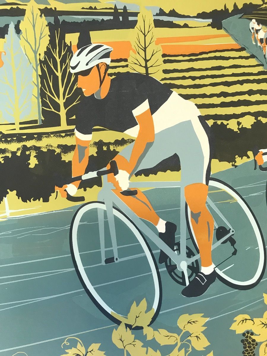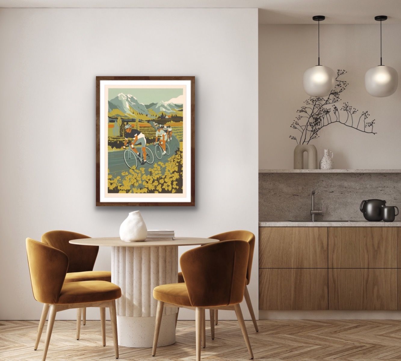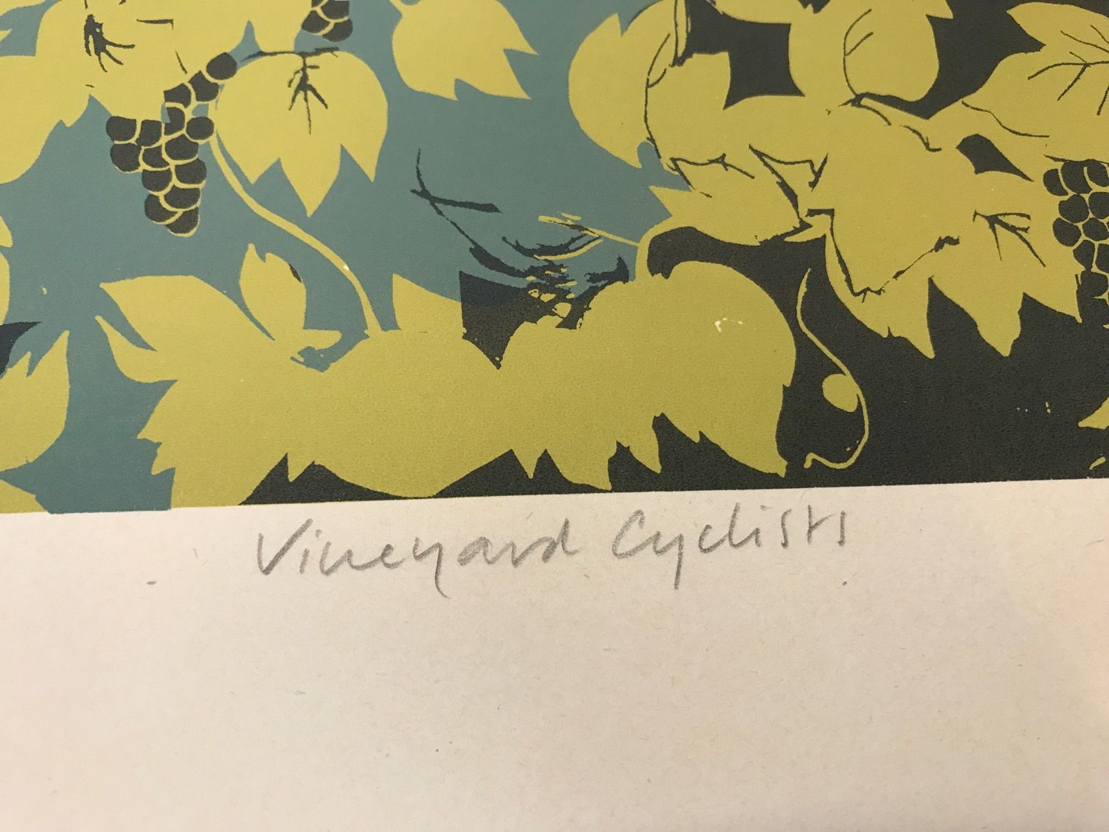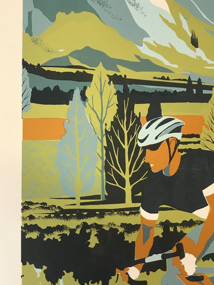 Eliza Southwood's Vineyard cyclists is a limited edition print. Eliza Southwood’s beautiful screen print is signed and numbered and is an edition of 40. Inspired by the French Alps. Sold unmounted and unframed. ADDITIONAL INFORMATION:Vineyard Cyclists by Eliza Southwood Silk Screen print on Paper (270 gsm Context Birch paper)Handmade print - 5 colours