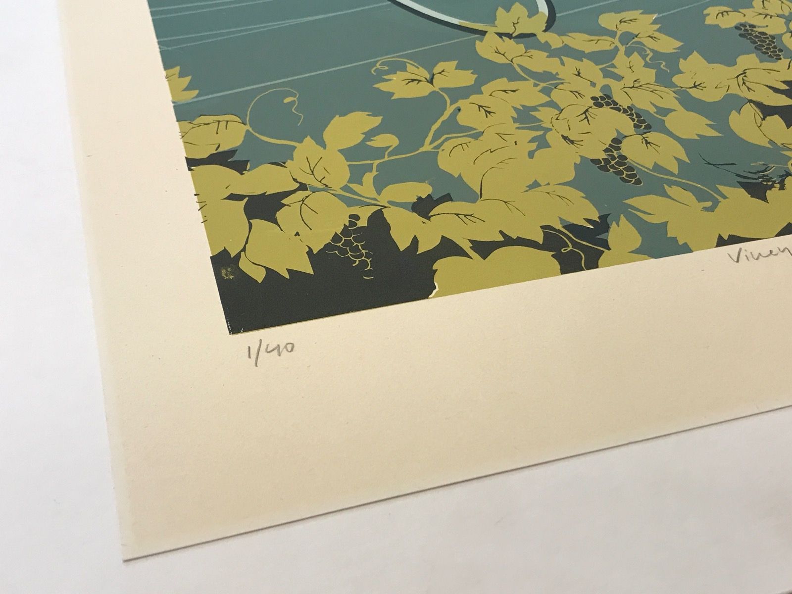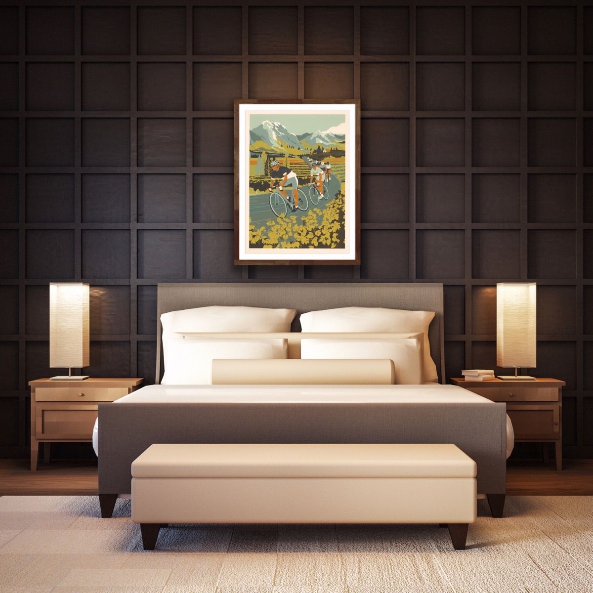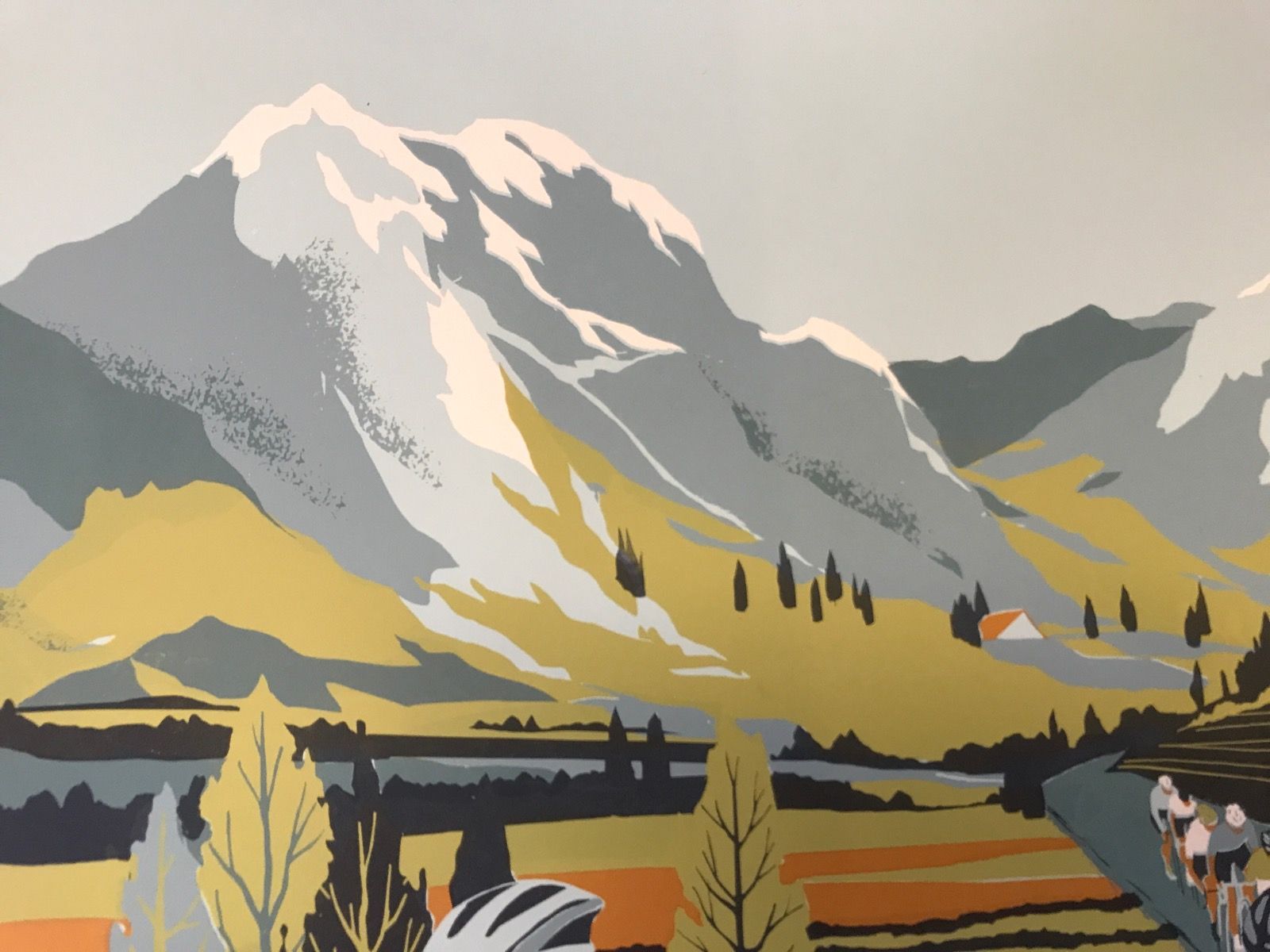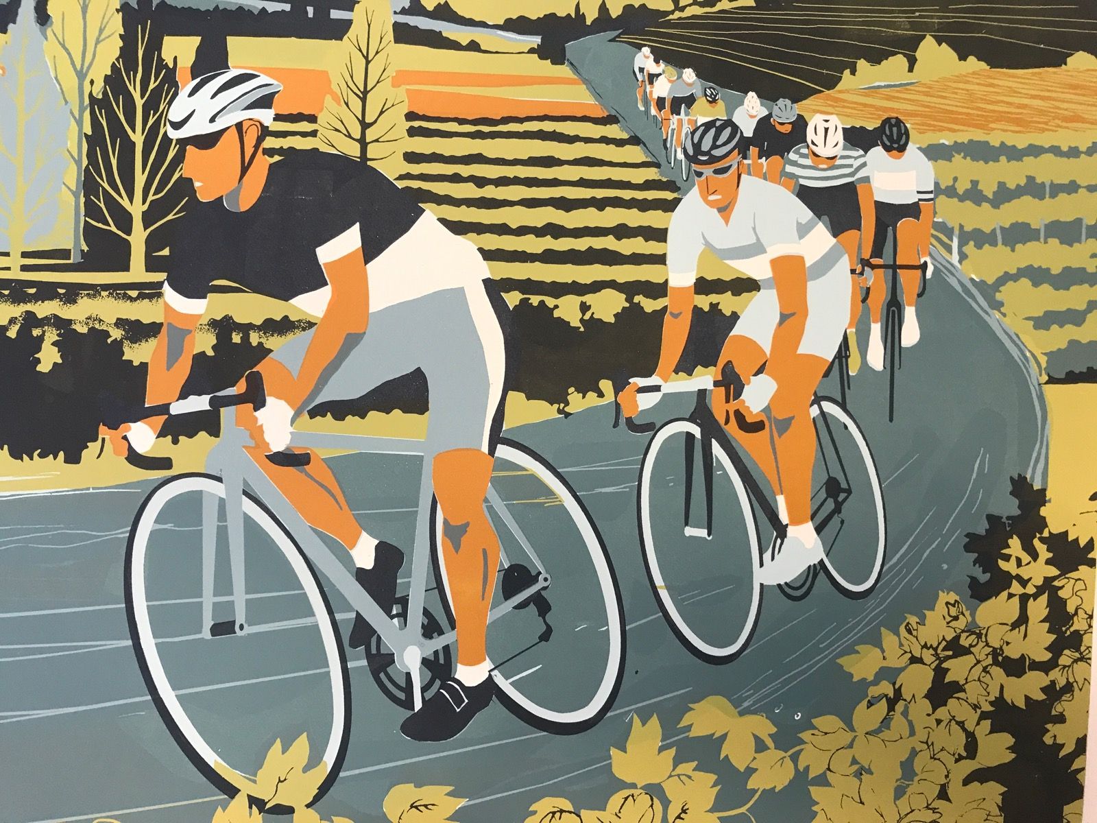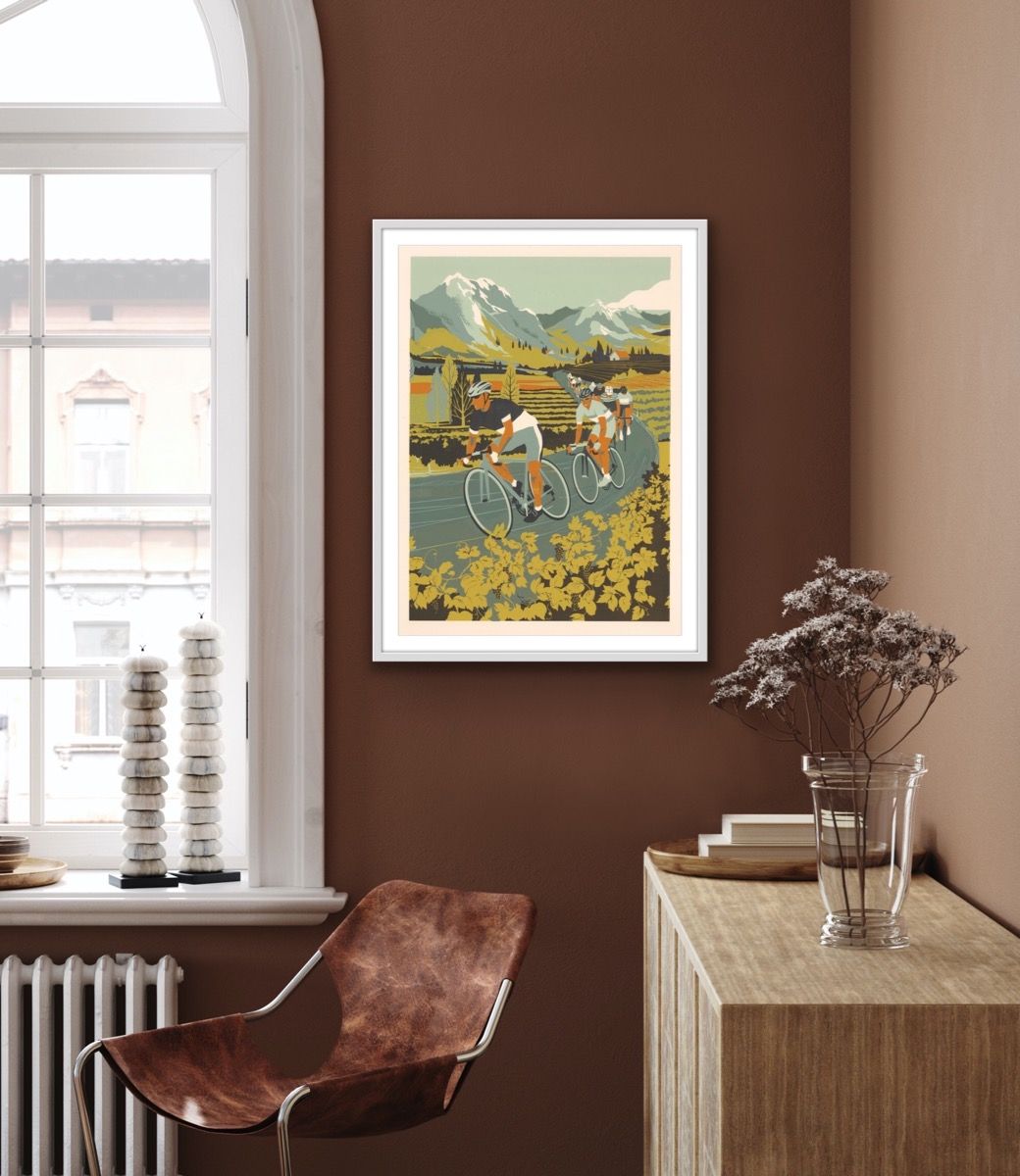 Eliza Southwood's Vineyard cyclists is a limited edition print. Eliza Southwood’s beautiful screen print is signed and numbered and is an edition of 40. Inspired by the French Alps. Sold unmounted and unframed. ADDITIONAL INFORMATION:Vineyard Cyclists by Eliza Southwood Silk Screen print on Paper (270 gsm Context Birch paper)Handmade print - 5 colours